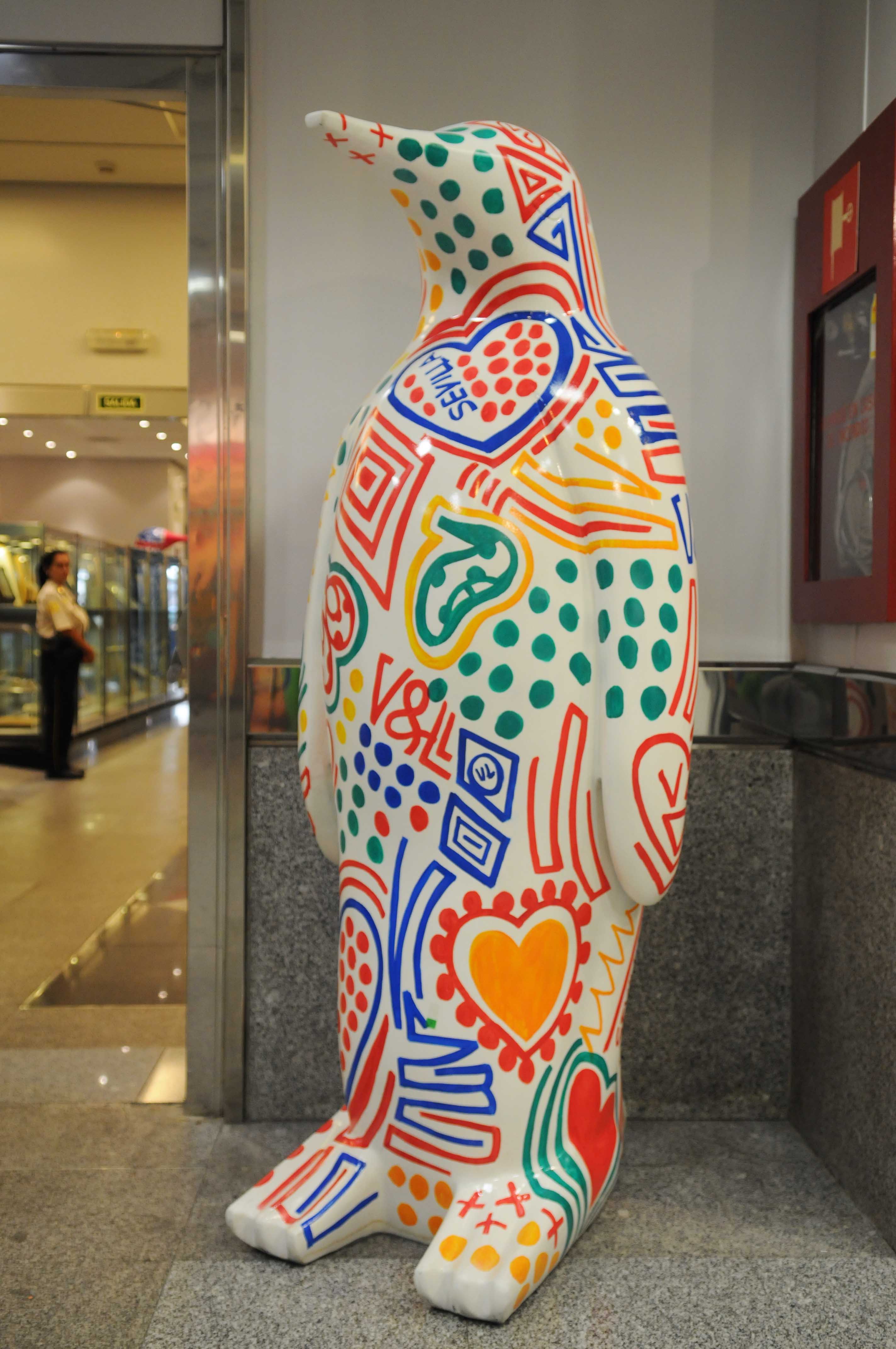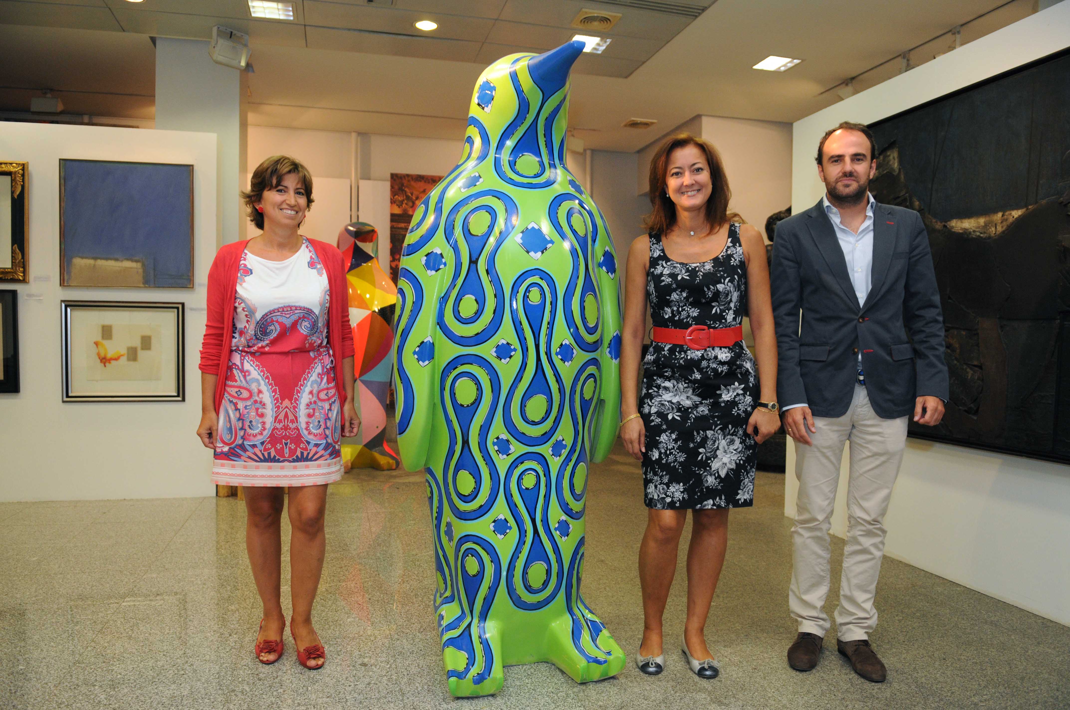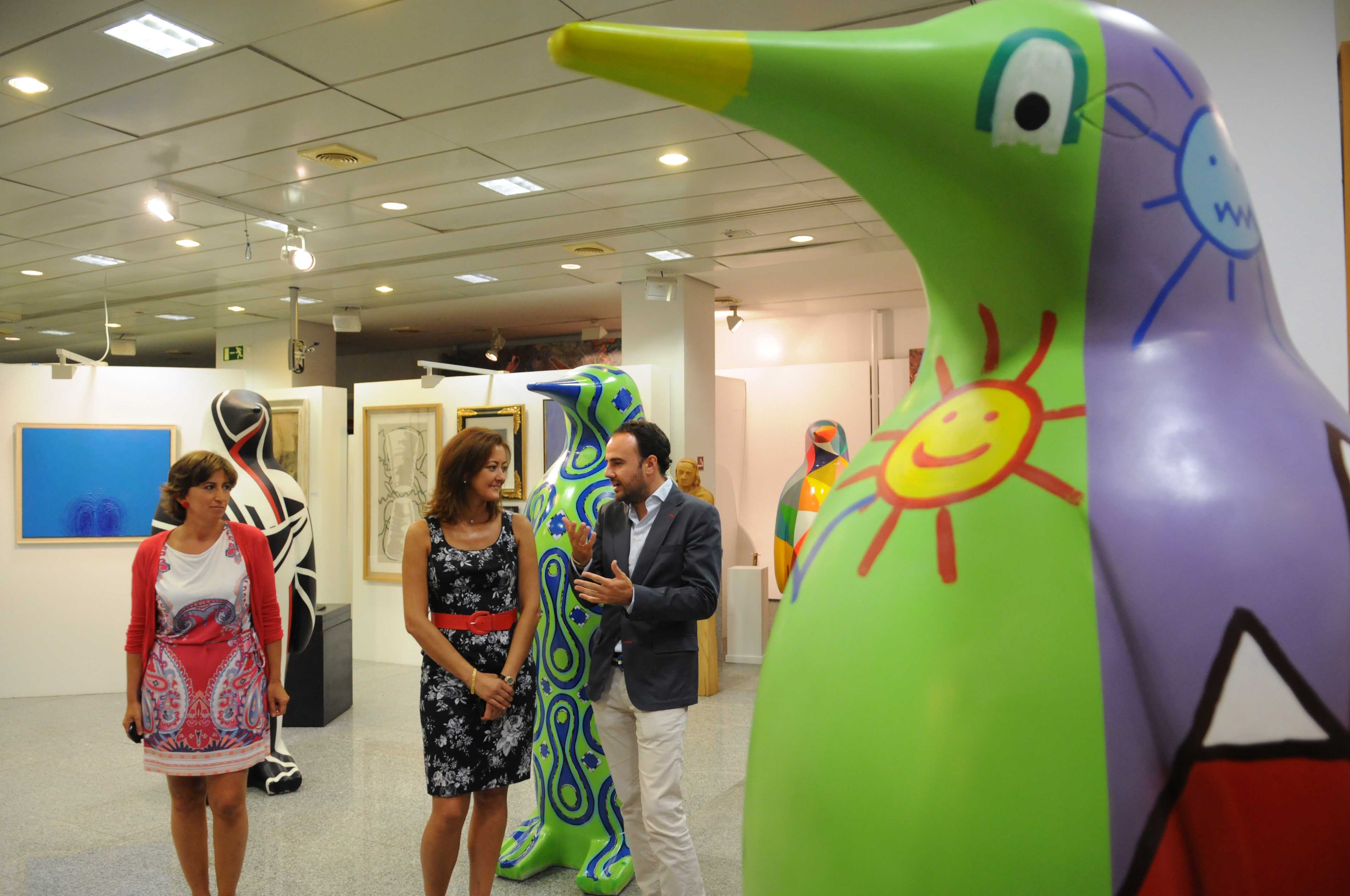 Imágenes de los pingüinos solidarios que salen a subasta, a cuya exposición ha asistido hoy la delegada de Familia y Sociales, Dolores Navarro. El de la foto 3 es el que ‘se marchó de copas’ y ha tenido que ser restaurado.