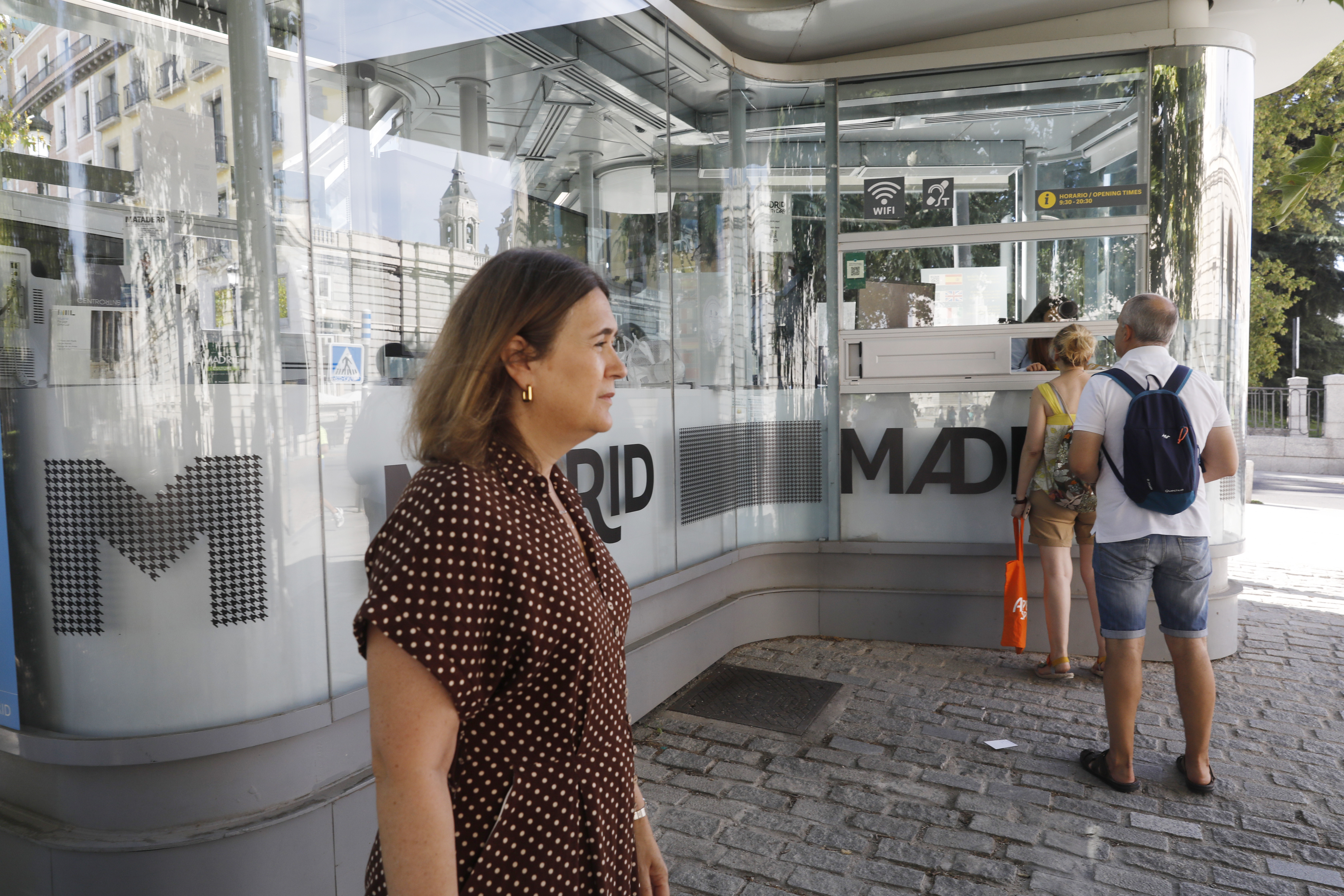 La delegada de Cultura, Turismo y Deporte, Marta Rivera de la Cruz, ha visitado este viernes el Punto de Información Turística del Ayuntamiento situado en el entorno del Palacio Real, desde el que ha destacado la calidad de los servicios de atención al visitante de la capital y “el gran potencial cultural y turístico” del renovado eje Bailén-Plaza de España, que desde este verano cuenta con un nuevo museo, la Galería de las Colecciones Reales, y dos nuevos accesos a los monumentales Jardines del Campo del Moro.