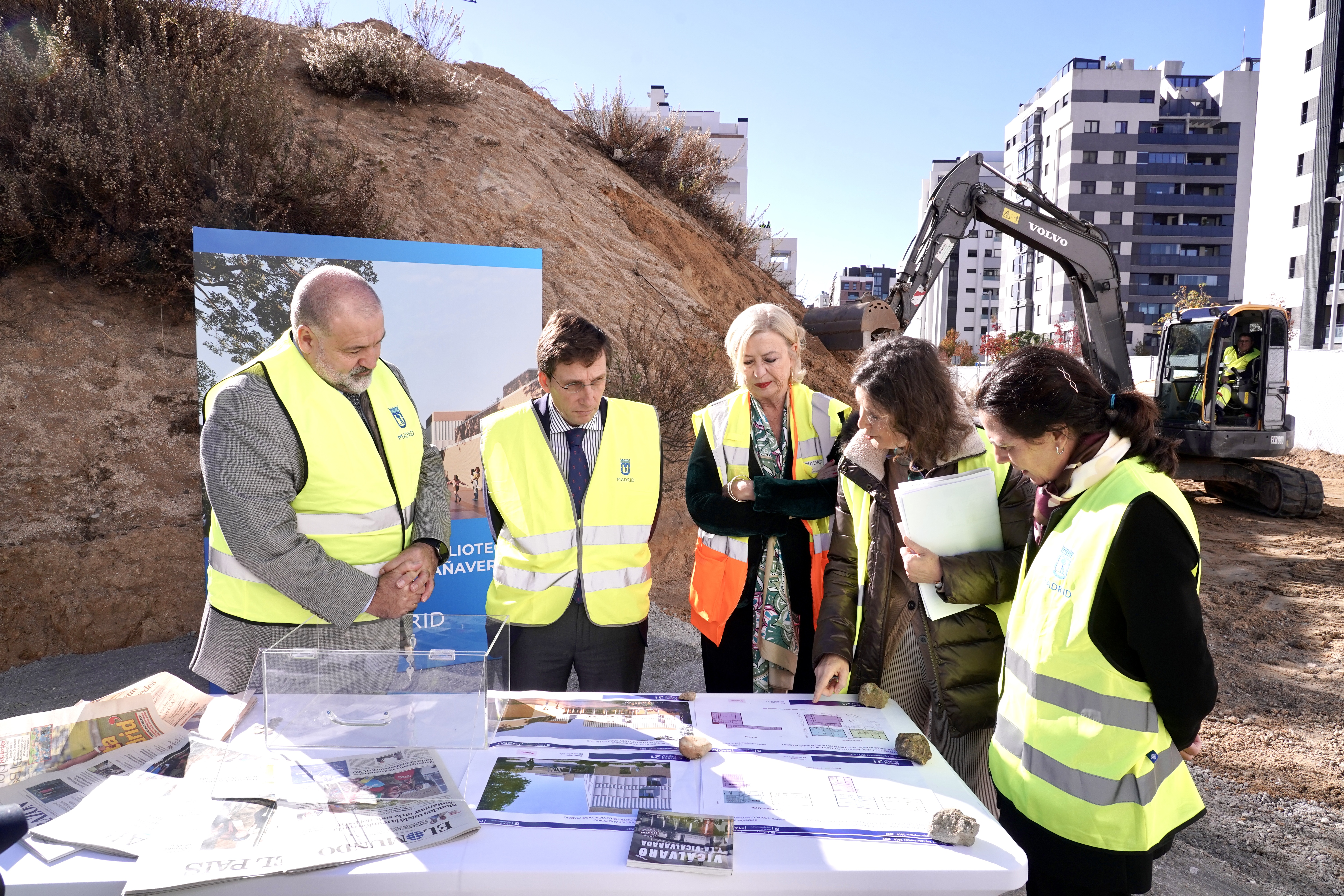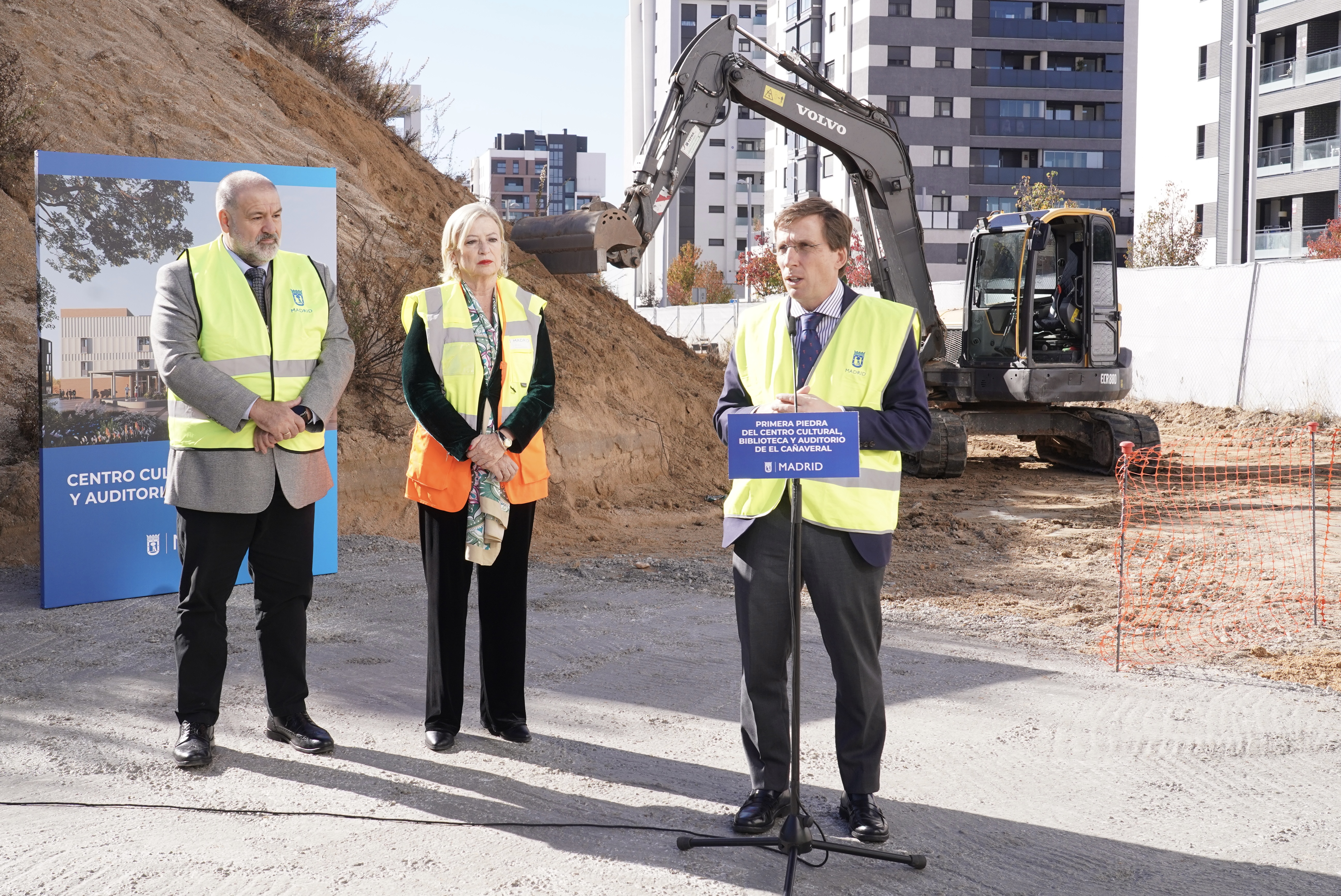 El alcalde de Madrid, José Luis Martínez-Almeida, acompañado de la delegada de Obras y Equipamientos, Paloma García Romero, y el concejal de Vicálvaro, Ángel Ramos, ha colocado esta mañana la primera piedra del nuevo centro cultural con biblioteca y auditorio que el Ayuntamiento va a construir en El Cañaveral. Los trabajos, que se extenderán hasta mediados de 2027, suponen una inversión municipal de 10,7 millones de euros.