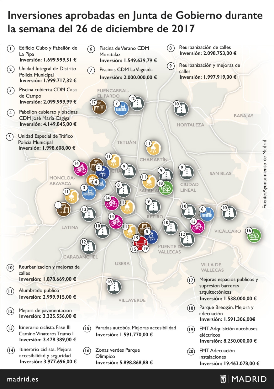 La Junta de Gobierno del Ayuntamiento de Madrid ha aprobado esta semana numerosas inversiones para ejecutar durante el año 2018. Los proyectos van desde el arreglo y reforma de piscinas y centros deportivos, pasando por reurbanizaciones y supresión de barreras, a la construcción de itinerarios ciclistas.