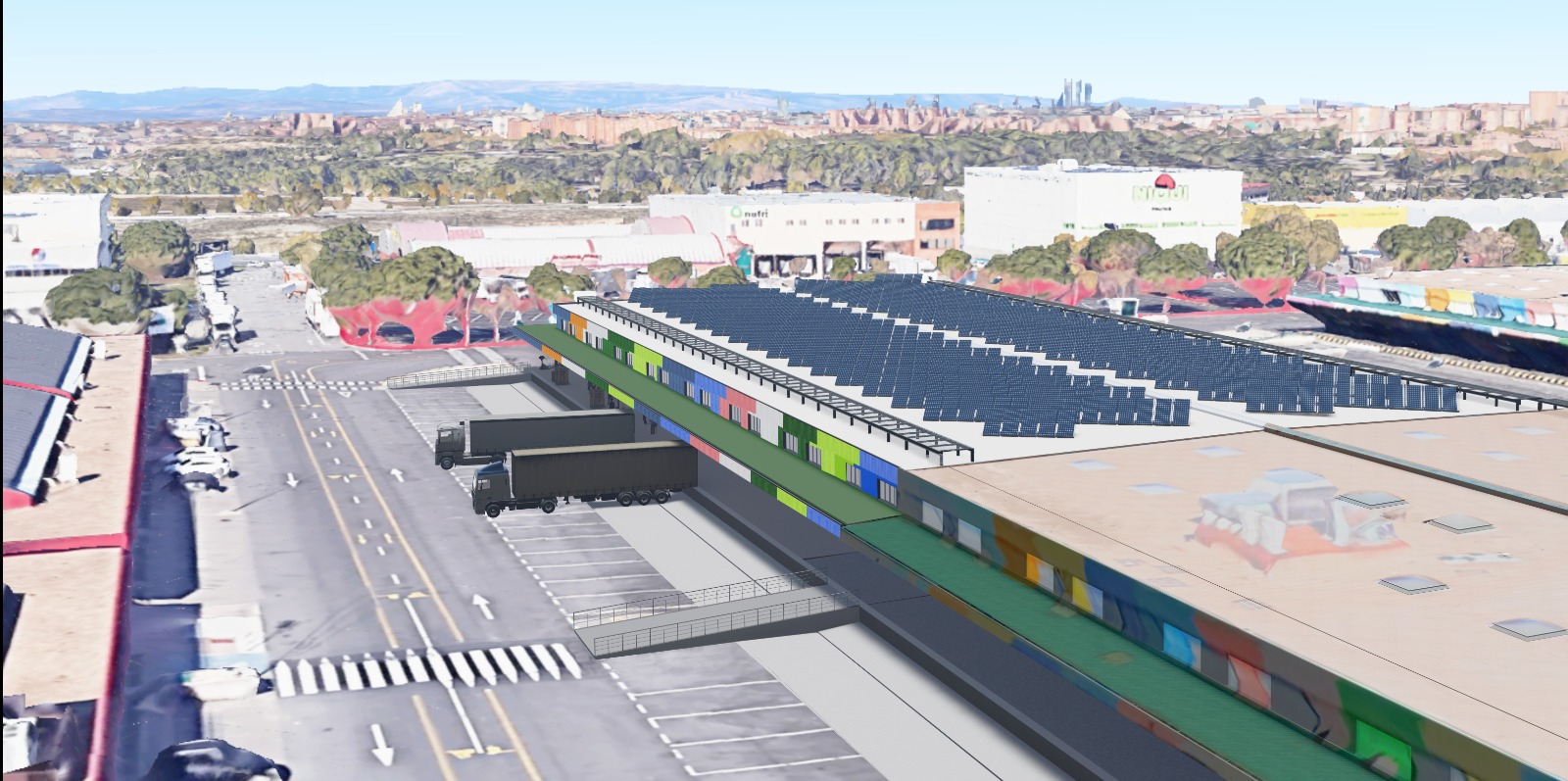 Diseñado por el equipo profesional de Mercamadrid, se plantean nuevas soluciones constructivas que mejoran la eficiencia y sostenibilidad medioambiental, reducen plazos e incorporan nuevas opciones y soluciones para las empresas. Así, se facilita el acceso a las cubiertas, a la maquinaria, e incluye la instalación de una planta fotovoltaica de 500 placas solares, capaz de generar una potencia pico de 200 kWh, equivalente a una generación de 600 kWh al día o 18.000 kWh al mes.