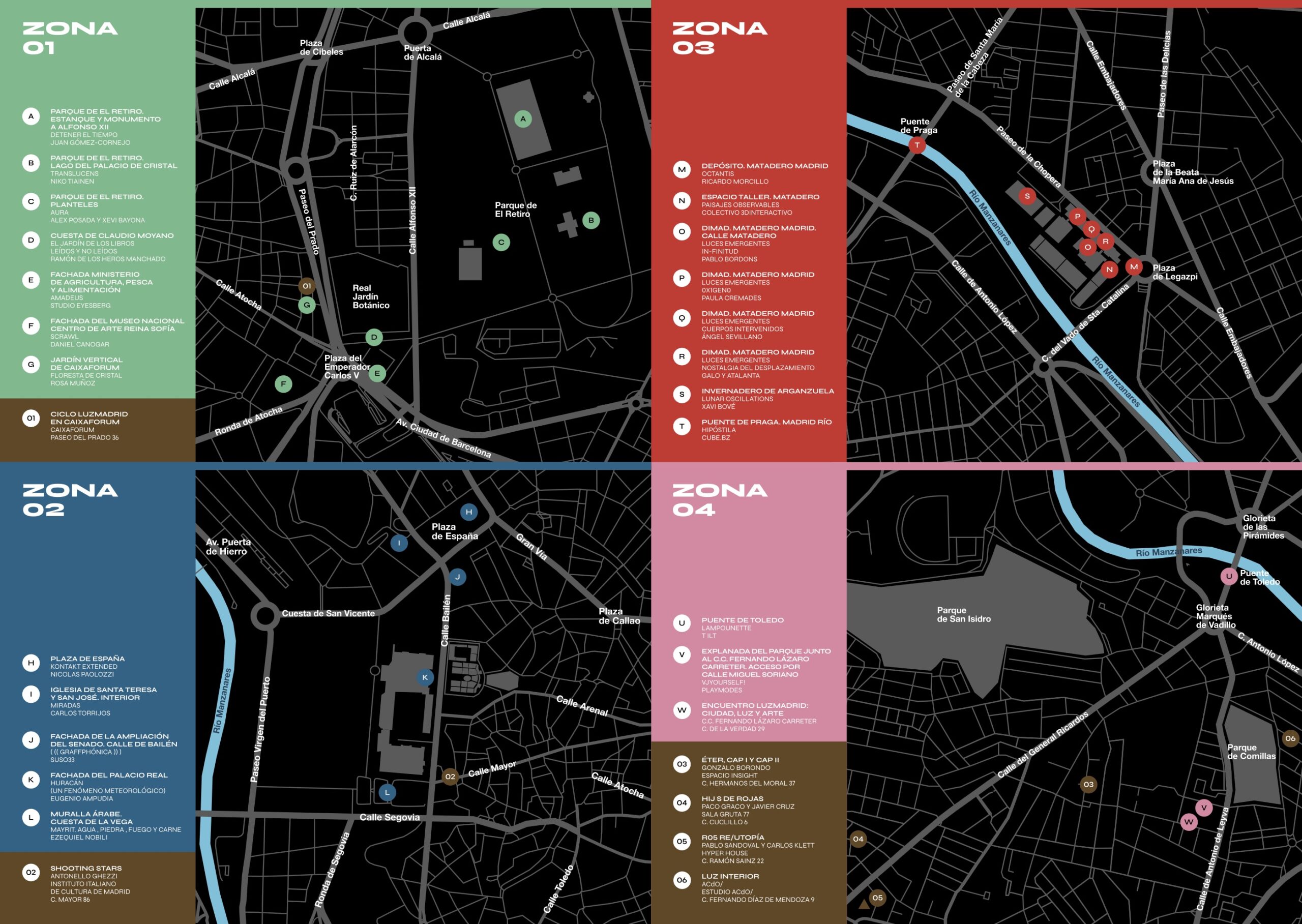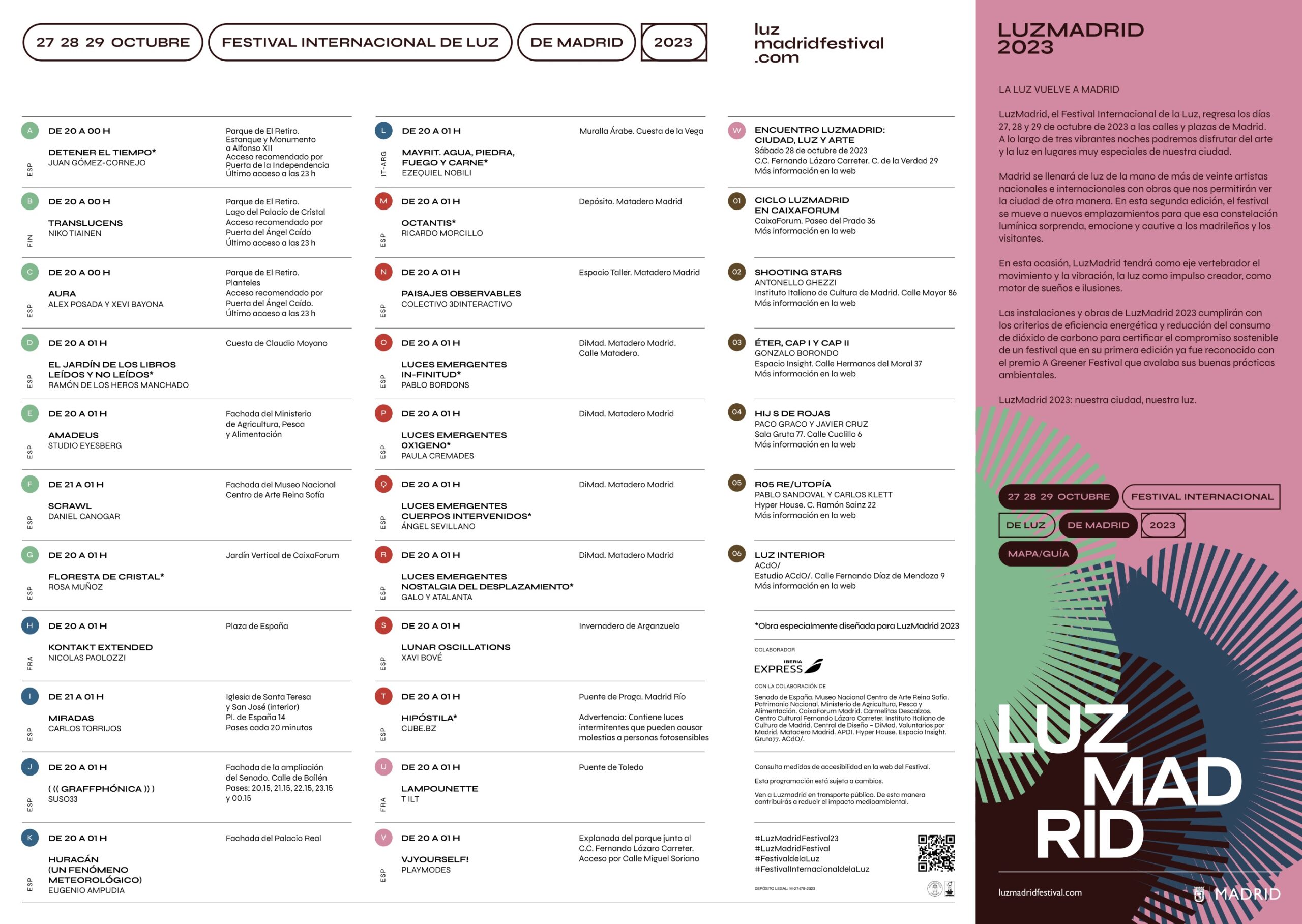 La segunda edición de LuzMadrid, el Festival Internacional de Luz de Madrid, estrenará seis obras ideadas y producidas específicamente por diferentes artistas para espacios singulares de la ciudad: el monumento de Alfonso XII en el parque de El Retiro, la Cuesta de Claudio Moyano, la muralla árabe, el jardín vertical de CaixaForum, el depósito de Matadero Madrid y el Puente de Praga. Podrán verse por primera y única vez durante los tres días de celebración de la gran cita cultural, del 27 al 29 de octubre, de manera gratuita, entre las 20:00 y la 1:00 horas.
