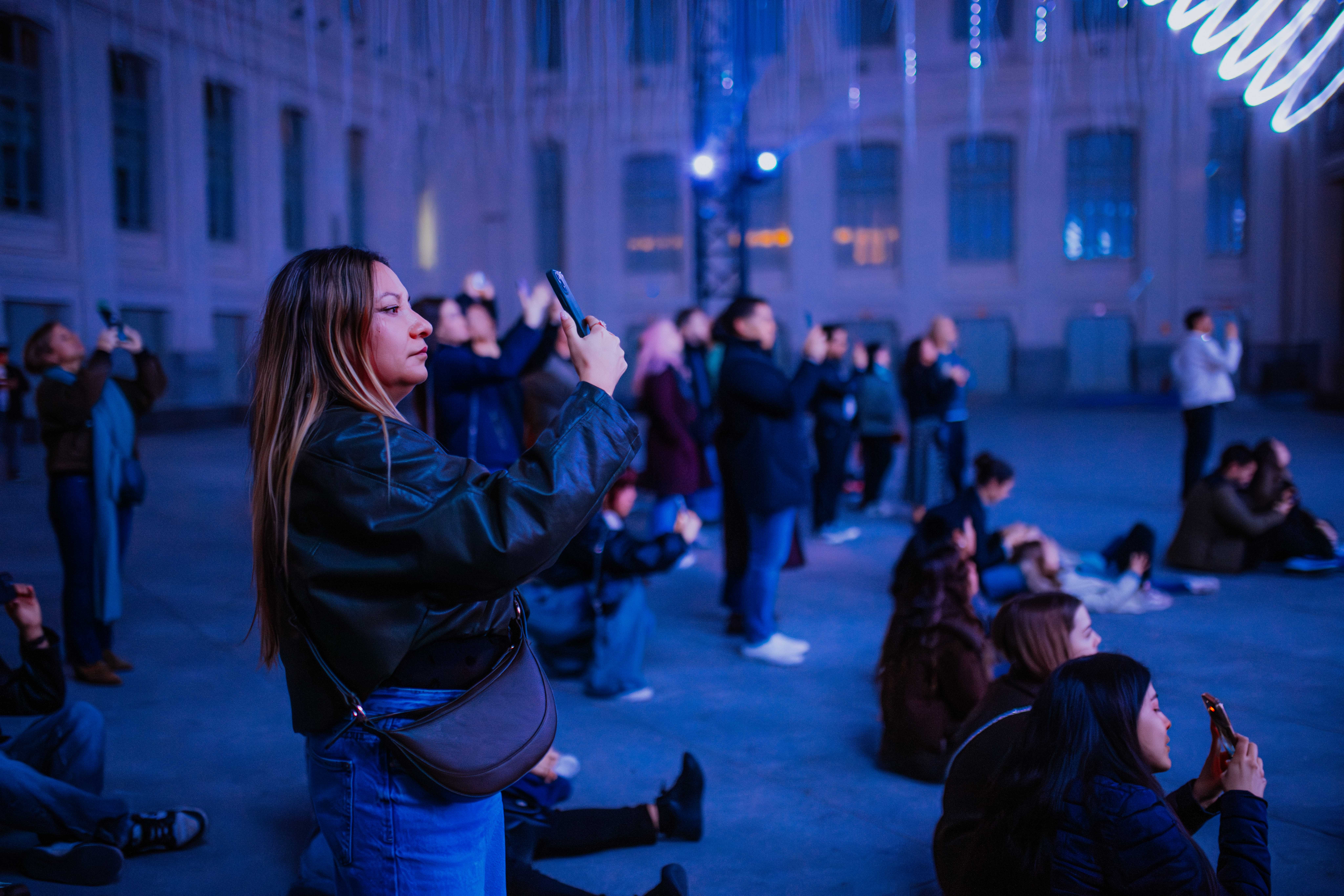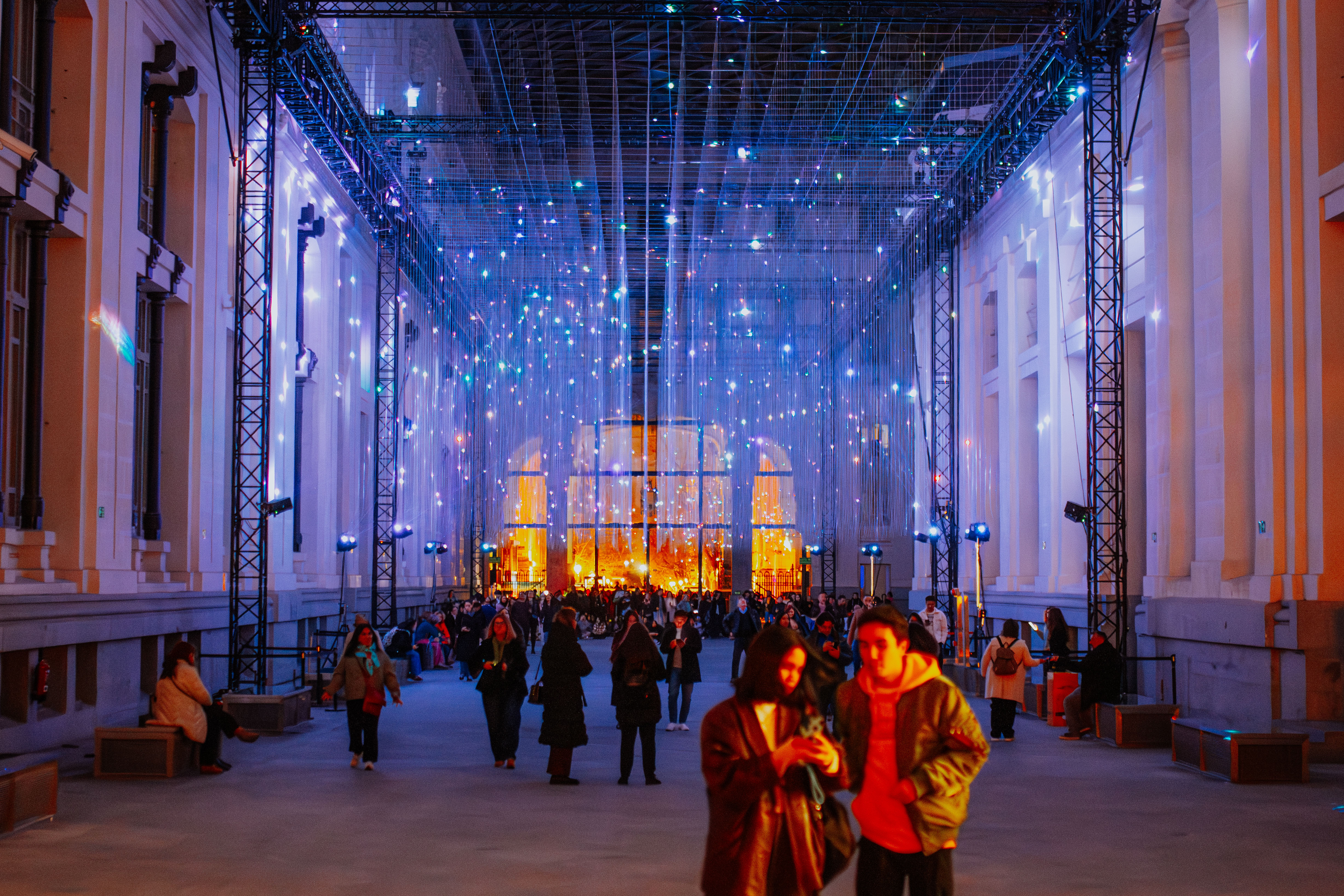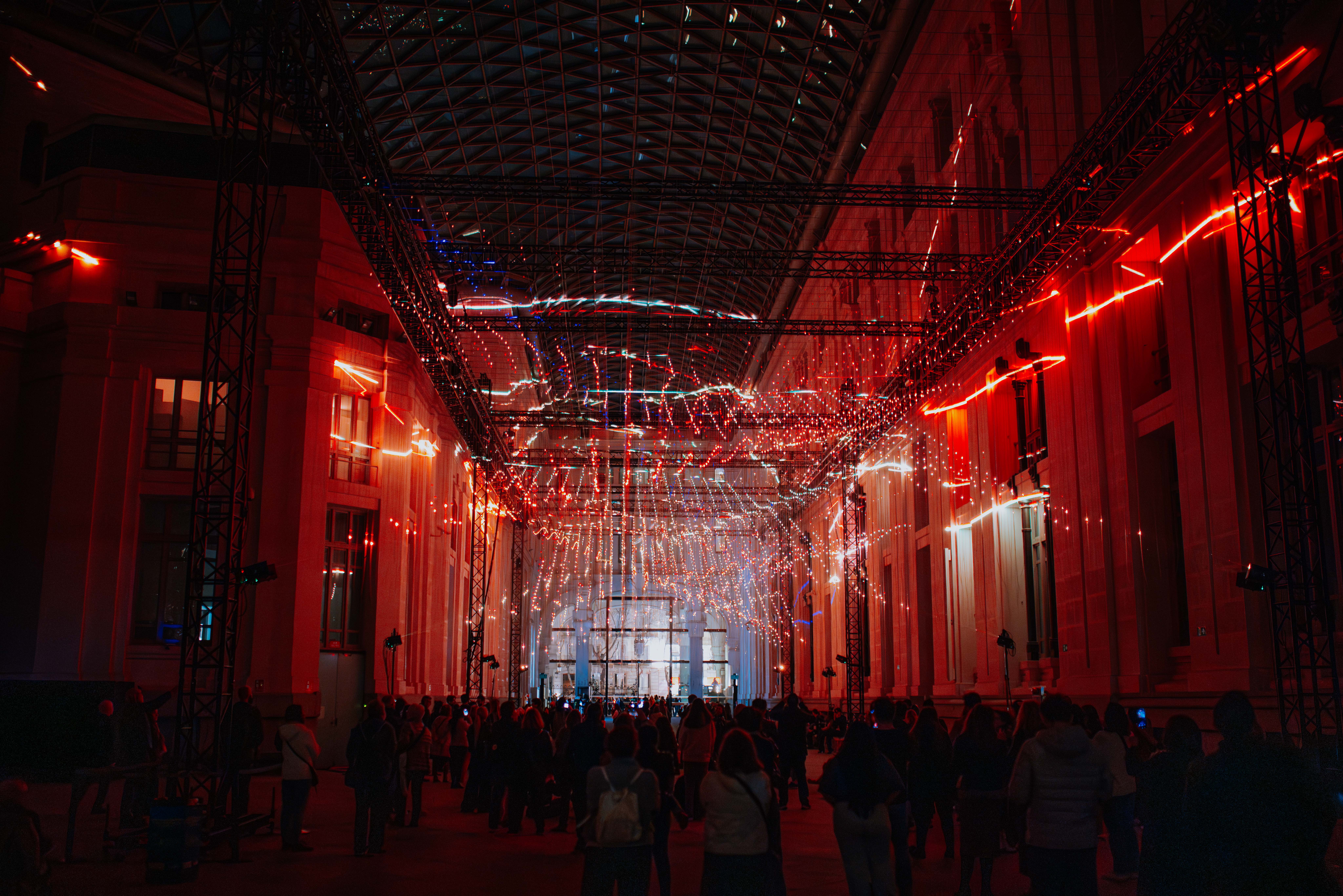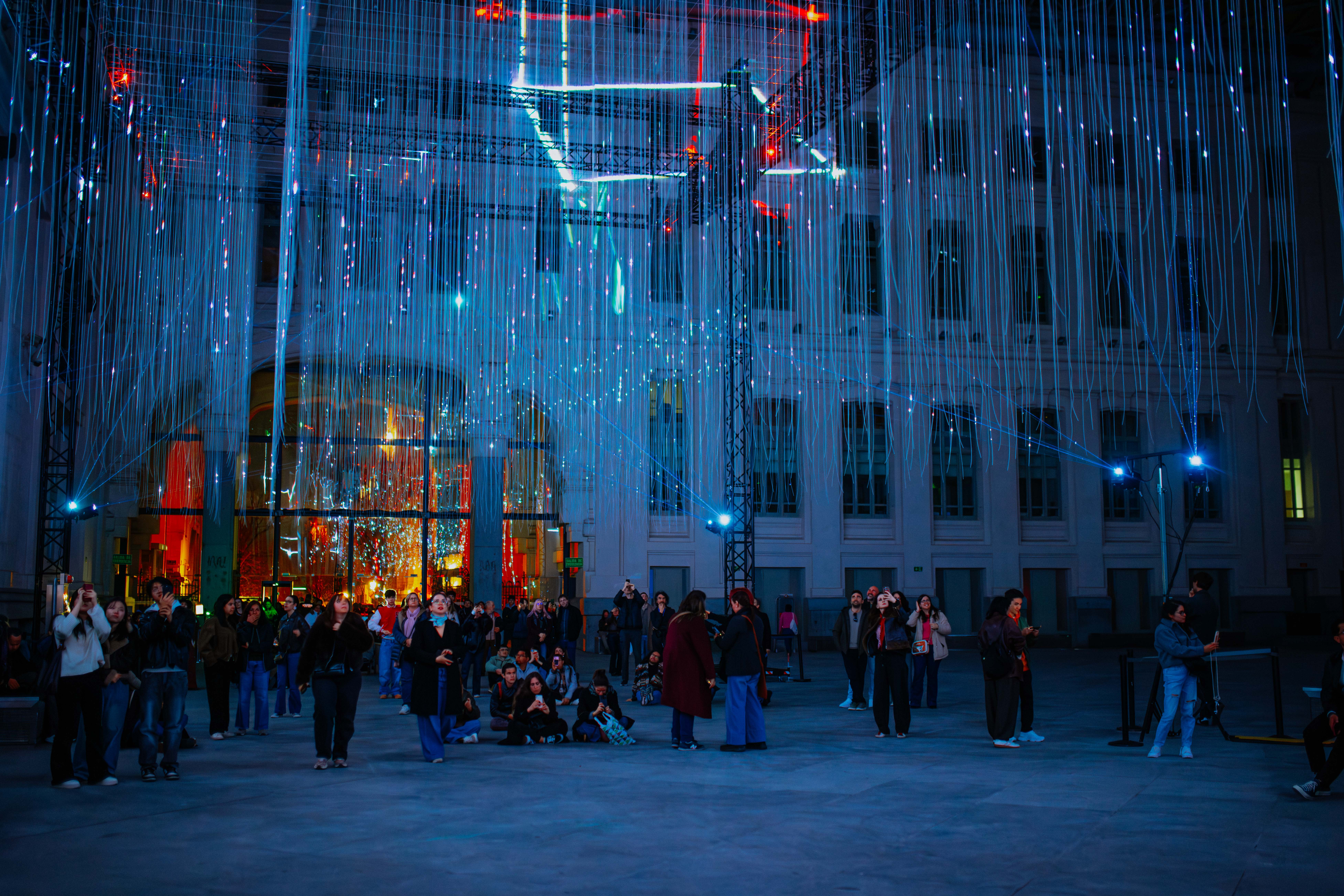 La Galería de Cristal del Palacio de Cibeles acogerá a lo largo de la noche la instalación envolvente Firmamento. La pieza, inmersiva e interactiva, pone en valor un elemento central del imaginario y del paisaje urbano de Madrid: el cielo. Se compone de cuerdas verticales que descienden del techo, creando una estructura geométrica que evoca un fragmento del cosmos llegado a la Tierra. Concebida especialmente por Quiet Ensemble, en colaboración con el Observatorio Gravitacional Europeo (EGO), integra el cielo de la ciudad en su corazón institucional, dando lugar a una vivencia sensorial compartida.