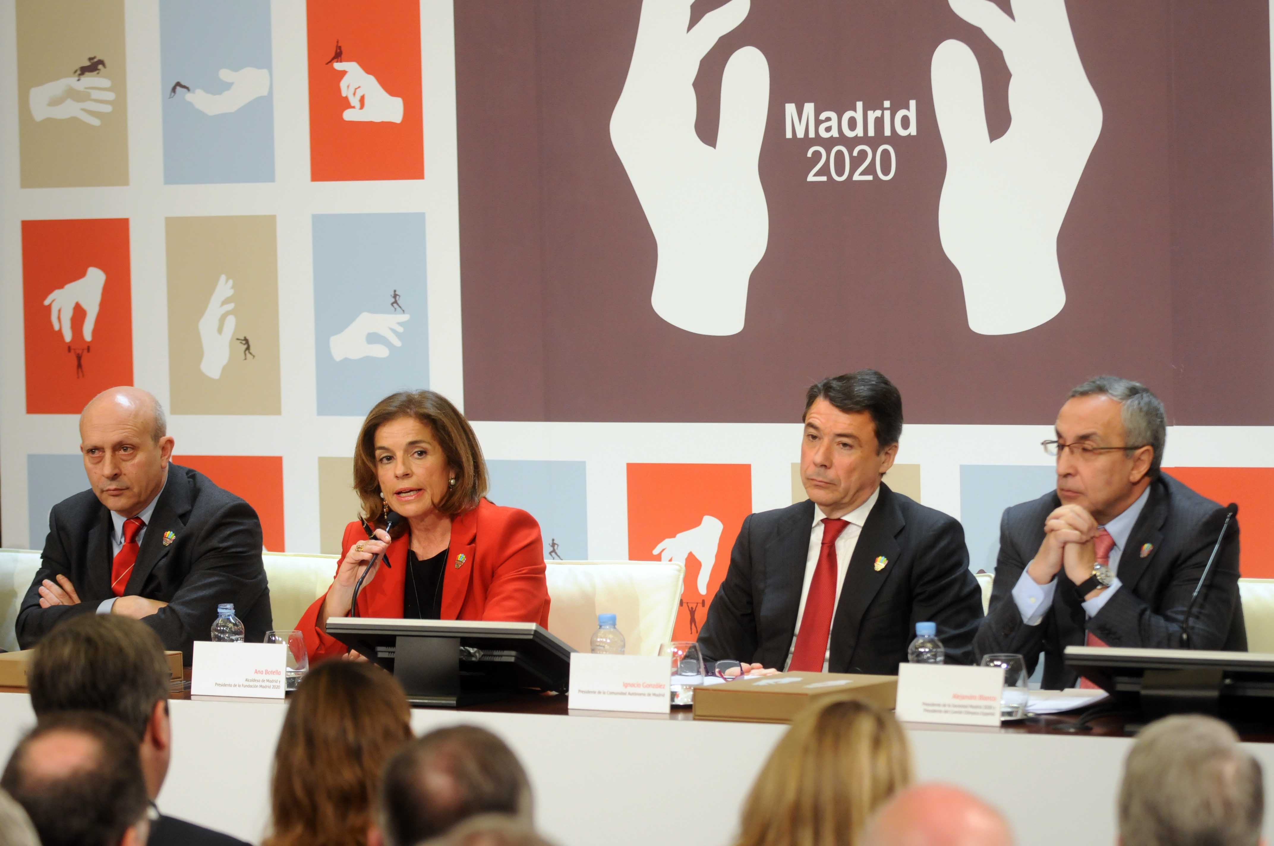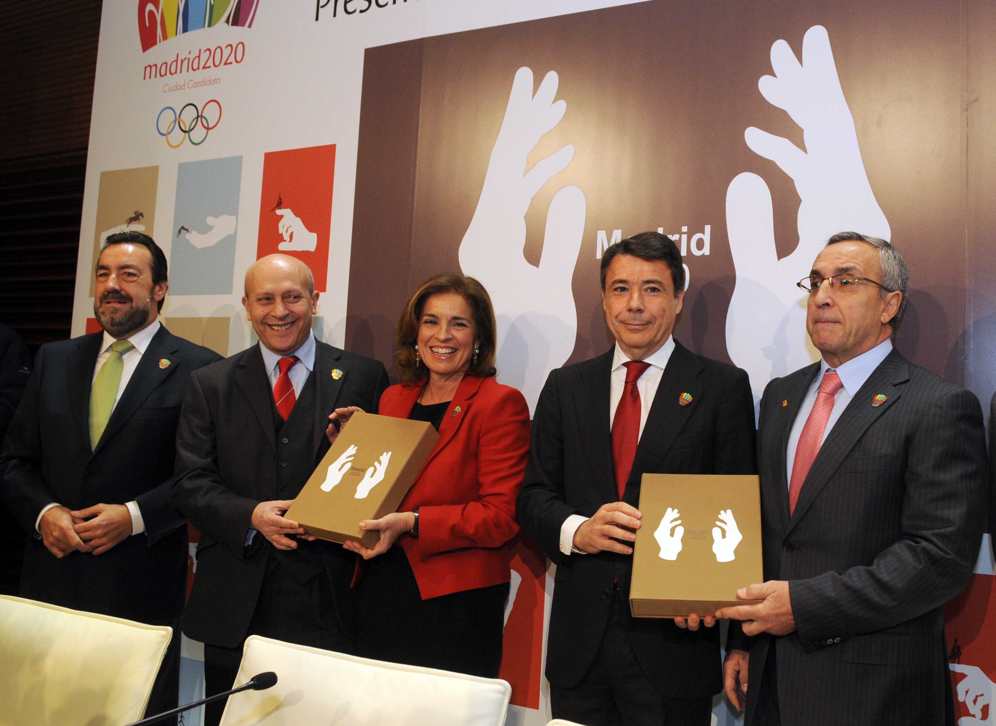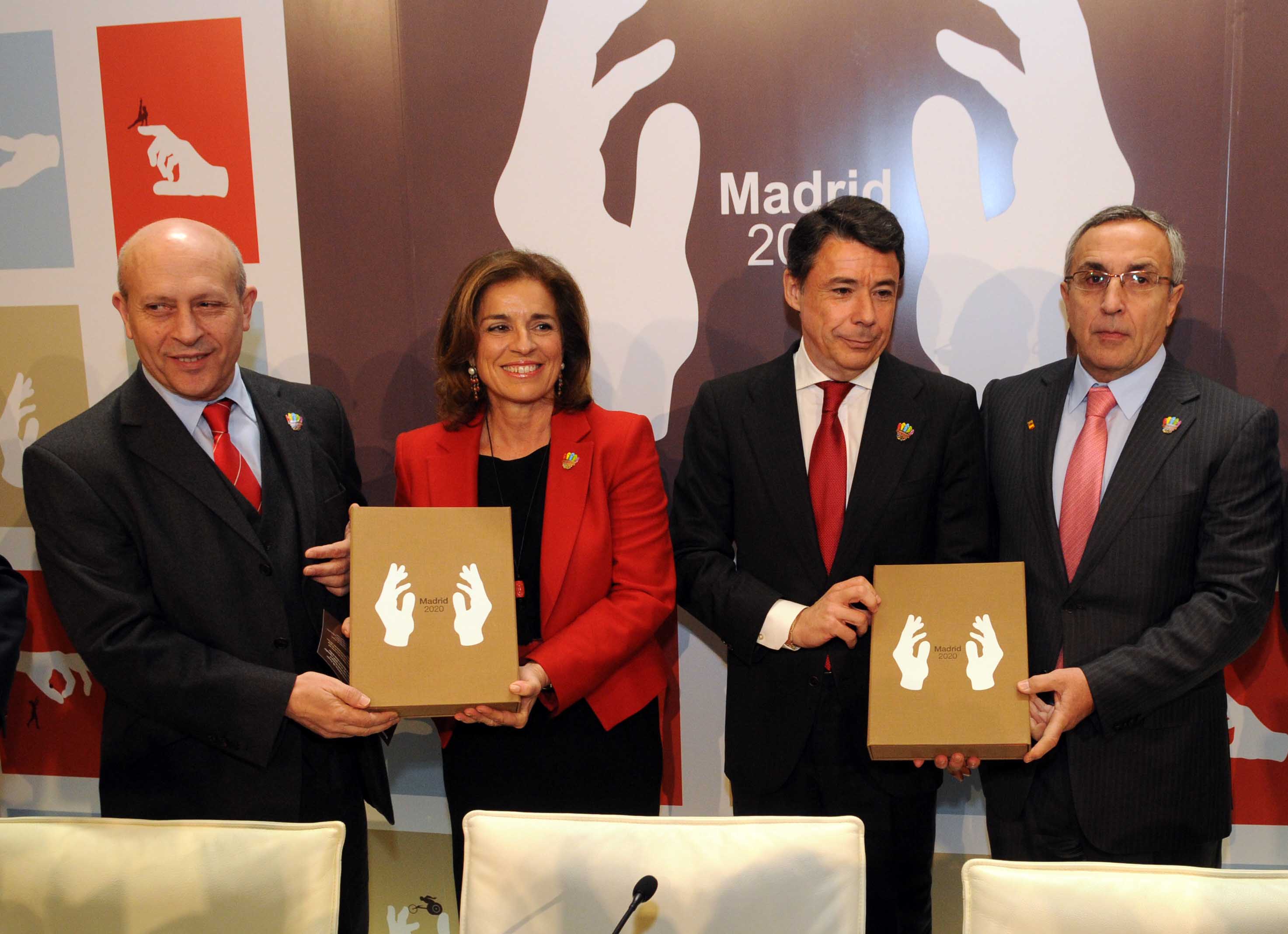 La alcaldesa, Ana Botella, y Alejandro Blanco, presidente de la Sociedad Madrid 2020 y del Comité Olímpico Español, durante la presentación esta mañana del Dossier Olímpico. En el acto han estado acompañados por los máximos representantes de las otras administraciones garantes del proyecto: el Gobierno central, en la persona de José Ignacio Wert, ministro de Educación, Cultura y Deporte, y la Comunidad de Madrid, con su presidente Ignacio González. También han estado presentes el presidente del Comité Paralímpico Español, Miguel Carballeda y el consejero delegado de Madrid 2020, Víctor Sánchez, quien ha realizado la exposición técnica del proyecto.