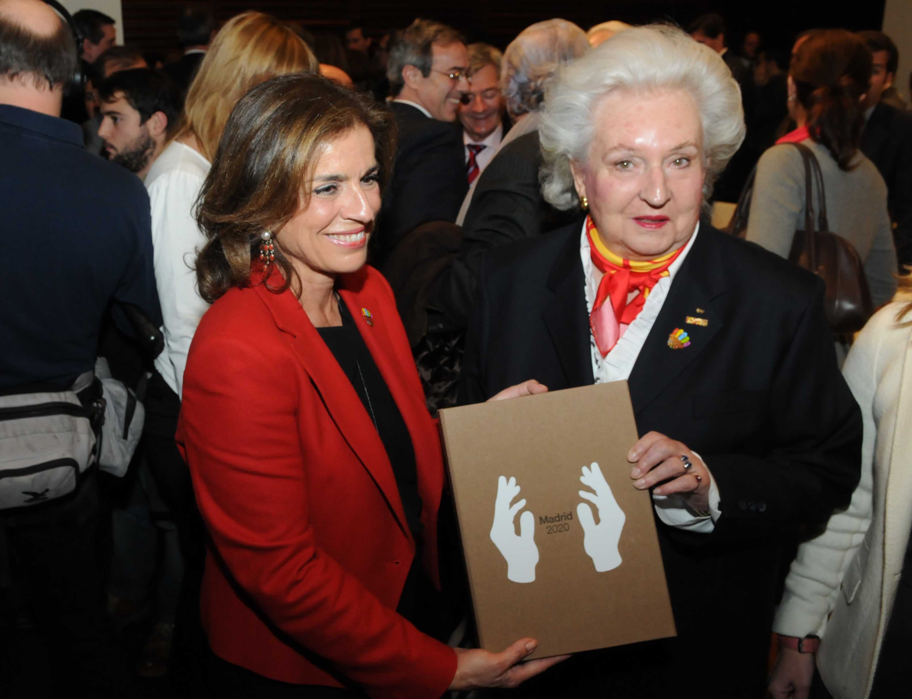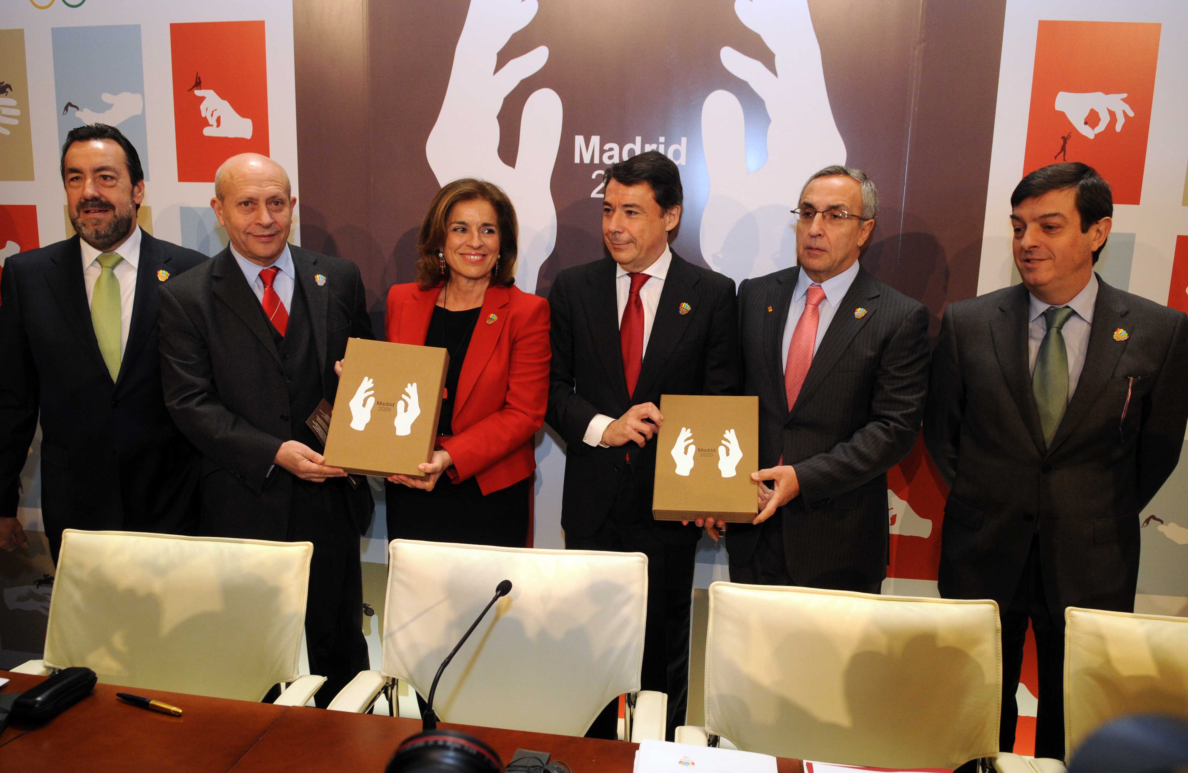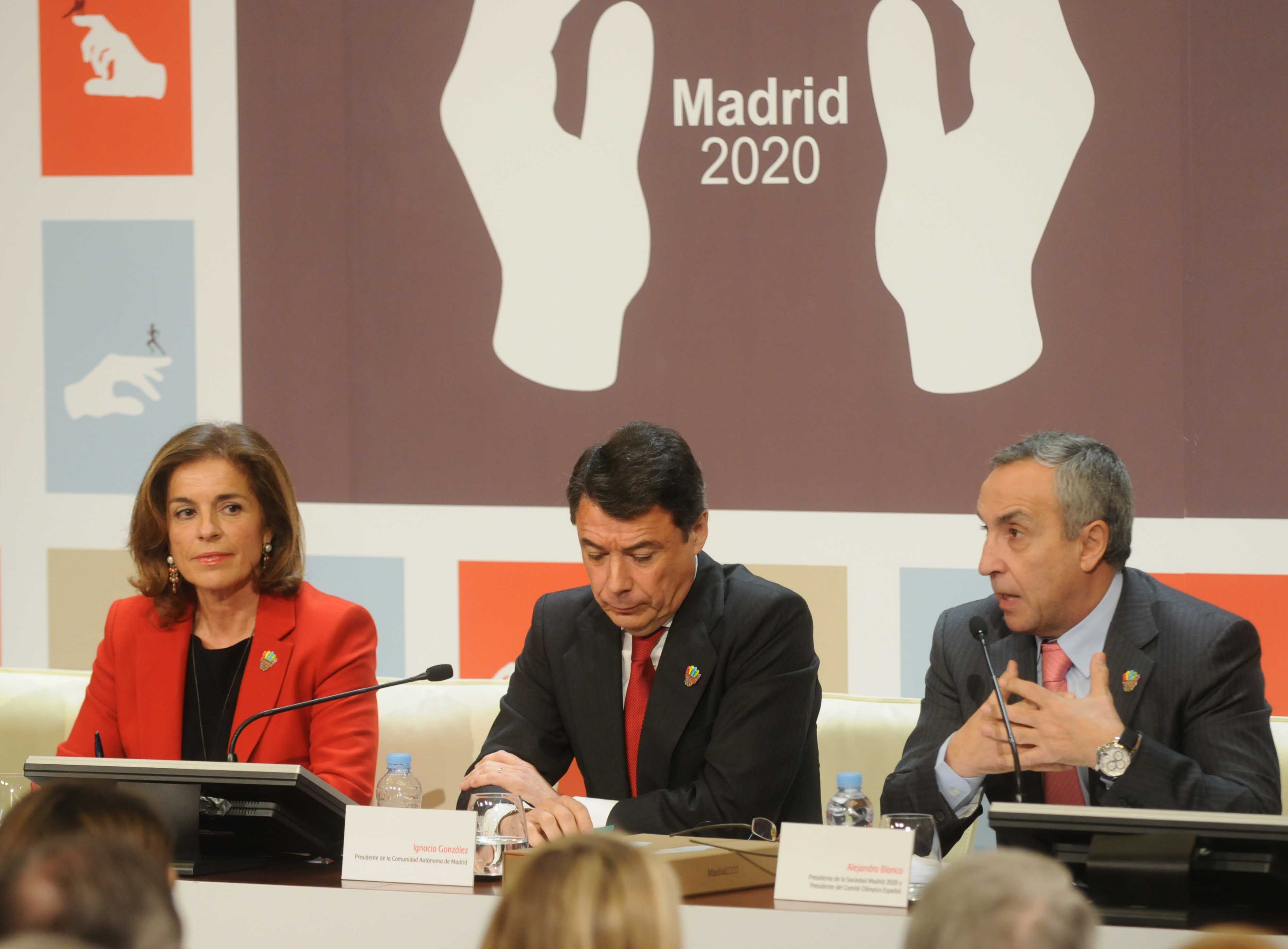 La alcaldesa, Ana Botella, y Alejandro Blanco, presidente de la Sociedad Madrid 2020 y del Comité Olímpico Español, durante la presentación esta mañana del Dossier Olímpico. En el acto han estado acompañados por los máximos representantes de las otras administraciones garantes del proyecto: el Gobierno central, en la persona de José Ignacio Wert, ministro de Educación, Cultura y Deporte, y la Comunidad de Madrid, con su presidente Ignacio González. También han estado presentes el presidente del Comité Paralímpico Español, Miguel Carballeda y el consejero delegado de Madrid 2020, Víctor Sánchez, quien ha realizado la exposición técnica del proyecto.