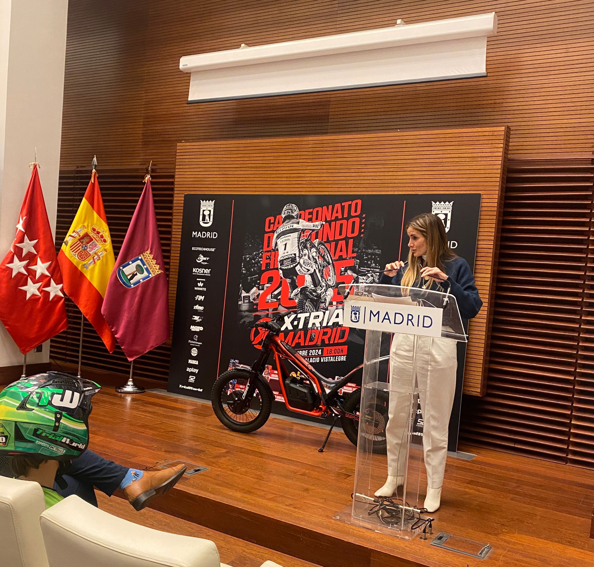 La concejala delegada de Deporte, Sonia Cea, ha participado hoy, en el Palacio de Cibeles, en la presentación del Campeonato del Mundo FIM de X-Trial, que se celebrará el próximo 21 de diciembre y que, en esta ocasión, tendrá como escenario el Palacio de Vistalegre. Junto al presidente de la Federación de Motociclismo de Madrid, José Carlos Lorente, y el CEO de X-Trial Madrid, Rodrigo Castro, Cea ha destacado “el deseo del Ayuntamiento de que Madrid siga siendo la gran plaza del deporte internacional y continúe acogiendo los mejores eventos del mundo”.