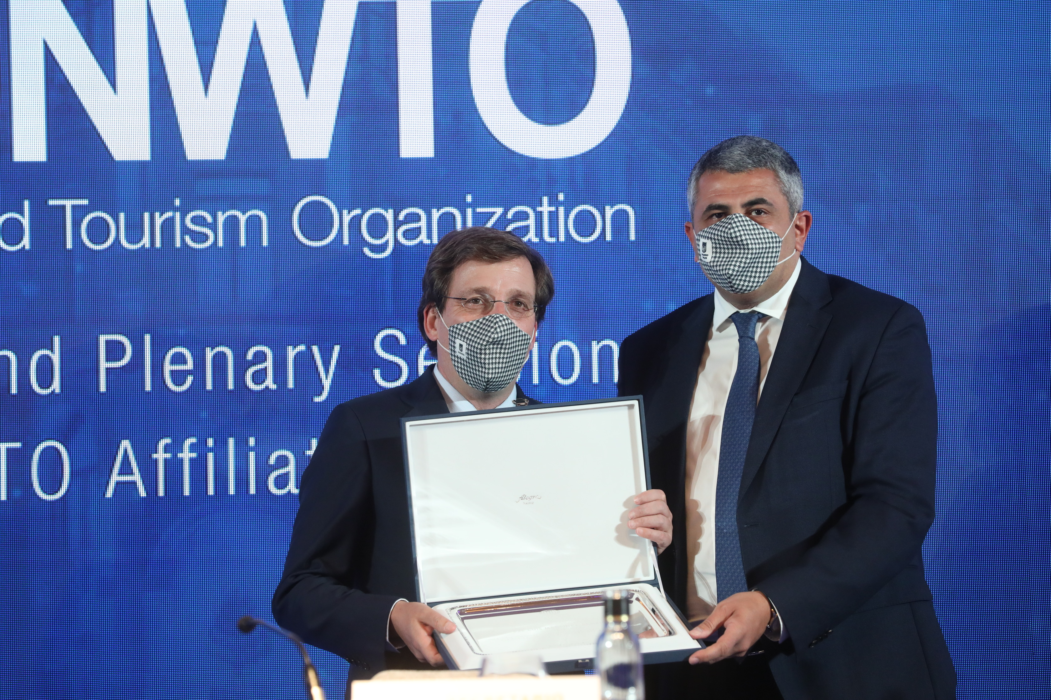 Durante el acto, el secretario general de la Organización Mundial del Turismo, Zurab Pololikashvili, ha hecho entrega al alcalde de Madrid de un reconocimiento “por su firme compromiso con el desarrollo del turismo urbano de calidad, sostenible e innovador y su contribución a la agenda 2030”.