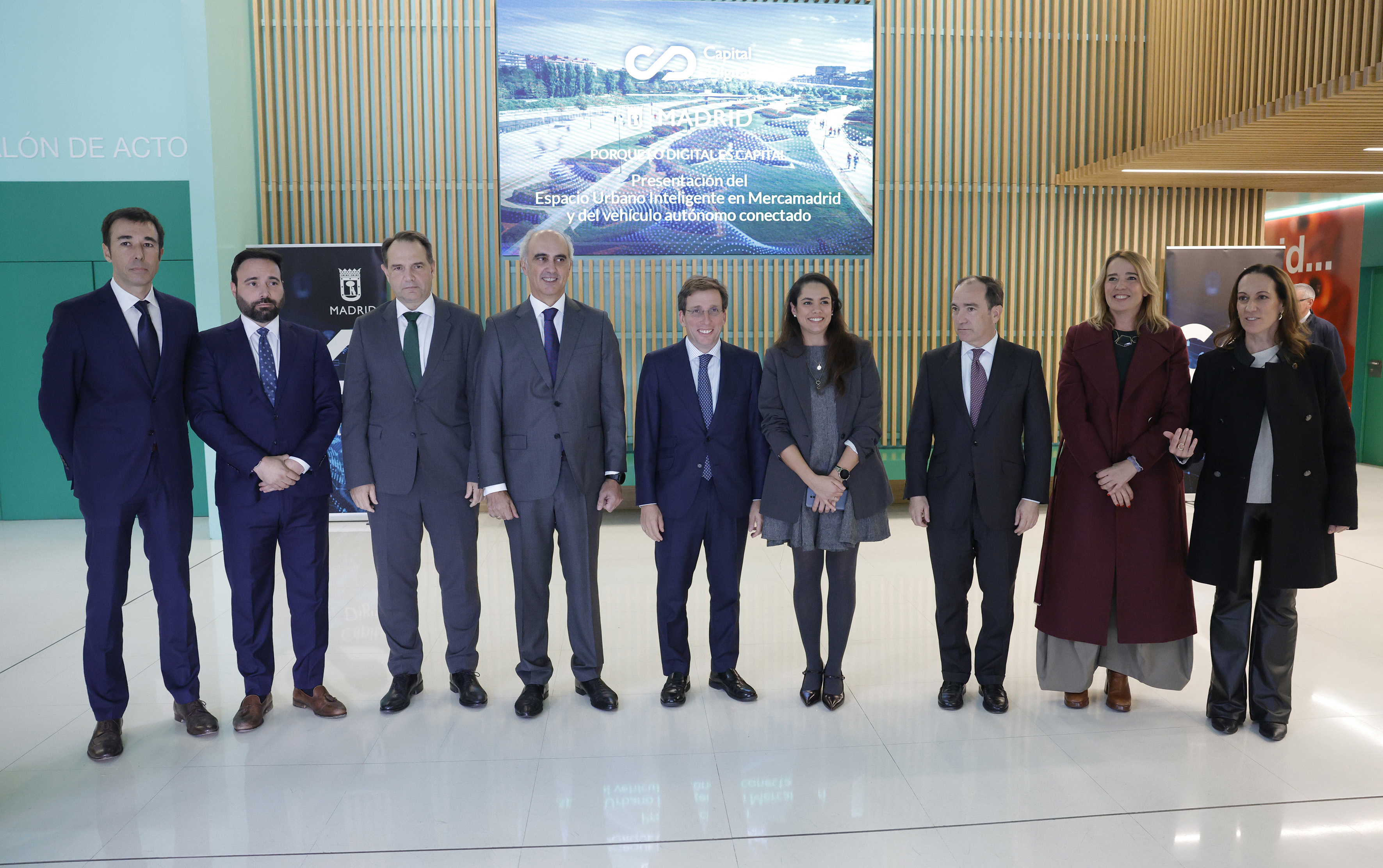 El alcalde de Madrid, José Luis Martínez Almeida, acompañado por el delegado de Urbanismo, Medioambiente y Movilidad, Borja Carabante, ha participado esta mañana en la presentación del Espacio Urbano Inteligente de Mercamadrid, un ámbito innovador que mejorará la eficiencia y sostenibilidad del comercio mayorista, además de ser un campo de pruebas para la logística y la movilidad. El acto, en el que se ha presentado también el nuevo vehículo autónomo conectado de pasajeros que circula en este entorno, se enmarca en las jornadas ‘Mobilities for EU’que se celebran esta semana en Madrid y Valladolid y que reúnen a expertos y representantes de ciudades europeas comprometidas con la movilidad sostenible y digital.