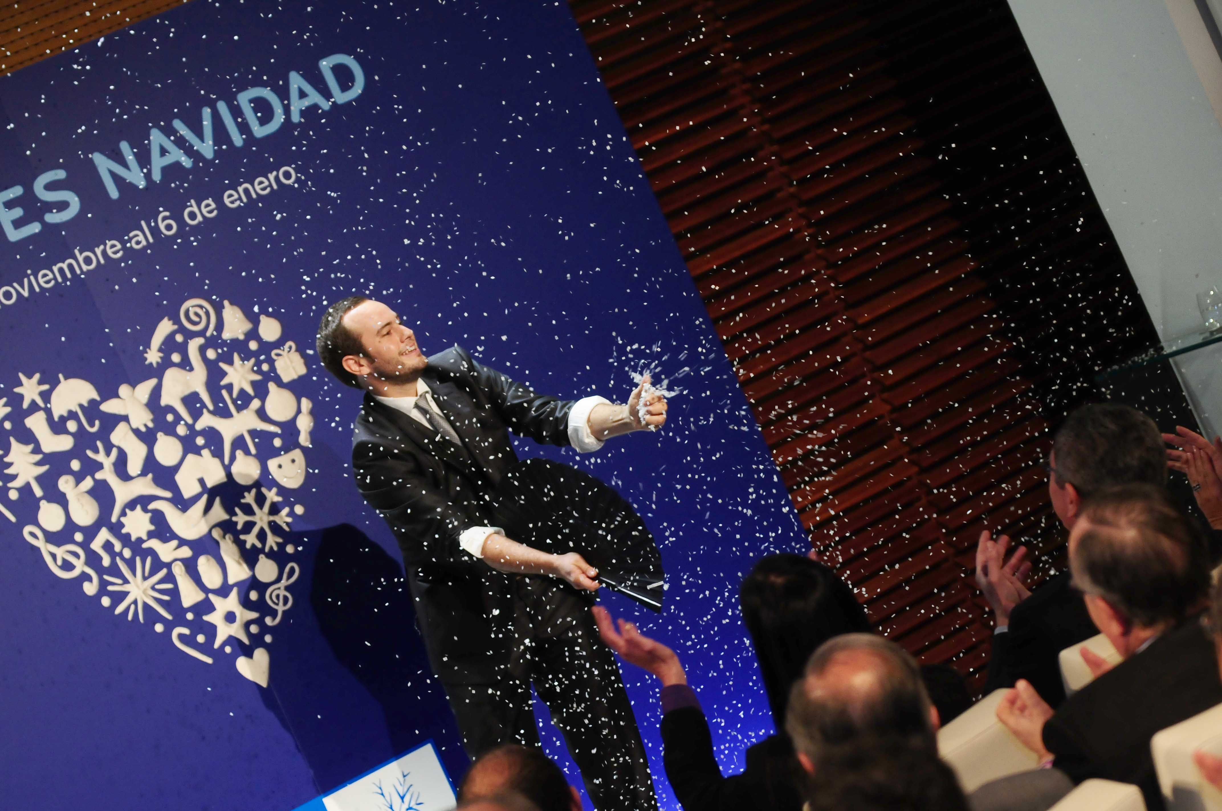 El alcalde de la Ciudad de Madrid, Alberto Ruiz-Gallardón, durante la presentación de la iluminación y de la programación de la Navidad. En una de las imágenes, el ilusionista Jorge Blas, durante el acto