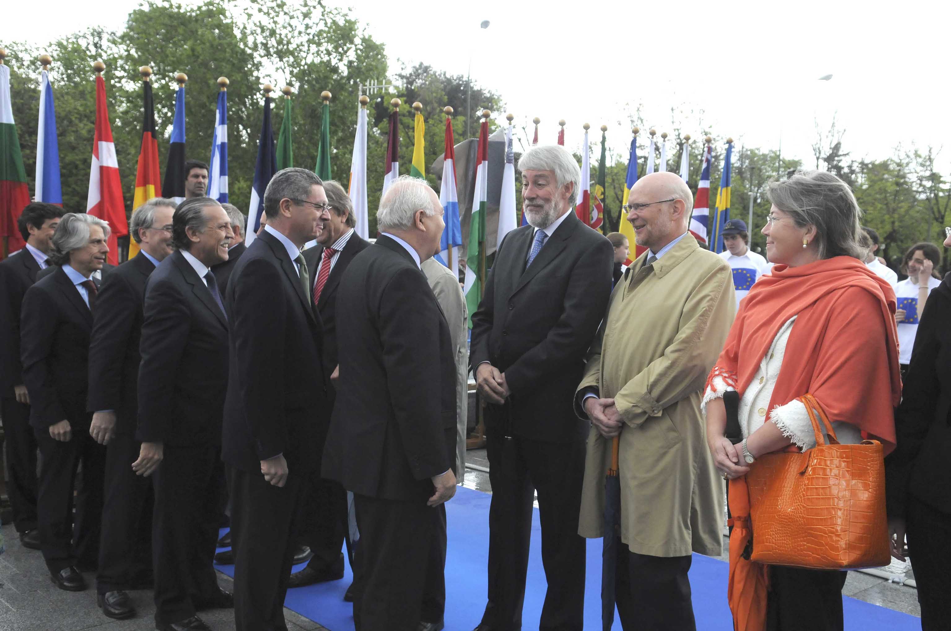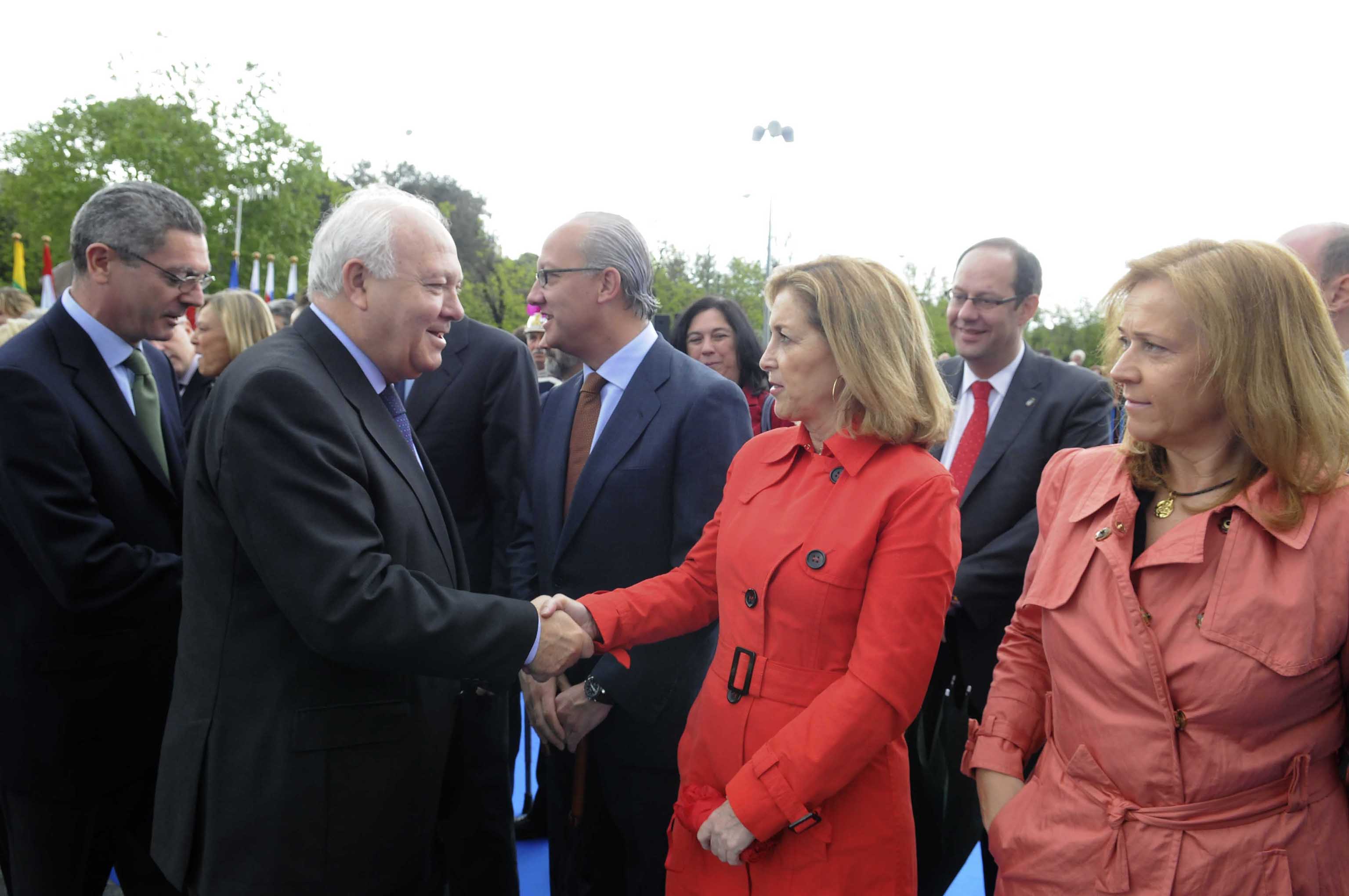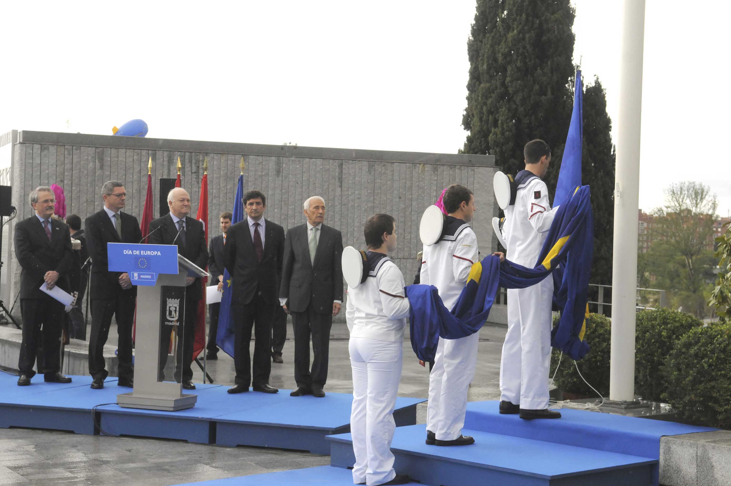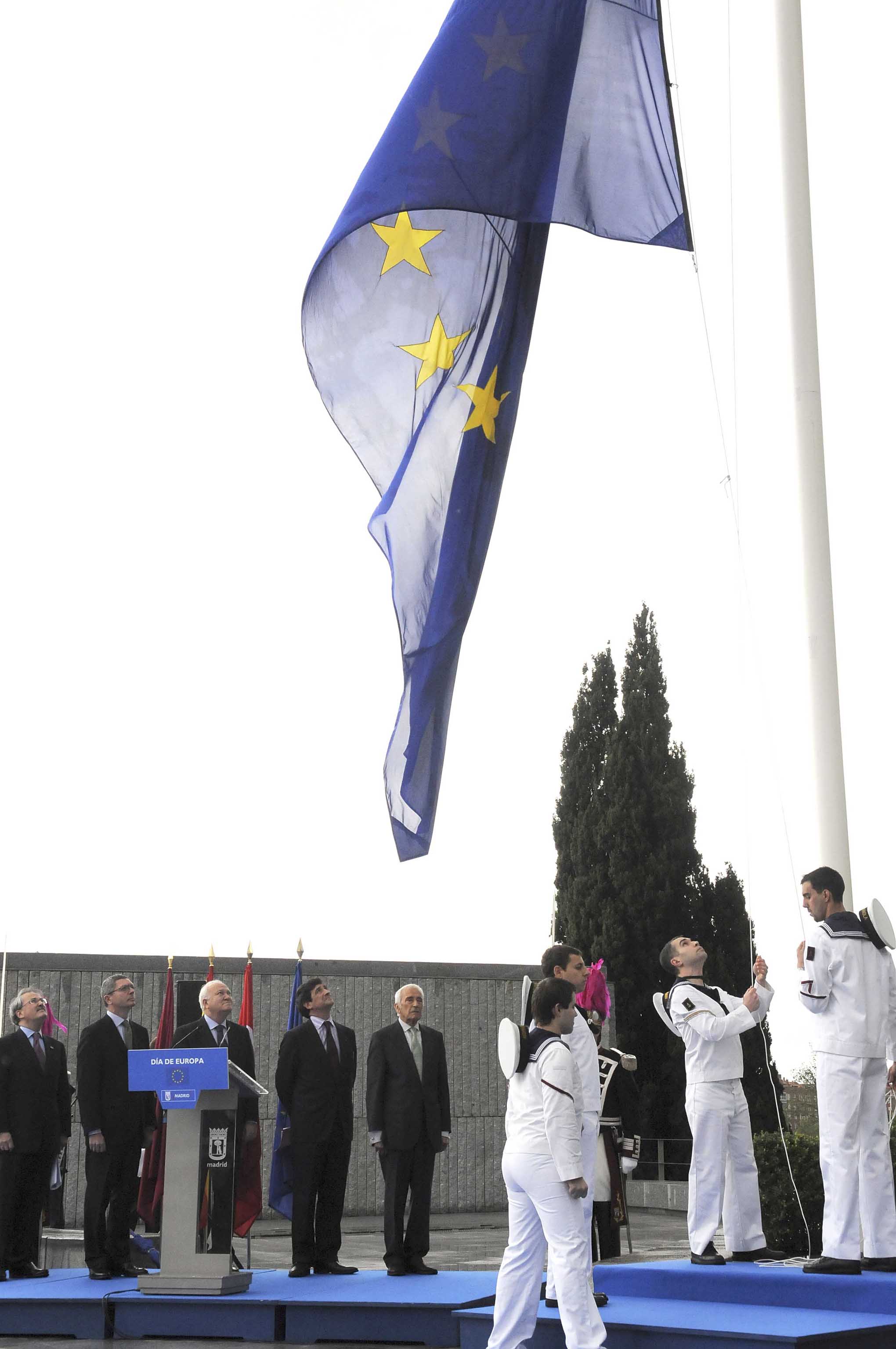 La bandera de las doce estrellas ondea desde hoy, sexagésimo aniversario de la declaración Schuman, en la recuperada ribera del Manzanares. El alcalde de la Ciudad de Madrid, Alberto Ruiz-Gallardón, ha participado en la celebración del Día de Europa, que ha tenido lugar en la glorieta de San Vicente, junto al río Manzanares. "Un ámbito histórico -ha dicho- cuyo resurgimiento simboliza la capacidad de superación que caracteriza al propio proyecto europeo". En el semestre en el que España ostenta la presidencia europea, el alcalde ha subrayado la lealtad al sueño de la unidad del continente, así como la prevalencia del hombre frente a la máquina, pese al desarrollo tecnológico. Ruiz-Gallardón ha asistido a esta conmemoración junto al ministro de Asuntos Exteriores y de Cooperación, Miguel Ángel Moratinos, y representantes de instituciones de Europa, entre los que se encontraban el presidente del Consejo Federal Español del Movimiento Europeo, Carlos María Bru, y el director de la Oficina del Parlamento Europeo en España, Ignacio Samper. El izado de la Bandera de la Unión Europea -que luce ya de manera permanente en este lugar- ha tenido como telón de fondo los sones del Himno de la Alegría, interpretado por la banda de Música de la Agrupación de Infantería de Marina. Madrid es la primera metrópoli de Europa donde ondea de manera definitiva la enseña que representa a los 27 estados miembros de la UE.