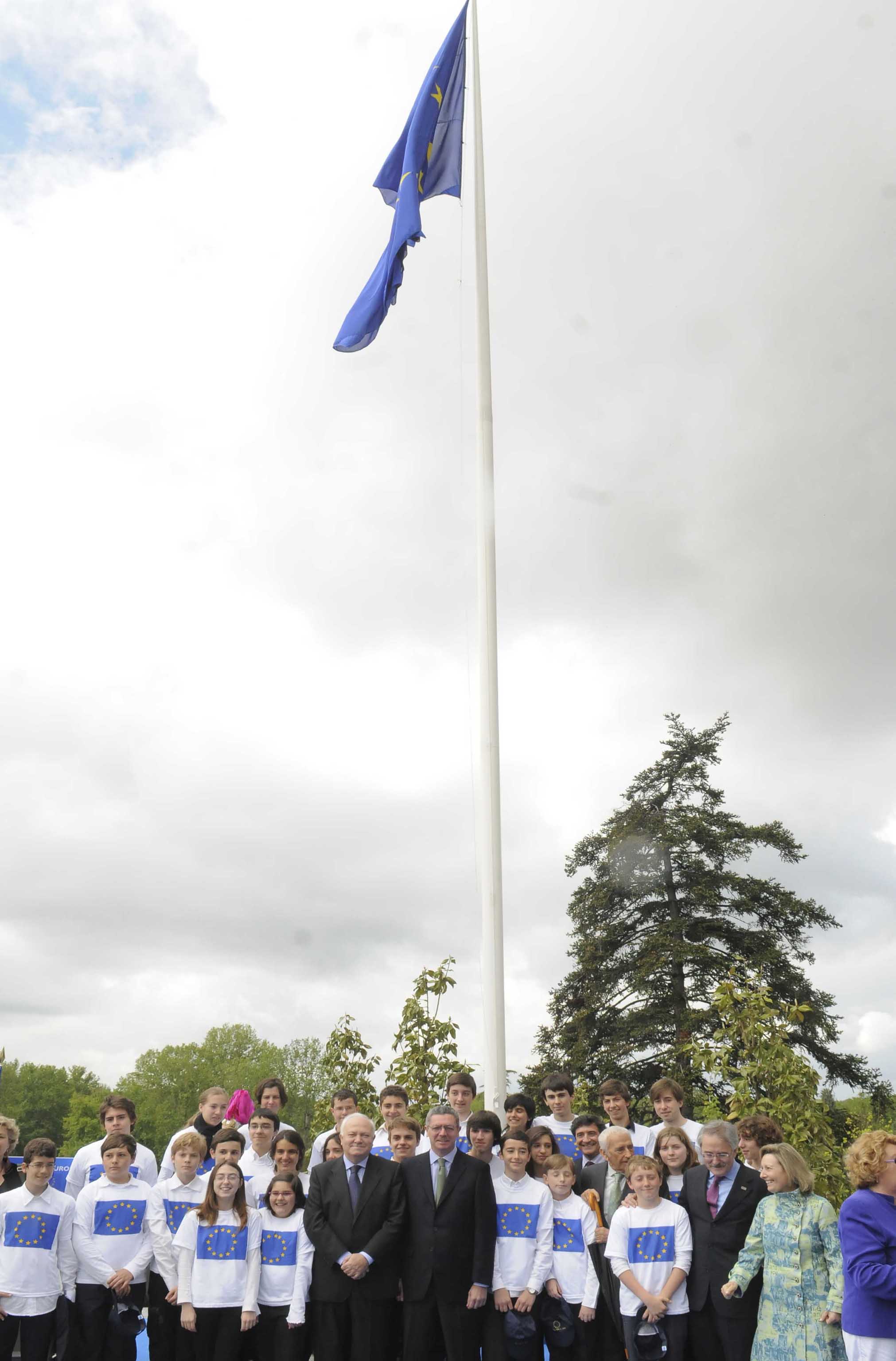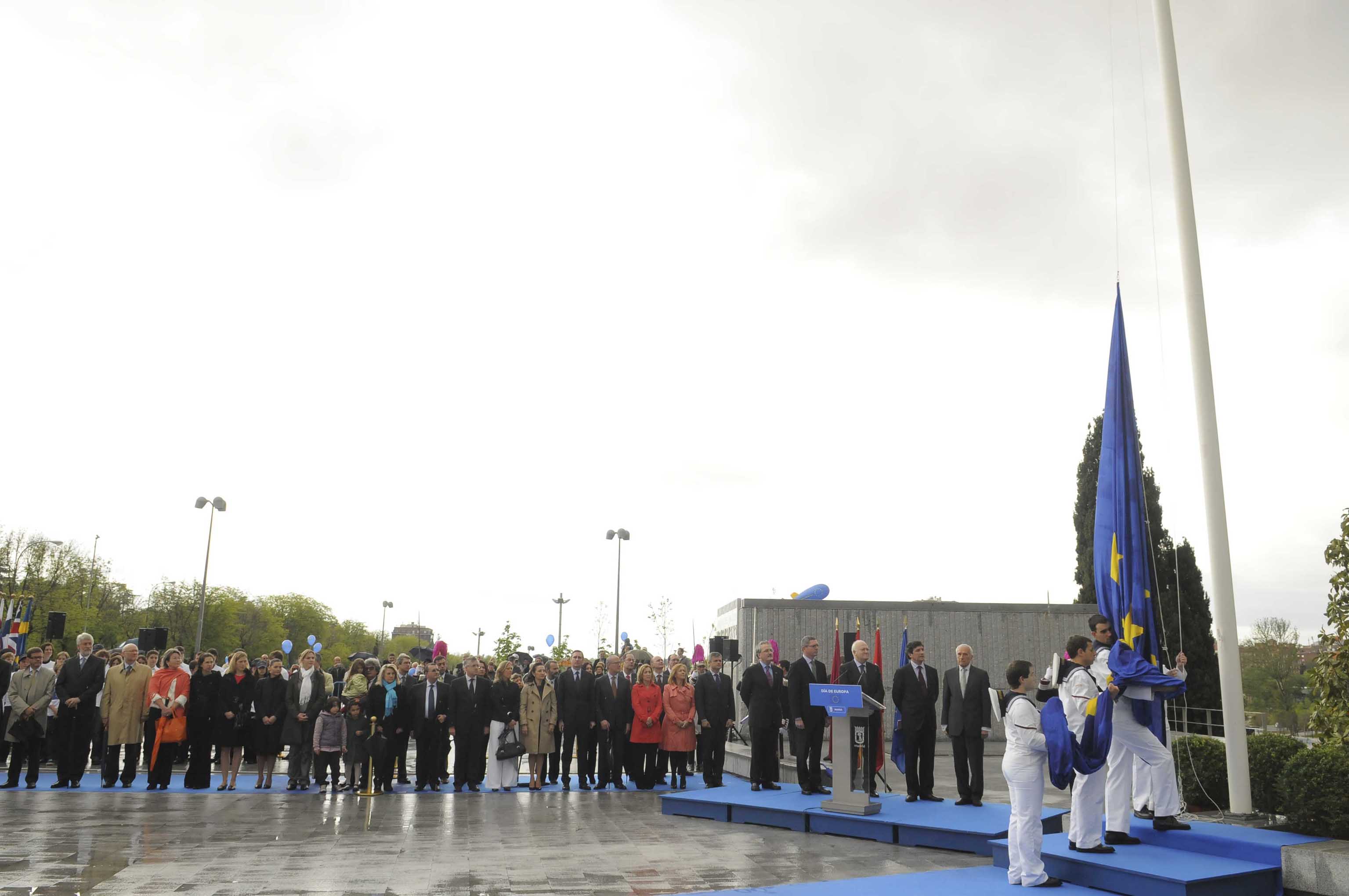 Imágenes de la celebración del Día de Europa, a la que han asistido el ministro de Exteriores, Miguel Ángel Moratinos, y el alcalde de la Ciudad de Madrid, Alberto Ruiz-Gallardón, además de varios representantes de la UE y concejales del Ayuntamiento de la capital. El izado de la bandera de la Unión Europea ha tenido lugar junto a la glorieta de San Vicente, en la recuperada ribera del río Manzanares. La bandera ondea de manera definitiva en este emplazamiento.