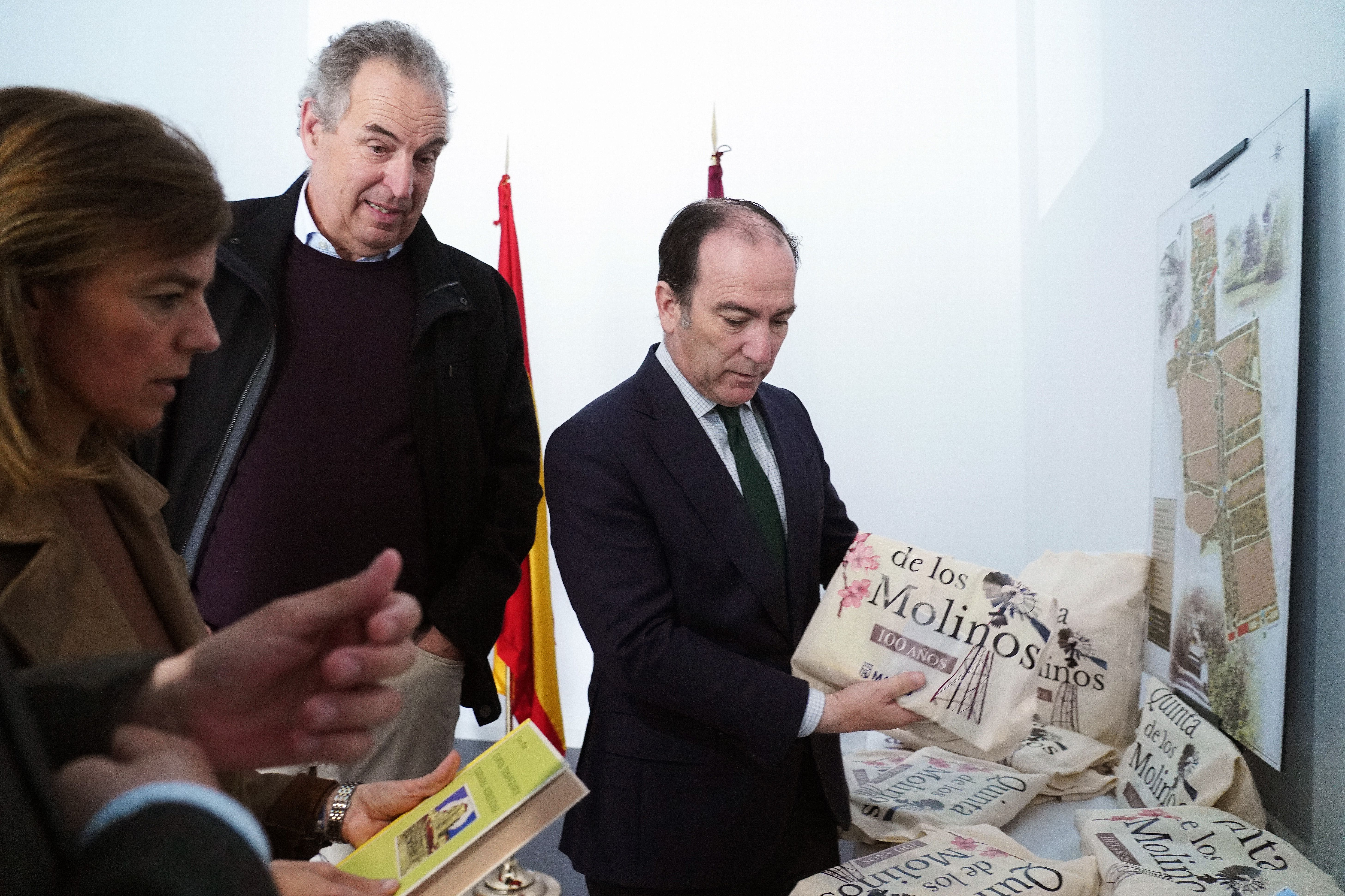 El delegado de Urbanismo, Medio Ambiente y Movilidad, Borja Carabante, acompañado por el concejal delegado de Limpieza y Zonas Verdes, José Antonio Martínez Páramo, y la concejala de San Blas-Canillejas, Almudena Maíllo, ha visitado esta mañana la Quinta de los Molinos en el marco de estos actos conmemorativos que coinciden, además, con el primer aniversario de su declaración como Bien de Interés Cultural.