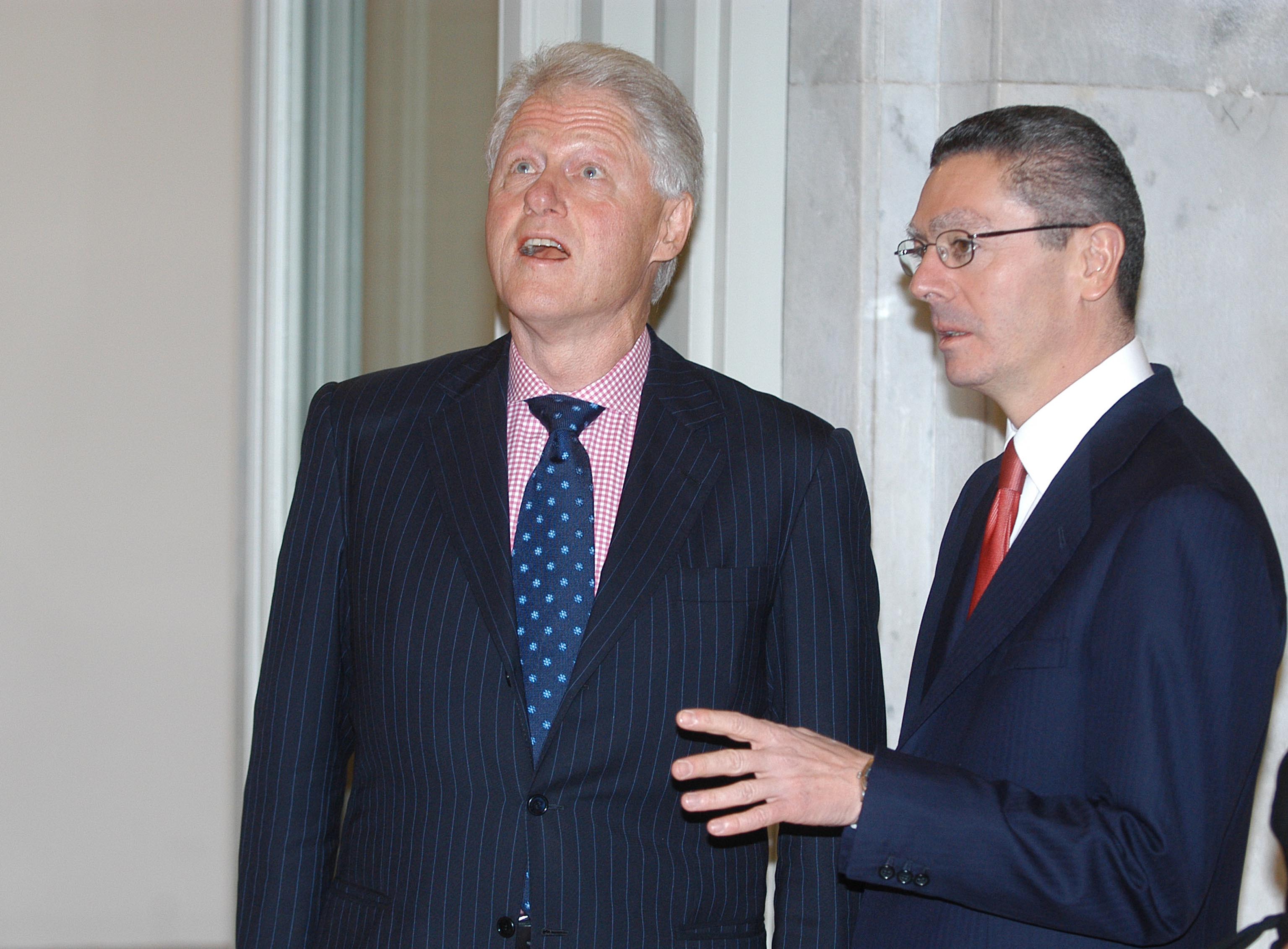 Alberto Ruiz-Gallardón y Bill Clinton durante la recepción que ha ofrecido el Ayuntamiento, en la nueva sede del Palacio de Cibeles, a la Asamblea General y Conferencia Anual del Club de Madrid