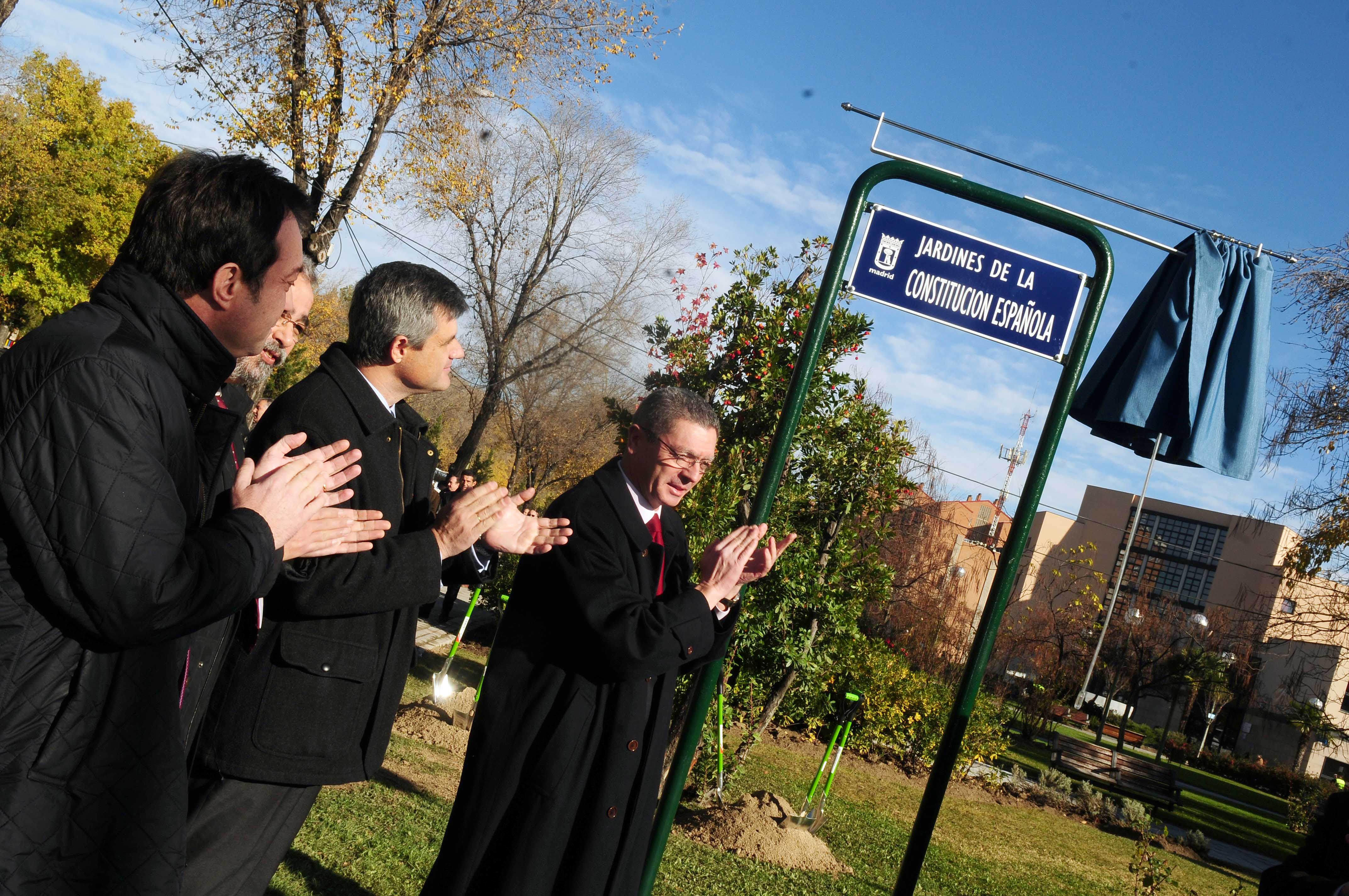 Madrid ha querido hacer un regalo especial a la Carta Magna española en su trigésimo primer cumpleaños: unos jardines, situados en Moratalaz que, desde hoy, llevan el nombre de Jardines de la Constitución Española. La decisión ha partido del consenso de todas las formaciones políticas representadas en el Ayuntamiento. Esta mañana los ha inaugurado el alcalde, Alberto Ruiz-Gallardón, quien ha estado acompañado por los portavoces del PP, PSOE e IU, el vicealcalde Manuel Cobo, David Lucas y Ángel Pérez, respectivamente.