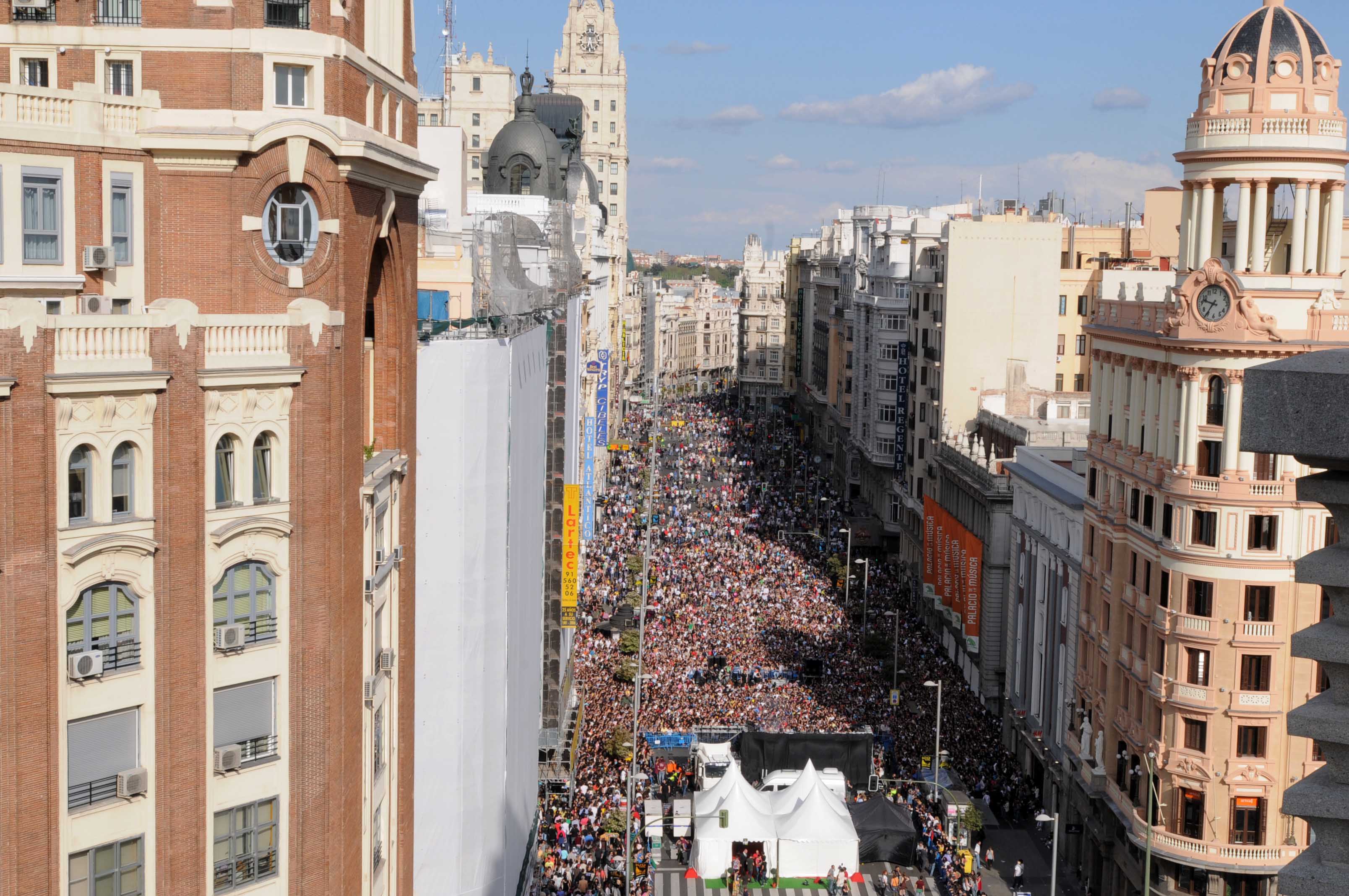 Madrid celebra sus fiestas patronales y la ciudad se llena de música. En la imagen, una perspectiva de la Gran Vía, la calle más festejada a lo largo de este año.