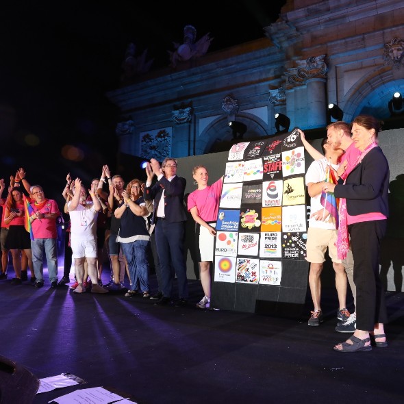 La primera teniente de alcalde y concejala de Equidad, Derechos Sociales y Empleo, Marta Higueras, ha hecho entrega del testigo del Europride a las ciudades de Gotemburgo y Estocolmo. “Un testigo lleno de reivindicación y de orgullo –dijo Higueras– quien deseó lo mejor para el Europride 2018, desde una Puerta de Alcalá multicolor”. Kristine Garina, presidenta de EPOA (European Pride Organisers Association) y Eva Louise Erlandsson Slorach, presidenta del Consejo Municipal de Estocolmo, además de las delegaciones de EuroPride Gotemburgo y Estocolmo, han asistido al acto, que también ha contado con la presencia de representantes de MADO 2017, entre otras personalidades. /