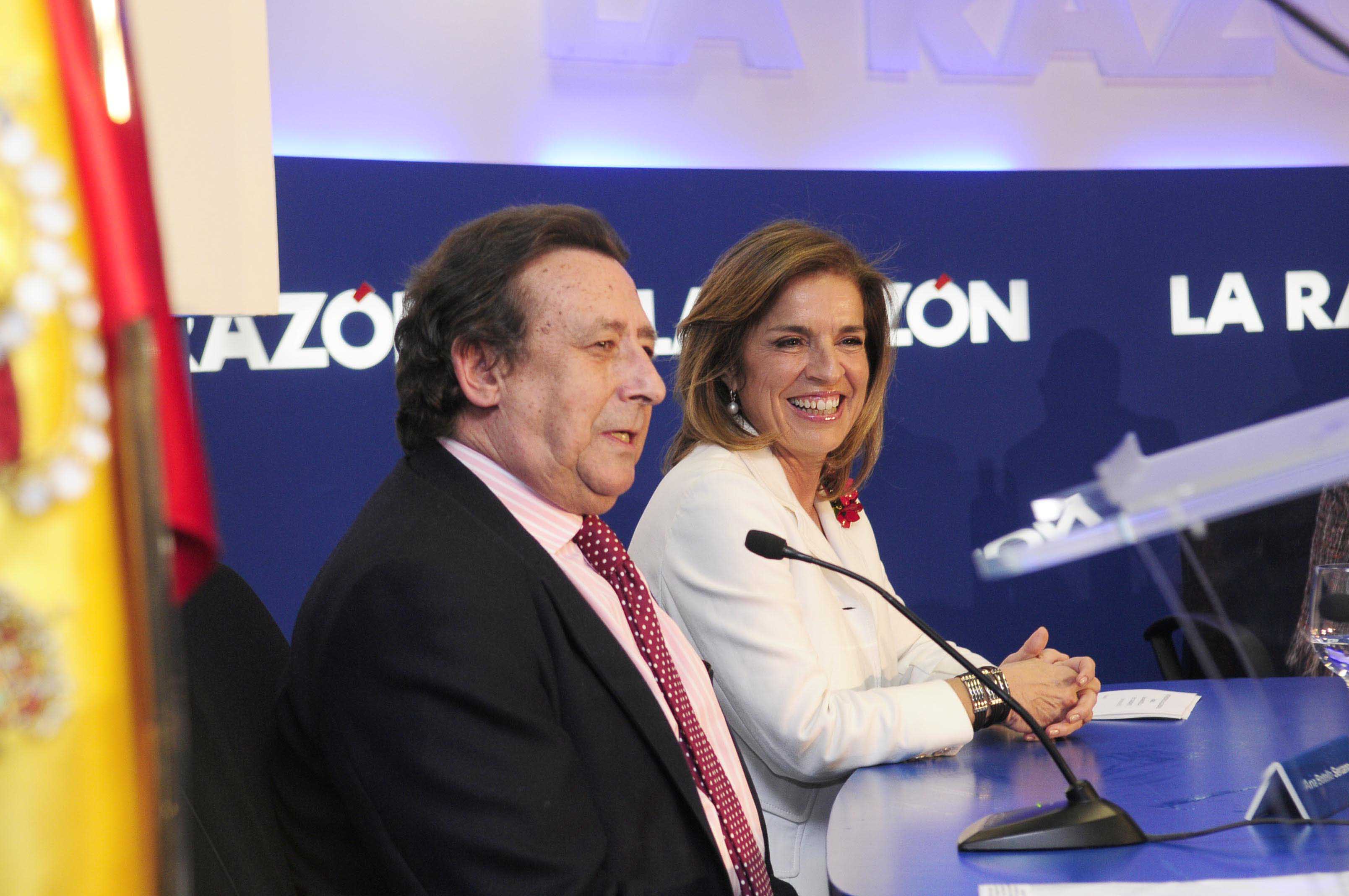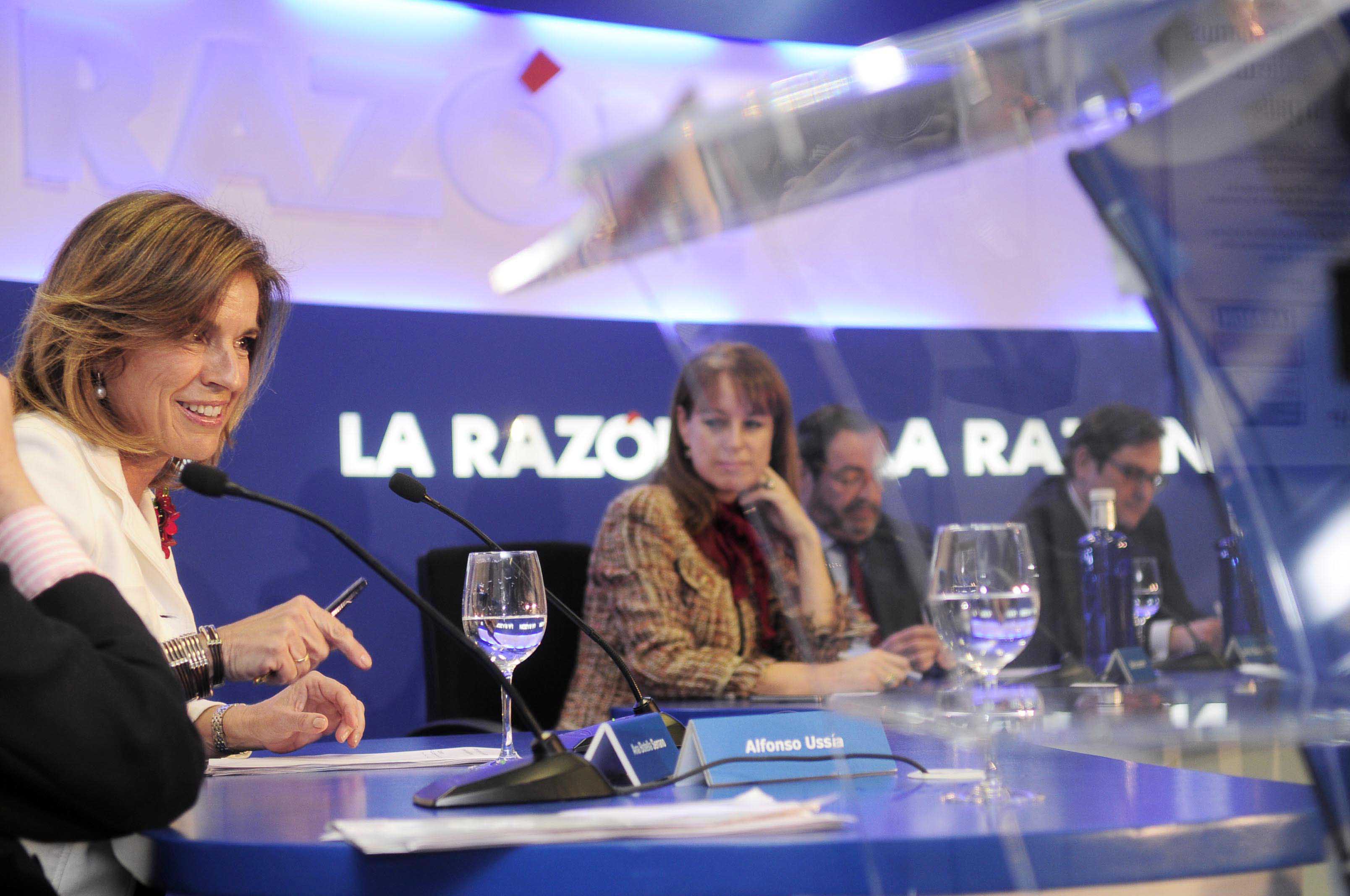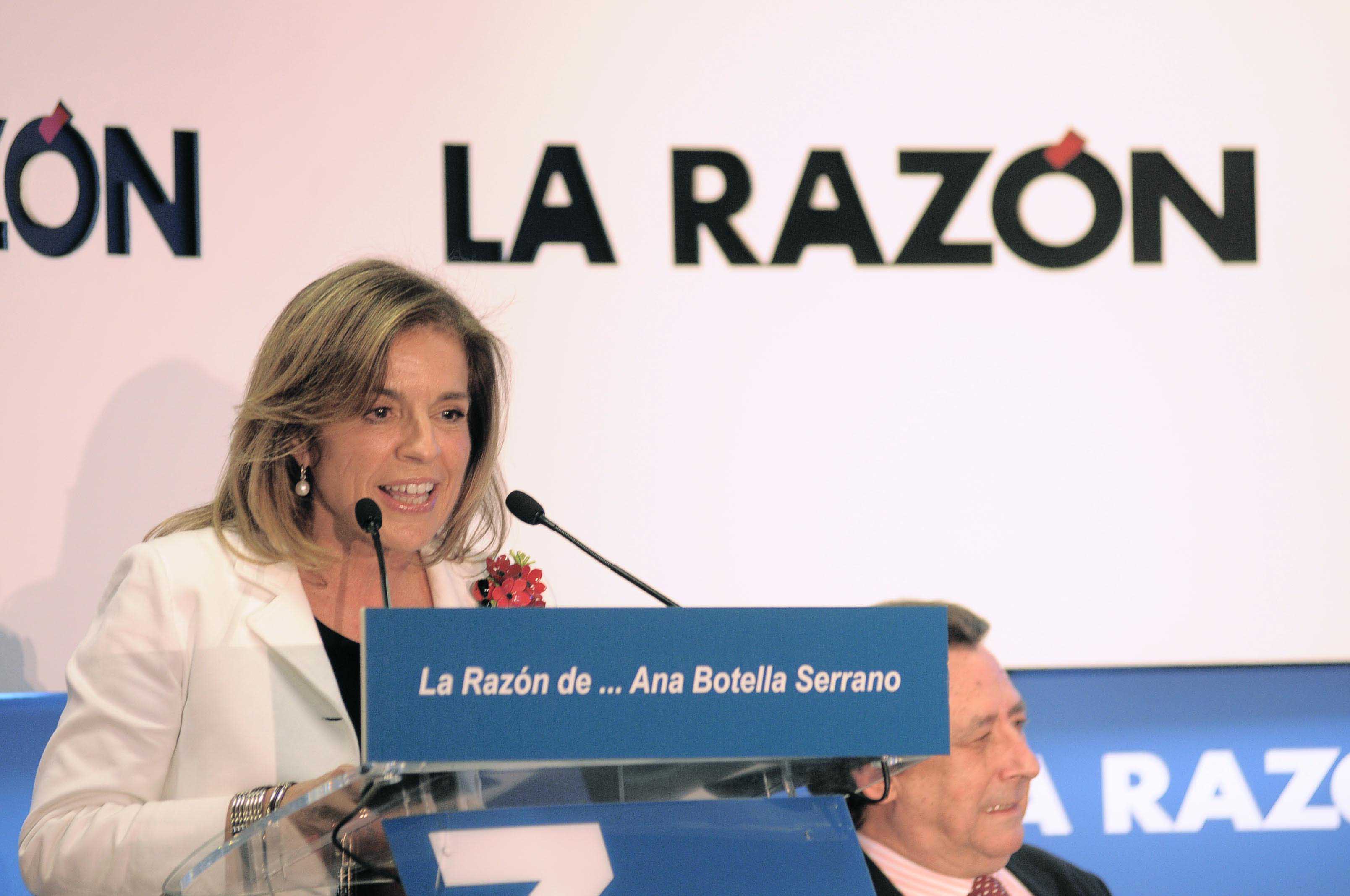 La alcaldesa de la Ciudad de Madrid, Ana Botella, durante el encuentro "La Razón de...", un acto que ha contado con la participación de Alfonso Ussía, Francisco Marhuenda, director de La Razón; Gloria Lomana, directora de Informativos de Antena 3, y Javier González Ferrari, presidente de Onda Cero. Los ministros Alberto Ruiz-Gallardón, Jorge Fernández, Luis de Guindos y Ana Pastor se han acercado a un acto, que ha contado con la asistencia de otras muchas personalidades como el ex presidente del Gobierno José María Aznar, o Esperanza Aguirre, presidenta de la Comunidad de Madrid.