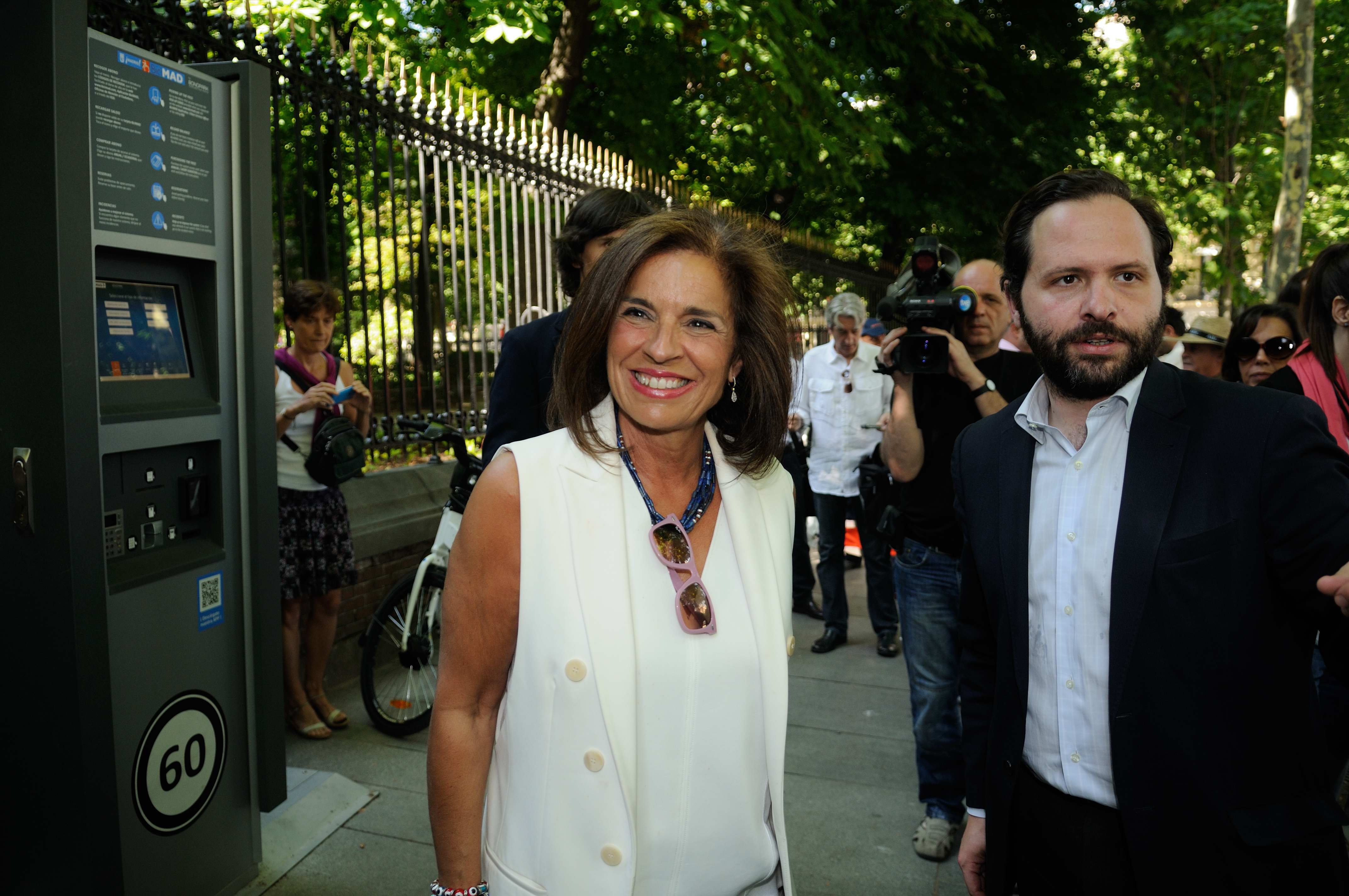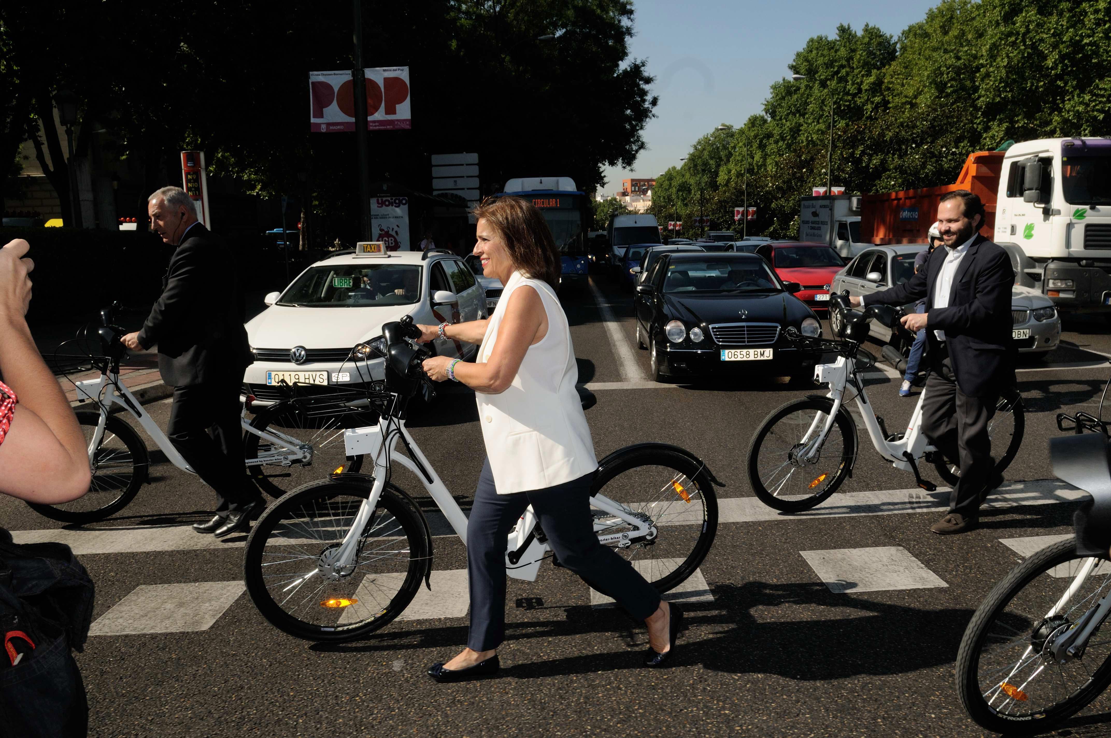 La alcaldesa de Madrid, Ana Botella, durante la inauguración de BiciMAD. El servicio, el primero de biciletas públicas cien por cien eléctricas de Europa, comienza con una flota de 1.560 bicicletas y funciona todos los días de la semana, las 24 horas del día