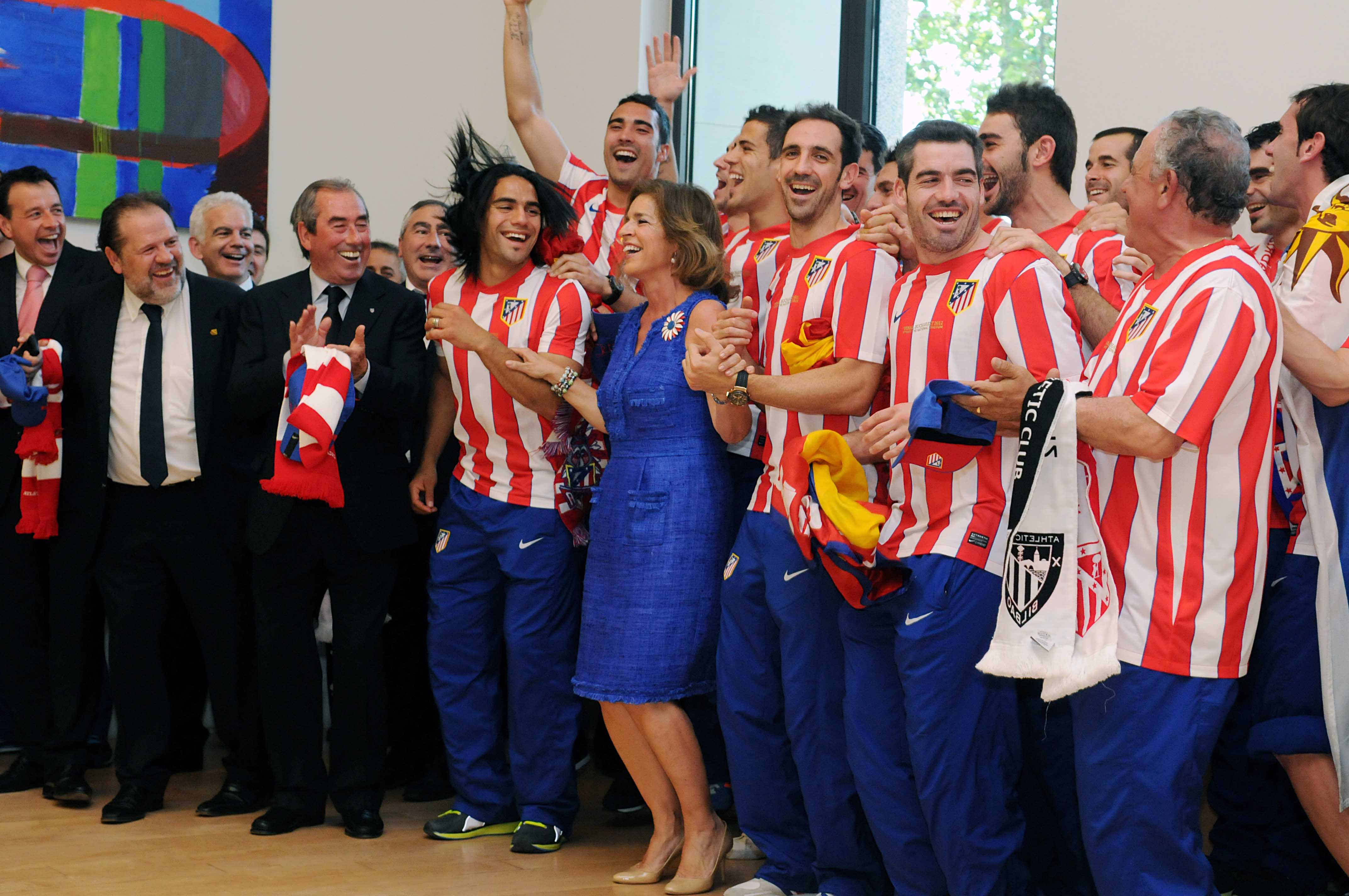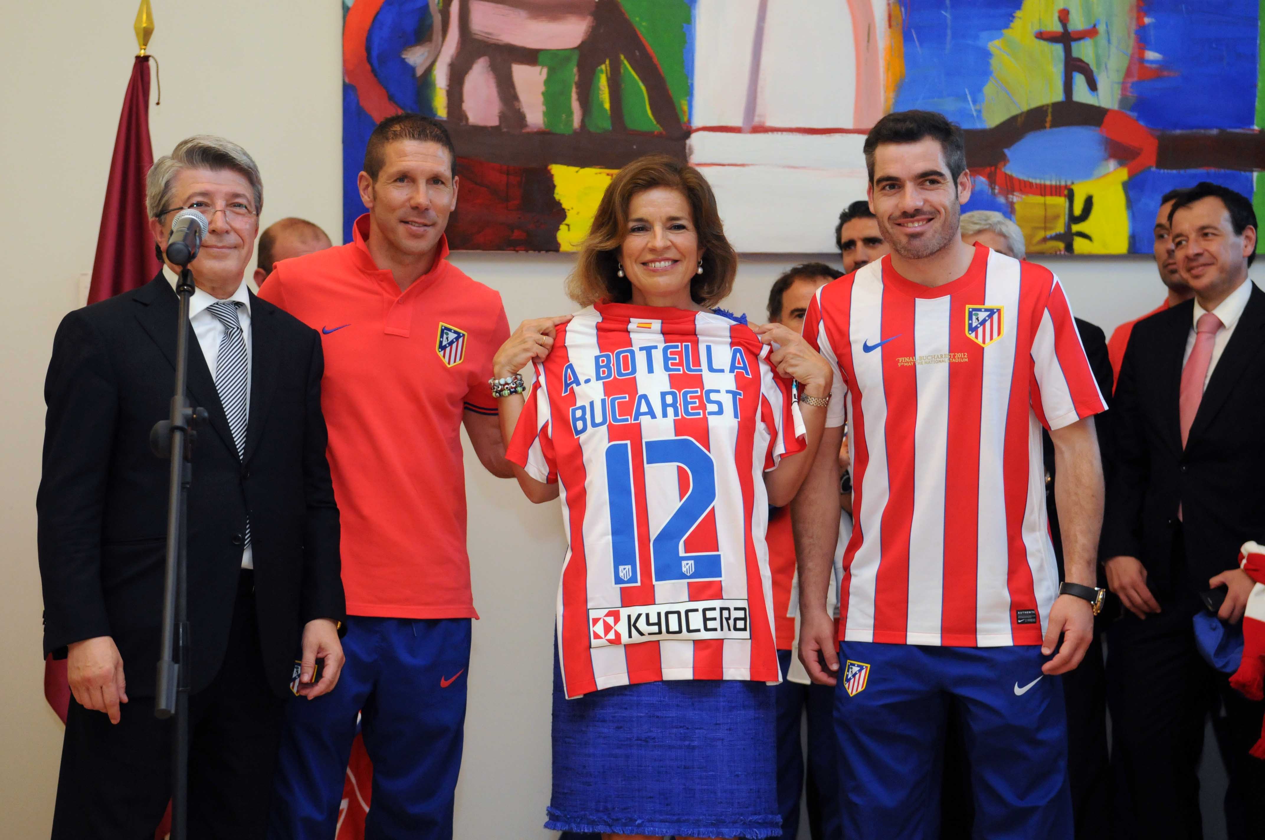 Jugadores y técnicos del Atlético de Madrid pasaron por la sede del Ayuntamiento para ofrecer el título de la segunda Liga Europa a los madrileños. La alcaldesa, Ana Botella, les recibió en su despacho y no dudó a la hora de "enfundarse" la camiseta rojiblanca y desearles otros triunfos.
