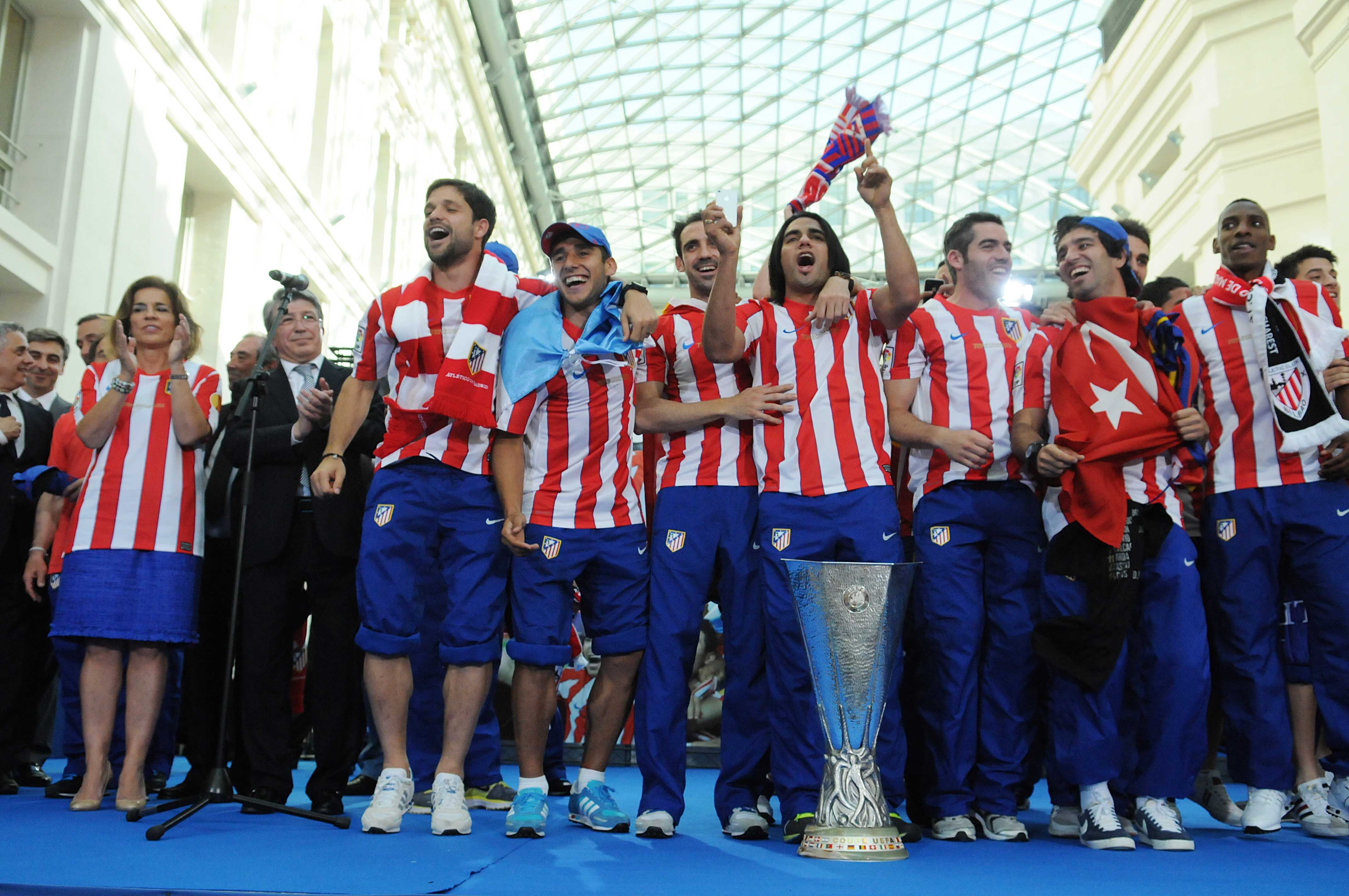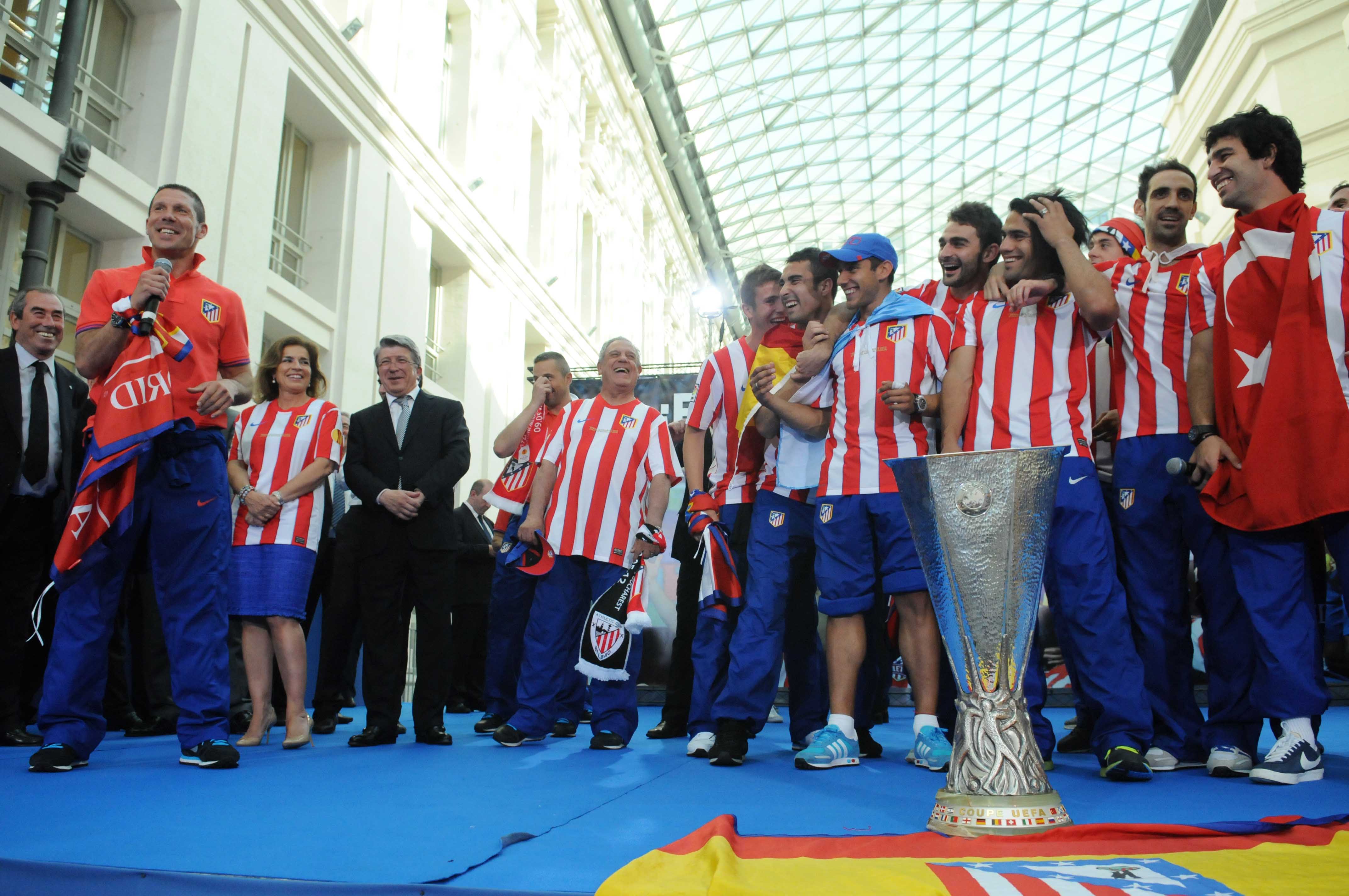 La ola rojiblanca que se elevaba ayer por las gradas del Estadio Nacional de Bucarest ha llegado esta tarde a Madrid. En la cresta, un Atlético que sumaba anoche un título más a su palmarés: la segunda Liga Europa, el quinto título internacional y el tercero en los últimos dos años. Antes del encuentro con la afición en Neptuno, el equipo ha hecho una parada en el Palacio de Cibeles para ofrecer a los madrileños el trofeo en la persona de la alcaldesa Ana Botella, testigo directo ayer del triunfo. Botella agradeció a los autores de los goles, al equipo, al míster, al cuadro técnico, al presidente este título que vuelve a situar al deporte español y madrileño en primera línea internacional, cuando la aspiración olímpica madrileña sigue viva. “Los equipos de Madrid, los deportistas de Madrid lleváis el nombre de nuestra ciudad por todo el mundo. Sois embajadores de la “Marca Madrid” y de la “Marca España” y una parte fundamental del proyecto olímpico de nuestra ciudad”. Pero Bucarest fue algo más que el escenario de un triunfo, fue testigo del civismo de la afición española. “Más de 30.000 aficionados españoles –recordó Botella– disfrutamos en el estadio de vuestro fútbol, y antes del partido, las dos aficiones fueron ejemplo de civismo, de tranquilidad”. Una actitud que reclamó la alcaldesa para la gran fiesta de momentos después. “Neptuno os espera para celebrar con vosotros y con todos los atléticos una gran fiesta rojiblanca. Confío en que sea la fiesta que se merece vuestra afición, que mañana en los periódicos se hable de la gran afición atlética”./