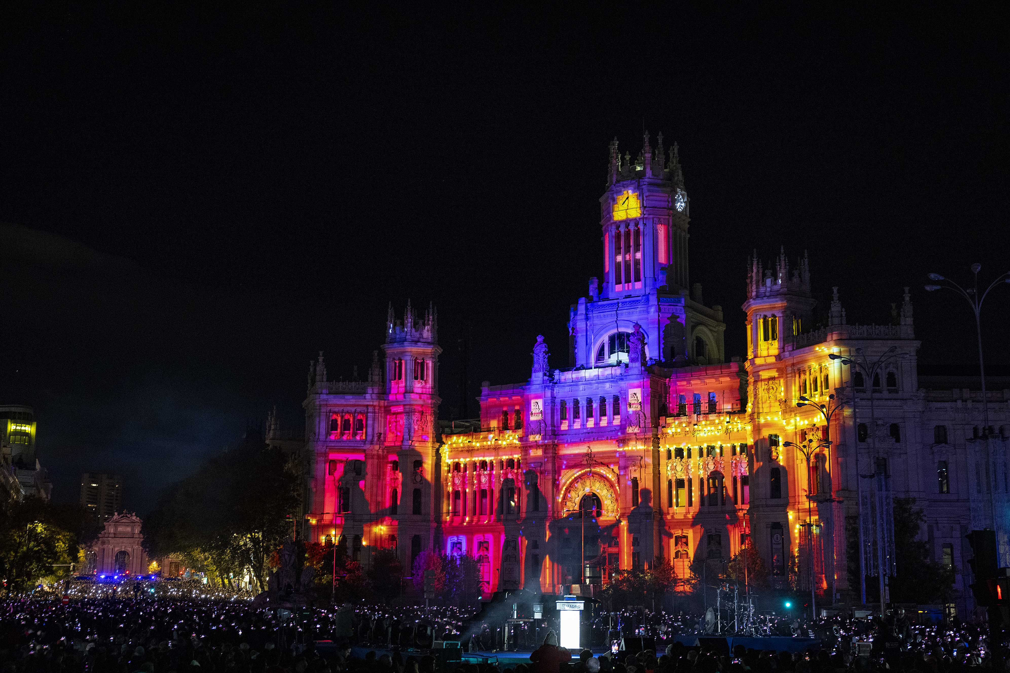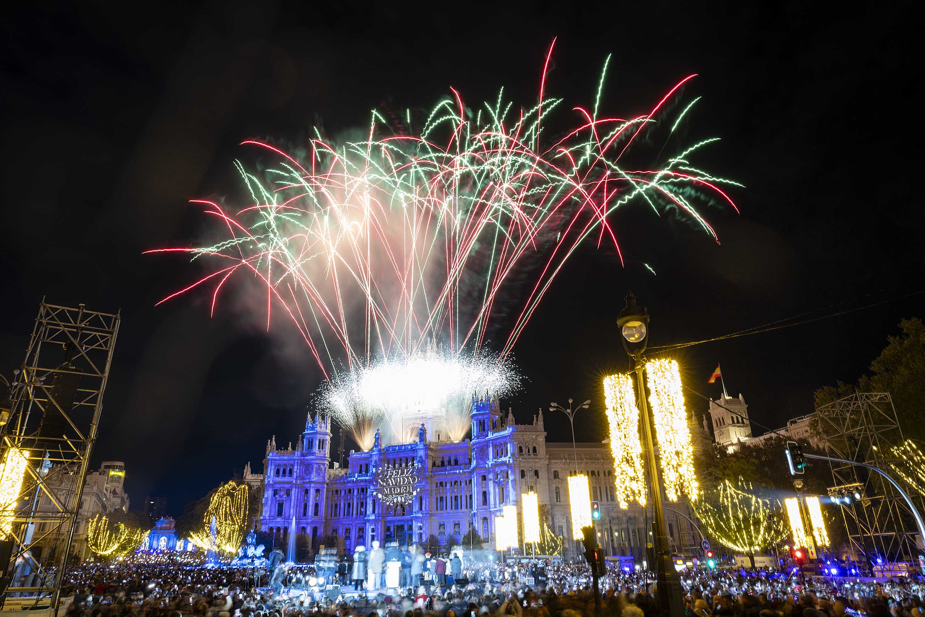 - Un videomapping proyectado sobre la fachada del Palacio de Cibeles ha dado paso al acto de encendido, que ha concluido con un espectáculo piromusical
