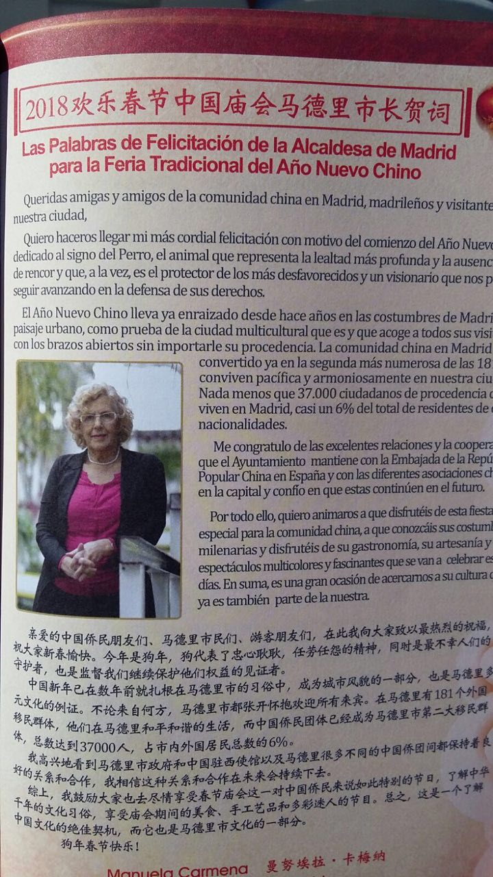 Esta Feria Tradicional forma parte del conjunto de celebraciones en las que, durante las dos semanas precedentes, el Ayuntamiento de Madrid está participando con un amplio programa de actividades y eventos. Programa, que como viene siendo habitual, ha contado con la colaboración de asociaciones, colectivos artísticos, vecinos y vecinas, el Instituto Confucio y la Embajada de China. Hasta ahora el Ayuntamiento de Madrid ha estado presente en las diferentes ceremonias tradicionales, artesanía, conciertos, talleres, pasacalles, ferias y rutas gastronómicas. Durante casi un mes ha podido degustarse té o lo mejor de su gastronomía, dejando un fantástico sabor de boca para la próxima fiesta de la primavera, que corresponderá al Año del Cerdo de Tierra./