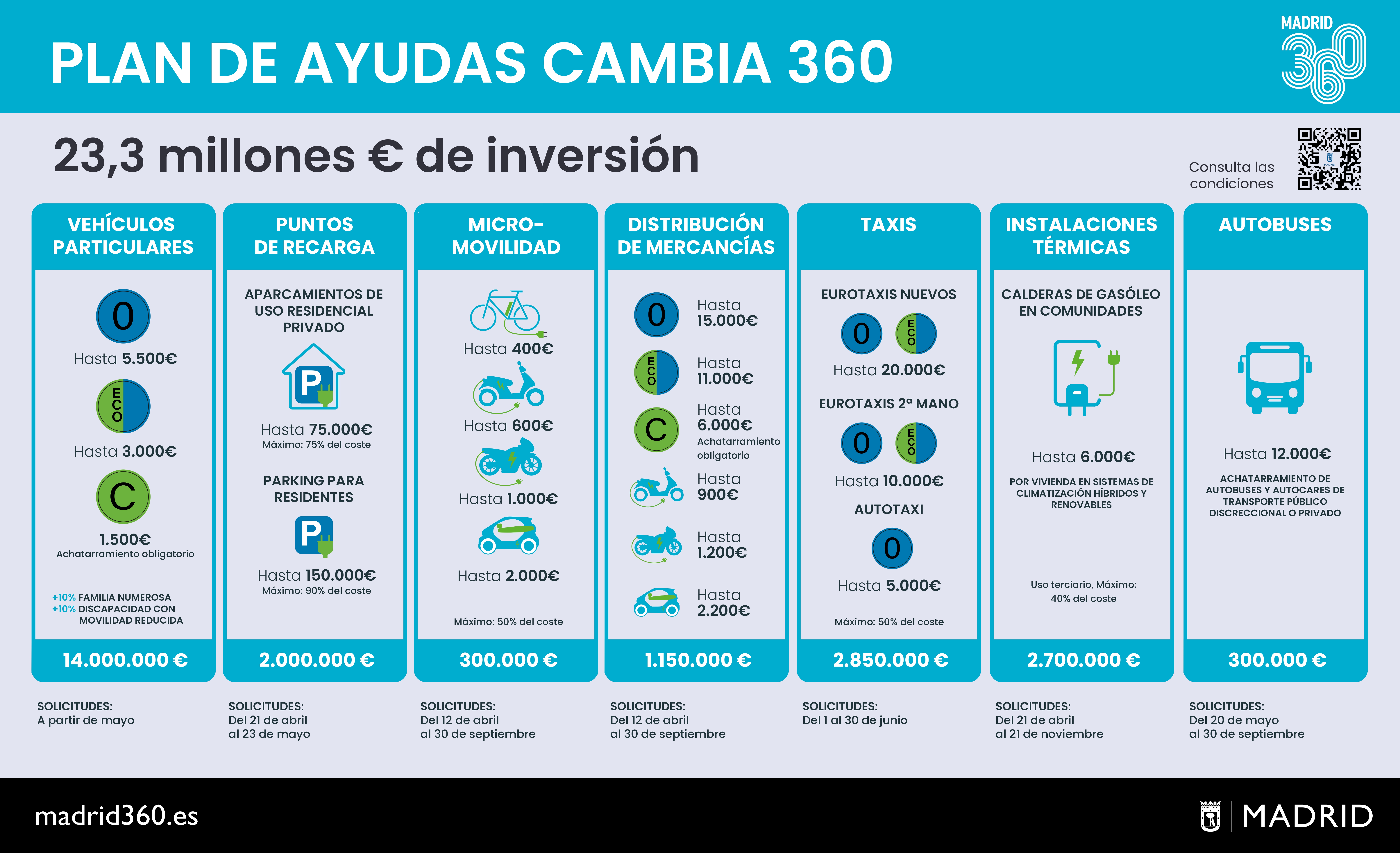 En total, el Ayuntamiento de Madrid destinará este ejercicio 9,8 millones de euros para las diferentes convocatorias, ampliables hasta los 23,3 millones. Desde el año 2019, se han asignado más de 117,3 millones de euros a las Ayudas Cambia 360. El 76 % han sido para la adquisición de vehículos particulares (44,15 %) y para la renovación de instalaciones térmicas (31,88 %).