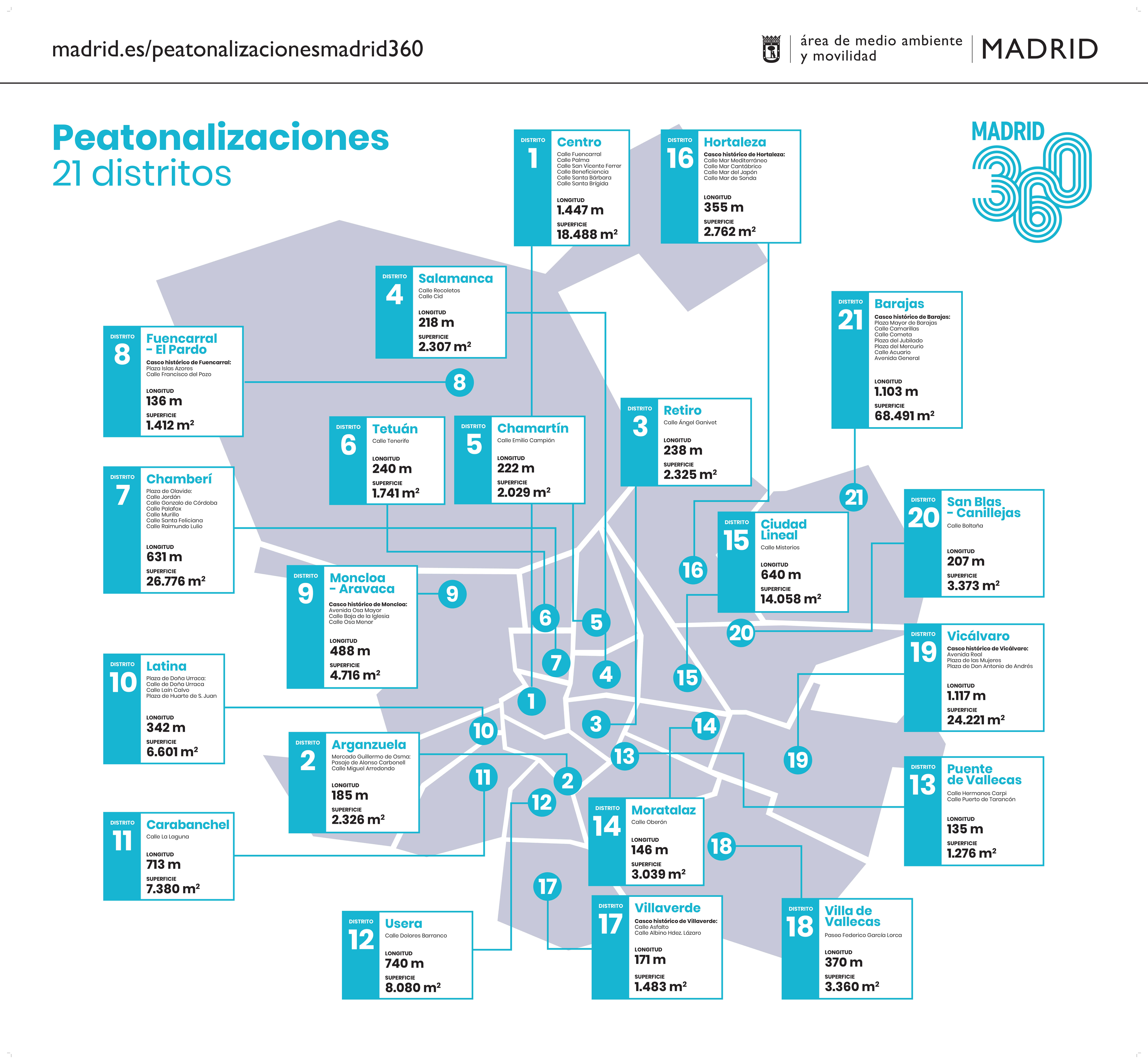 Los distritos que ganarán más espacio para el peatón serán Barajas (68.491 m2), Chamberí (26.766 m2), Vicálvaro (24.221 m2), Centro (18.488 m2), Ciudad Lineal (14.058 m2) y Usera (8.080 m2) seguidos de Latina (6.601 m2), Moncloa-Aravaca (4.716 m2), Carabanchel (4.586 m2), San Blas-Canillejas (3.372 m2), Villa de Vallecas ( 3.360 m2), Moratalaz (3.039 m2), Hortaleza (2.762 m2), Arganzuela (2.326 m2), Retiro (2.325 m2), Salamanca (2.307 m2), Chamartín (2.029 m2), Tetuán (1.741 m2), Villaverde (1.483 m2), Fuencarral-El Pardo (1.412 m2) y Puente de Vallecas (1.276 m2).