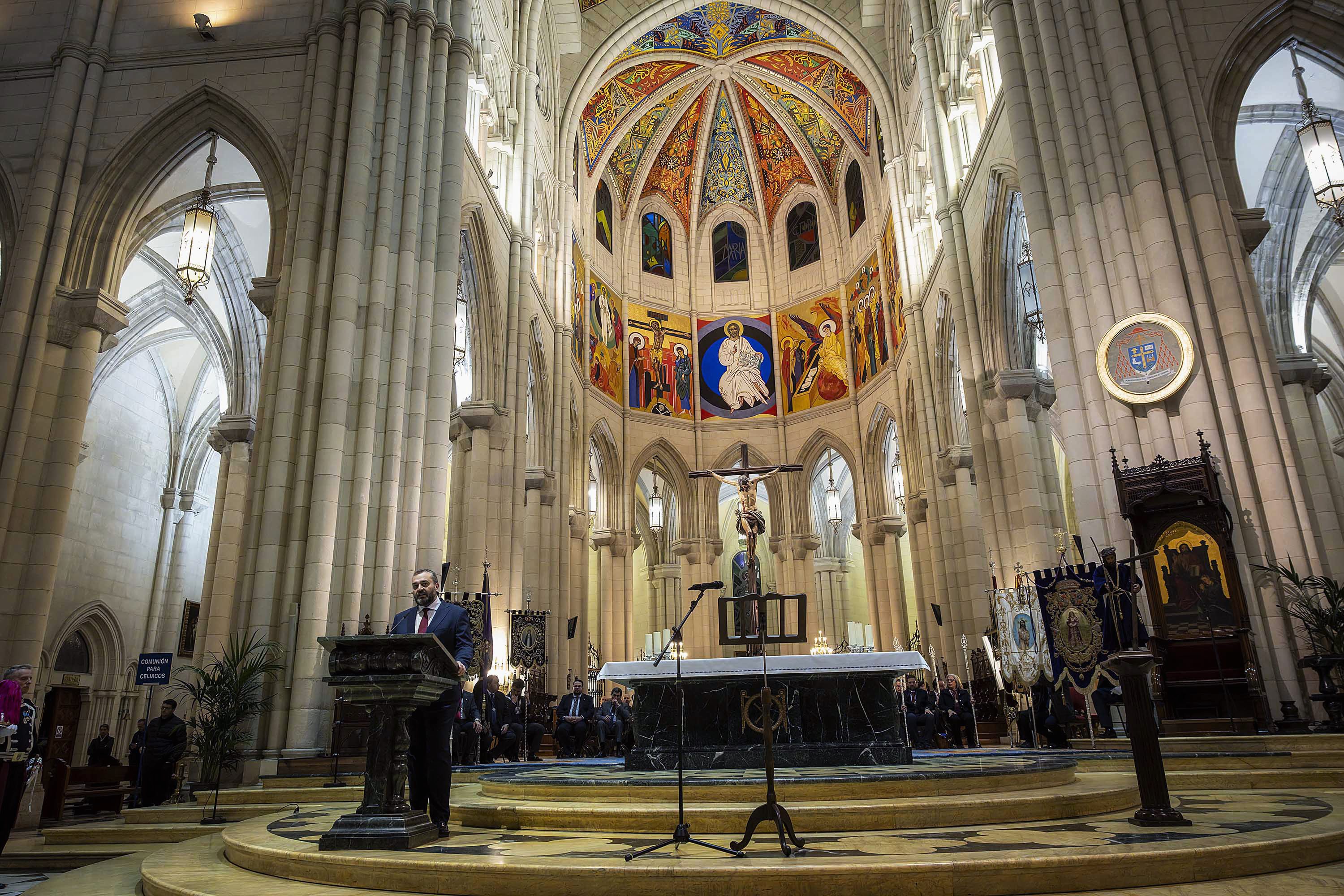 Los miembros de las hermandades y cofradías, encabezados por sus respectivos estandartes, formaron un cortejo solemne que partió de la calle Mayor hacia la Catedral de la Almudena, en donde el concejal de Centro recordó que la Semana Santa “no es solo tradición o patrimonio cultural, sino también la expresión viva de la cristiandad que ha marcado nuestra historia, nuestras calles y nuestra manera de entender la comunidad”.