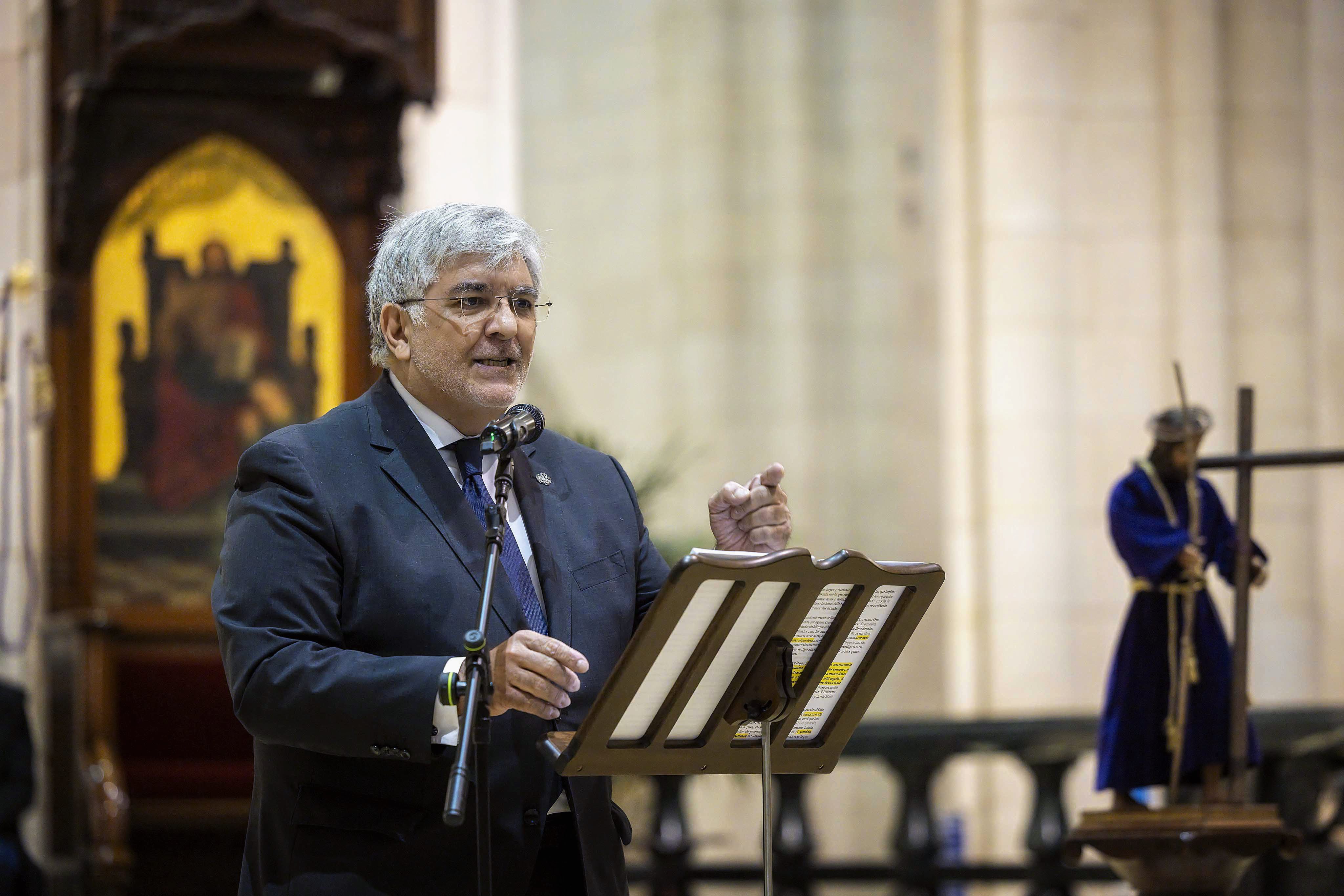 En presencia del cardenal arzobispo de Madrid, José Cobo, el encargado de pronunciar el pregón fue Juan Manuel Venegas, de la Hermandad del Santísimo Cristo de la Fe y del Perdón y de María Santísima Inmaculada Madre de la Iglesia y Arcángel San Miguel (Los Estudiantes). El pregonero realizó un emotivo recorrido cronológico e íntimo por la Semana Santa madrileña en el que combinó verso, prosa y prosa versificada. Venegas destacó, entre otros hitos, el Viernes del Señor con los Cristos de El Gran Poder, El Divino Cautivo, El Pobre y Medinaceli. Y recordó las procesiones desde el Viernes de Dolores al Domingo de Resurrección, poniendo en valor la autenticidad y devoción con la que se vive la Semana Santa madrileña, así como la riqueza histórica de sus hermandades.