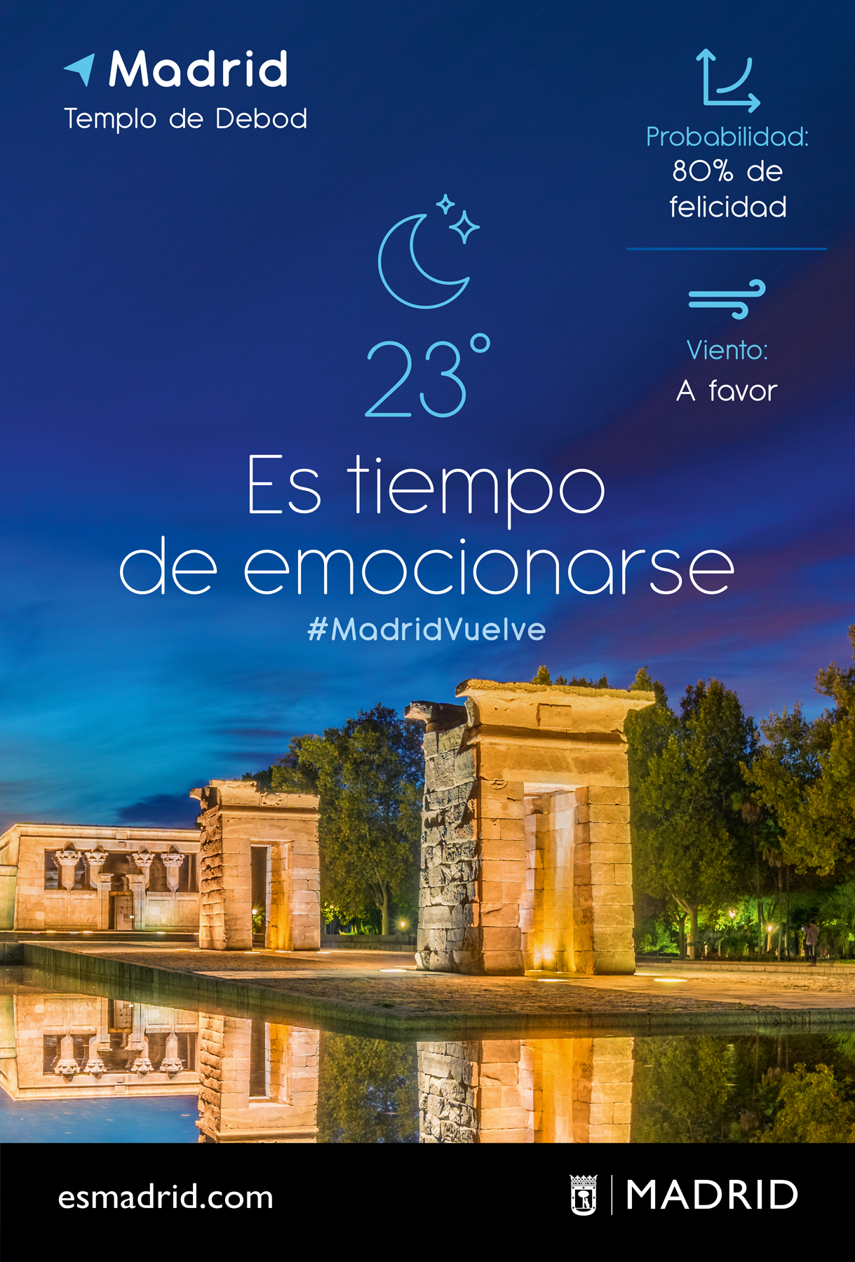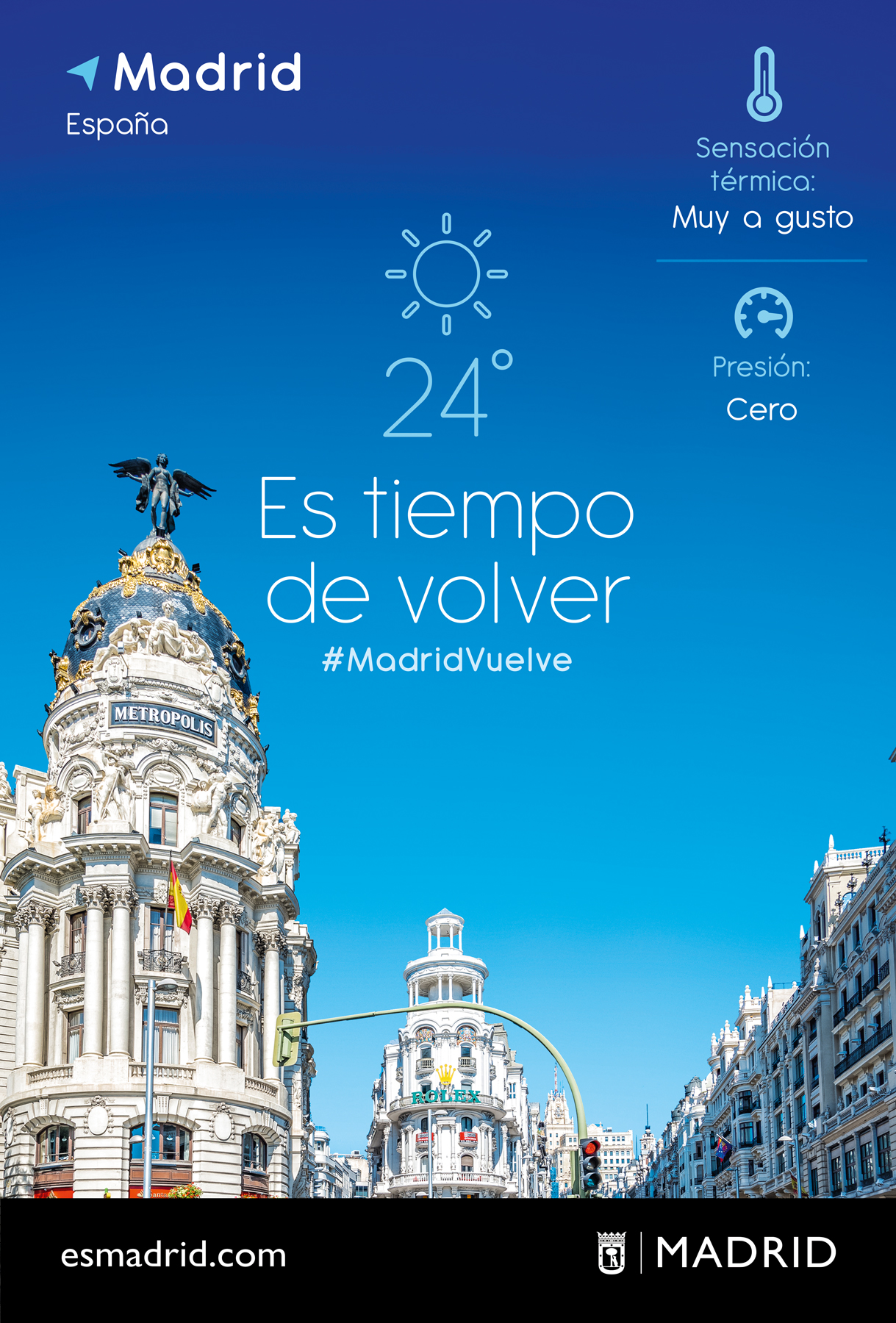 Inspiradas en el concepto ‘Es tiempo de’, las creatividades de esta campaña recrean una pantalla con información meteorológica, con los diferentes iconos de temperatura, viento y sensación térmica. Unos iconos que, en esta ocasión, sirven para medir las sensaciones y emociones que el madrileño y el visitante pueden sentir y experimentar en la ciudad: ‘Sensación térmica: muy a gusto’, ‘Probabilidad: 80 % de felicidad’, ‘Presión: cero’, etc.