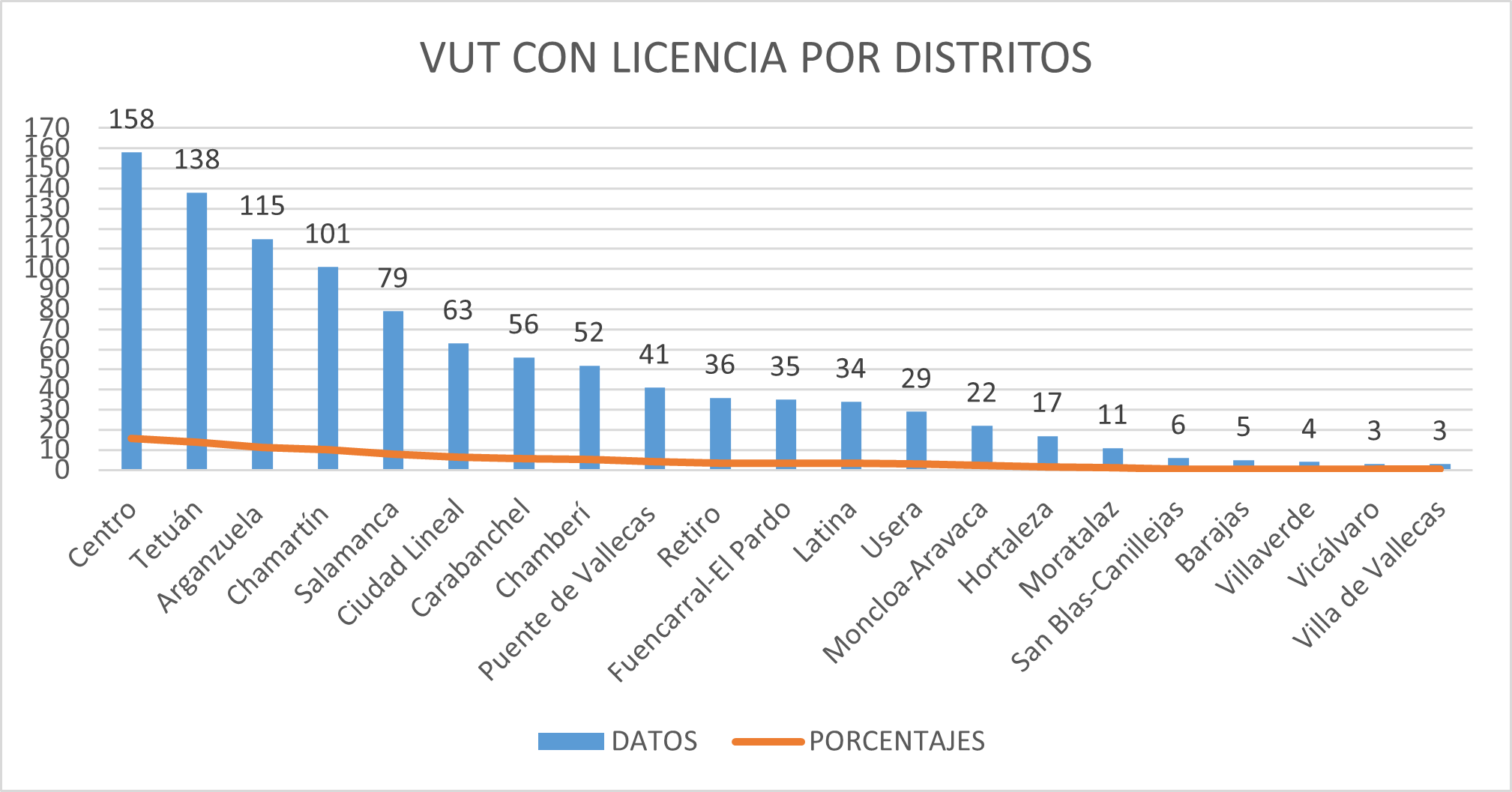 Del millar de VUT que funcionan con licencia, el 15,67 % se localiza en el distrito Centro (158), el 13,69 %, (138) en Tetuán; el 11,4 % (115), en Arganzuela; el 10 % (101), en Chamartín; el 7,83 % (79), en Salamanca; el 6,25 % (63), en Ciudad Lineal; el 5,55 % (56), en Carabanchel; el 5,15 % (52), en Chamberí; el 4 % (41), en Puente de Vallecas; el 3,57 % (36), en Retiro; el 3,47 % (35), en Fuencarral-El Pardo; el 3,37 % (34), en Latina; el 2,87 % (29), en Usera; el 2,18 % (22), en Moncloa-Aravaca; el 1,68 % (17), en Hortaleza; el 1 % (11), en Moratalaz; el 0,59 % (6), en San Blas-Canillejas; el 0,49 % (5), en Barajas; el 0,39 % (4), en Villaverde; el 0,29 % (3), en Vicálvaro, y el mismo porcentaje (3), en Villa de Vallecas.