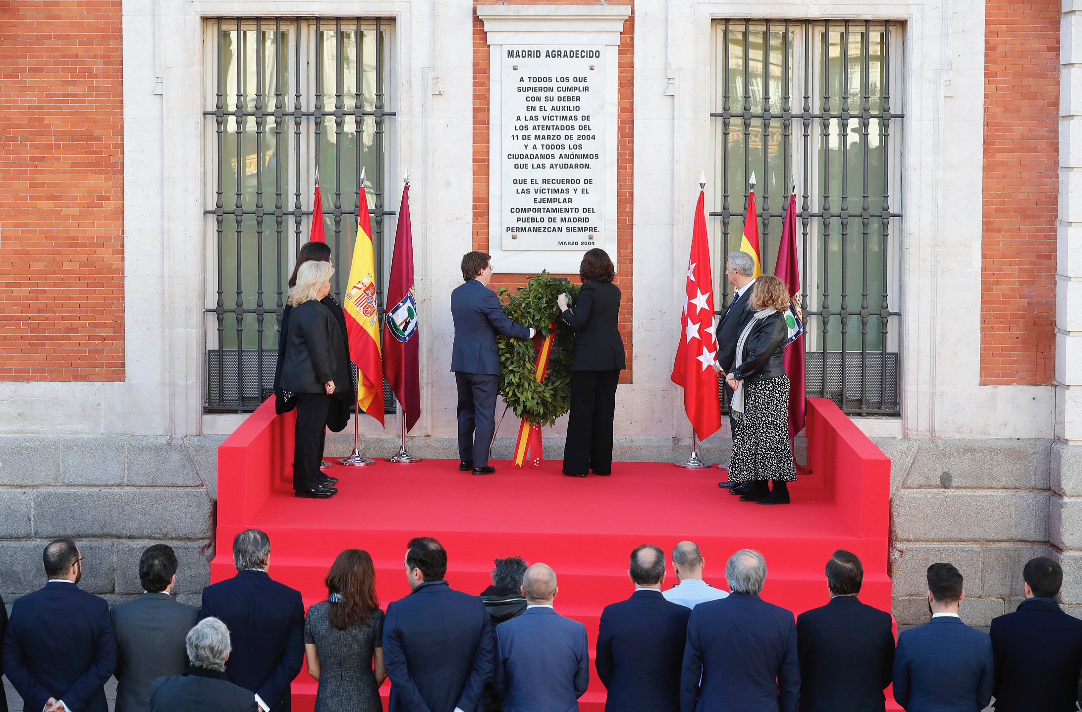 Los asistentes han guardado cinco minutos de silencio bajo el tañido de las campanas de la Real Casa de Correos, donde se ha depositado una corona de laurel junto a la placa en conmemoración a los fallecidos. Almeida ha elogiado el “ejemplar comportamiento que tuvo el pueblo de Madrid en aquellos días trágicos para esta ciudad” y se ha mostrado convencido de que, ante la crisis del coronavirus que afecta en estos momentos la ciudad, “entre todos vamos a ser capaces de superar esta situación y de salir adelante y se dará un ejemplo como se dio aquel 11 de marzo de 2004. La ciudad de Madrid unida puede con cualquier adversidad”, ha subrayado.