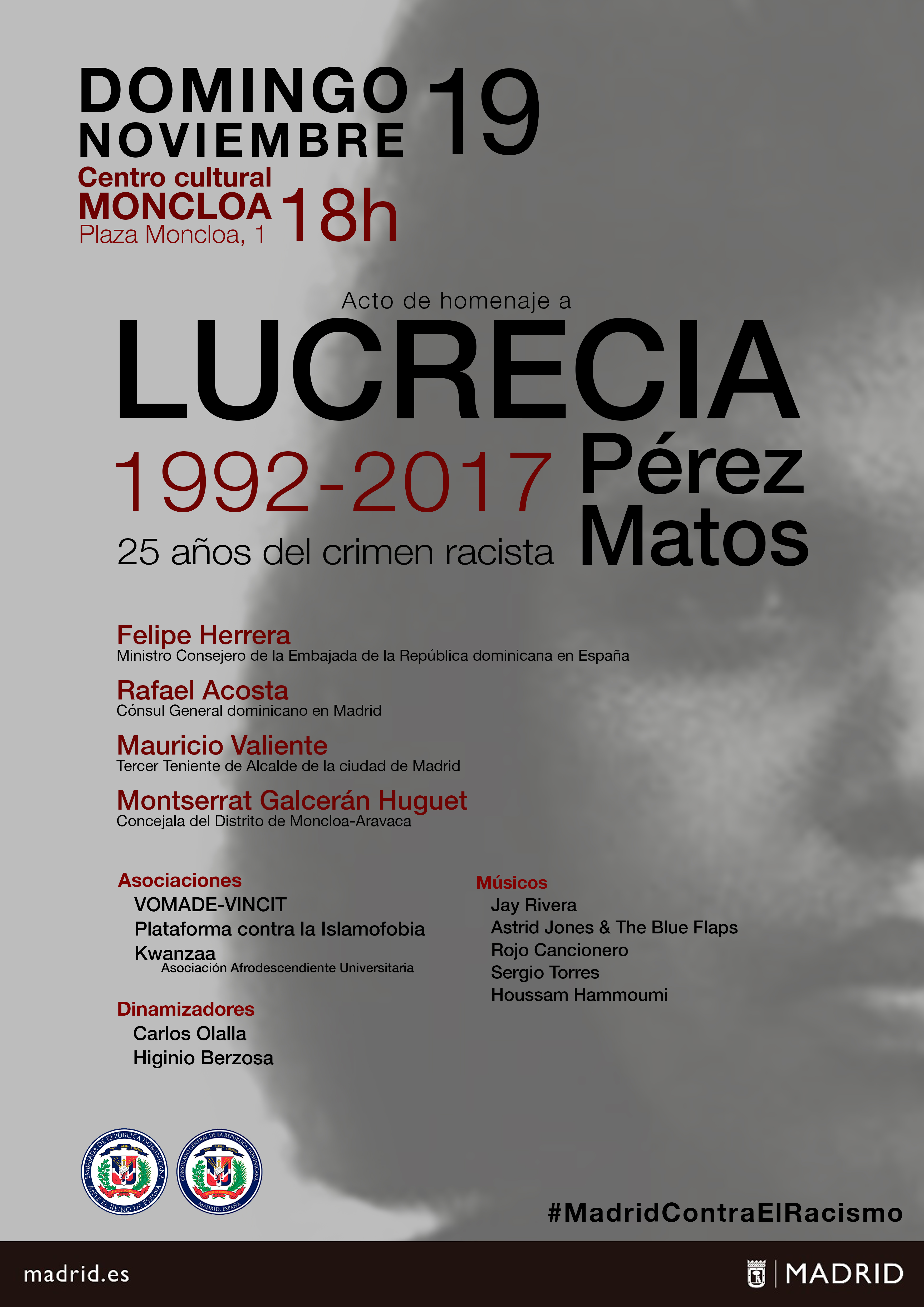El Ayuntamiento de Madrid recuerda a Lucrecia Pérez Matos 25 años después del crimen racista sucedido el 13 de noviembre de 1992 en Aravaca a manos de un grupo de extrema derecha. Lucrecia Pérez Matos fue la primera víctima oficialmente reconocida de xenofobia en el Estado español.