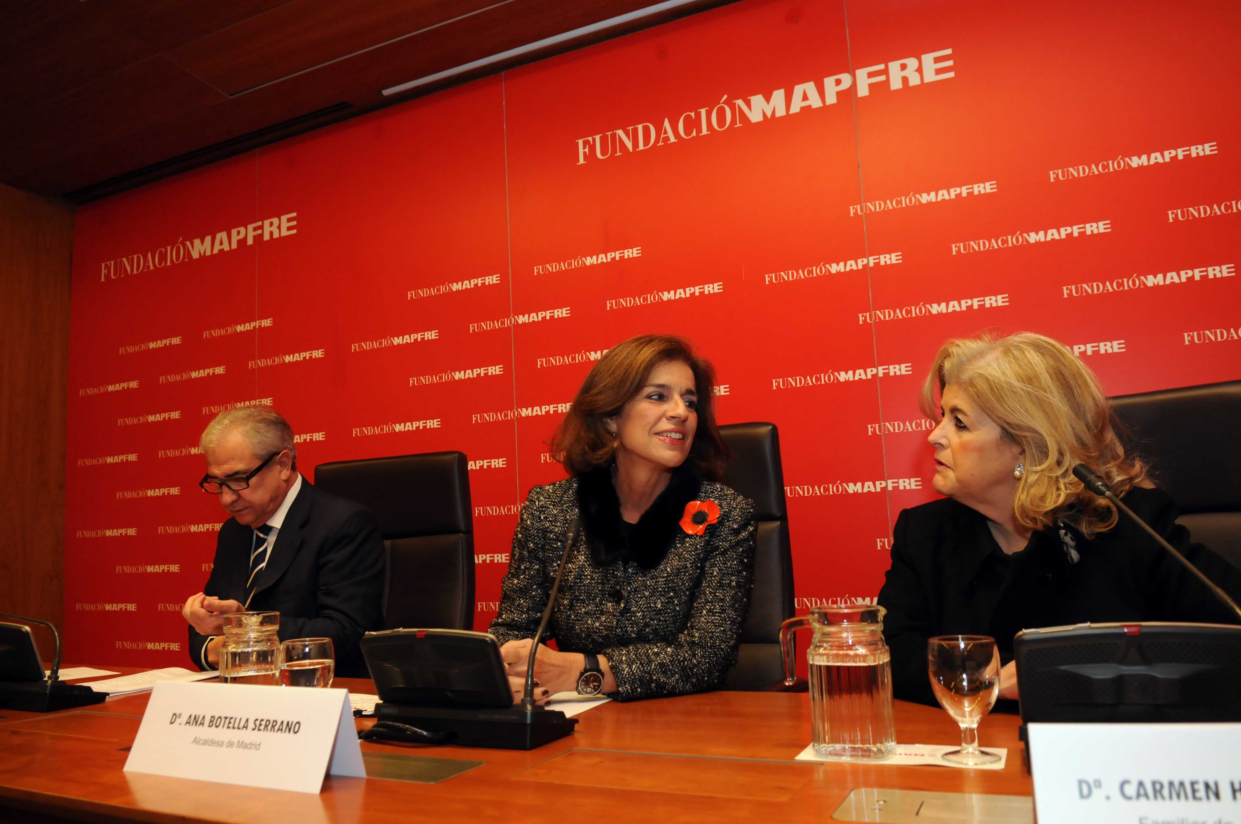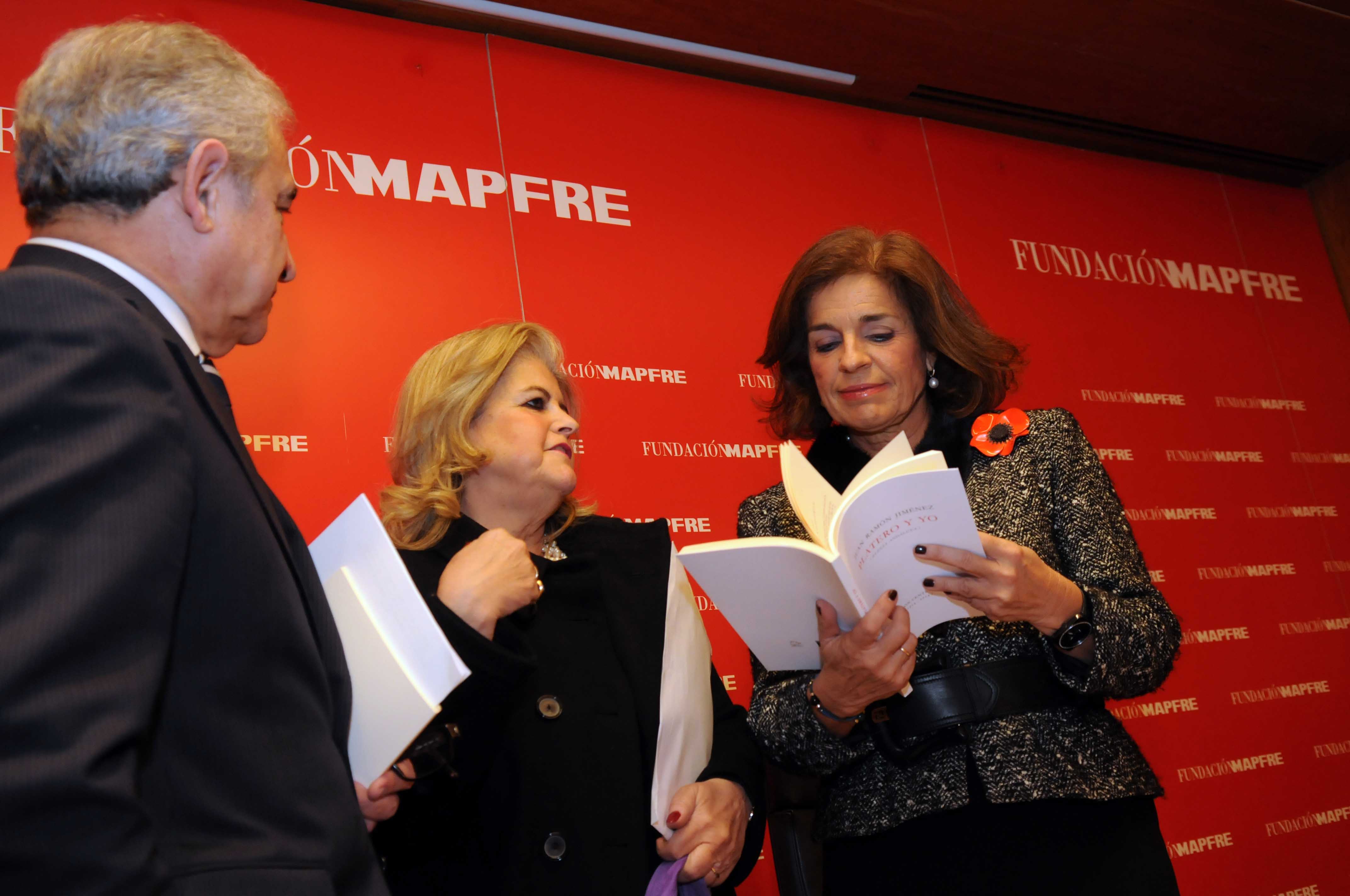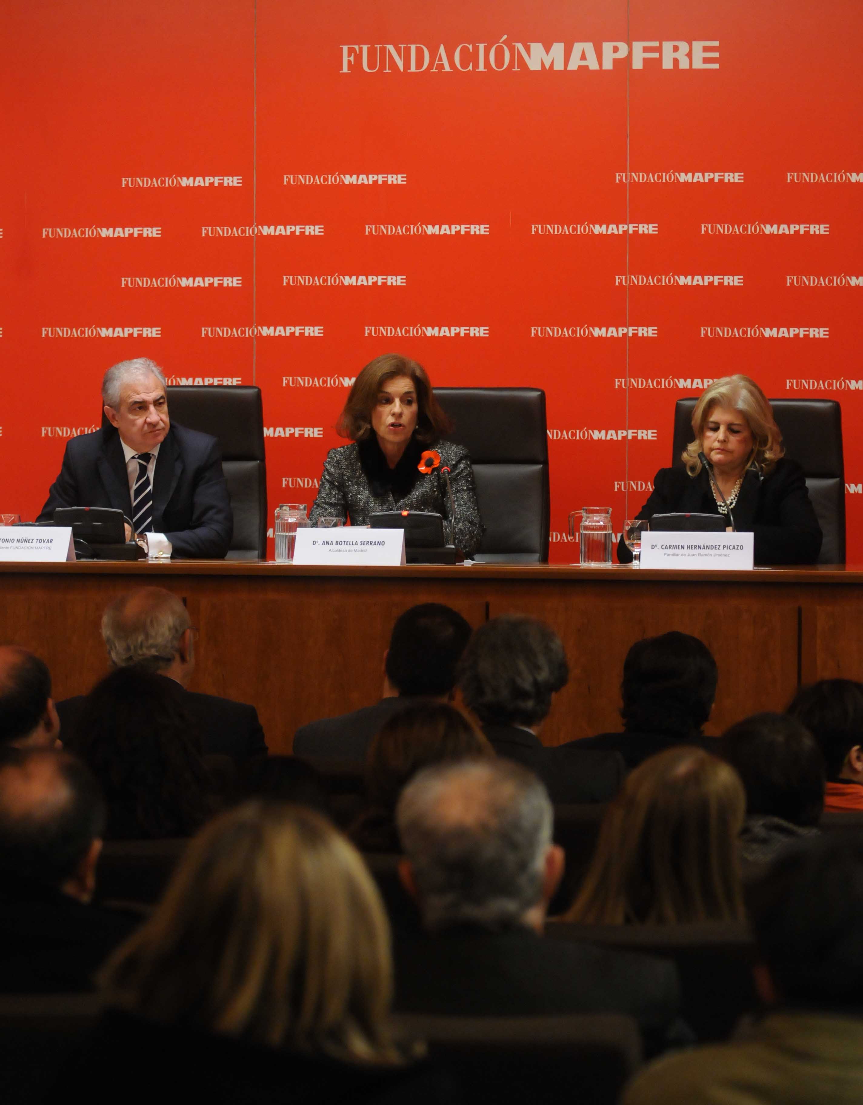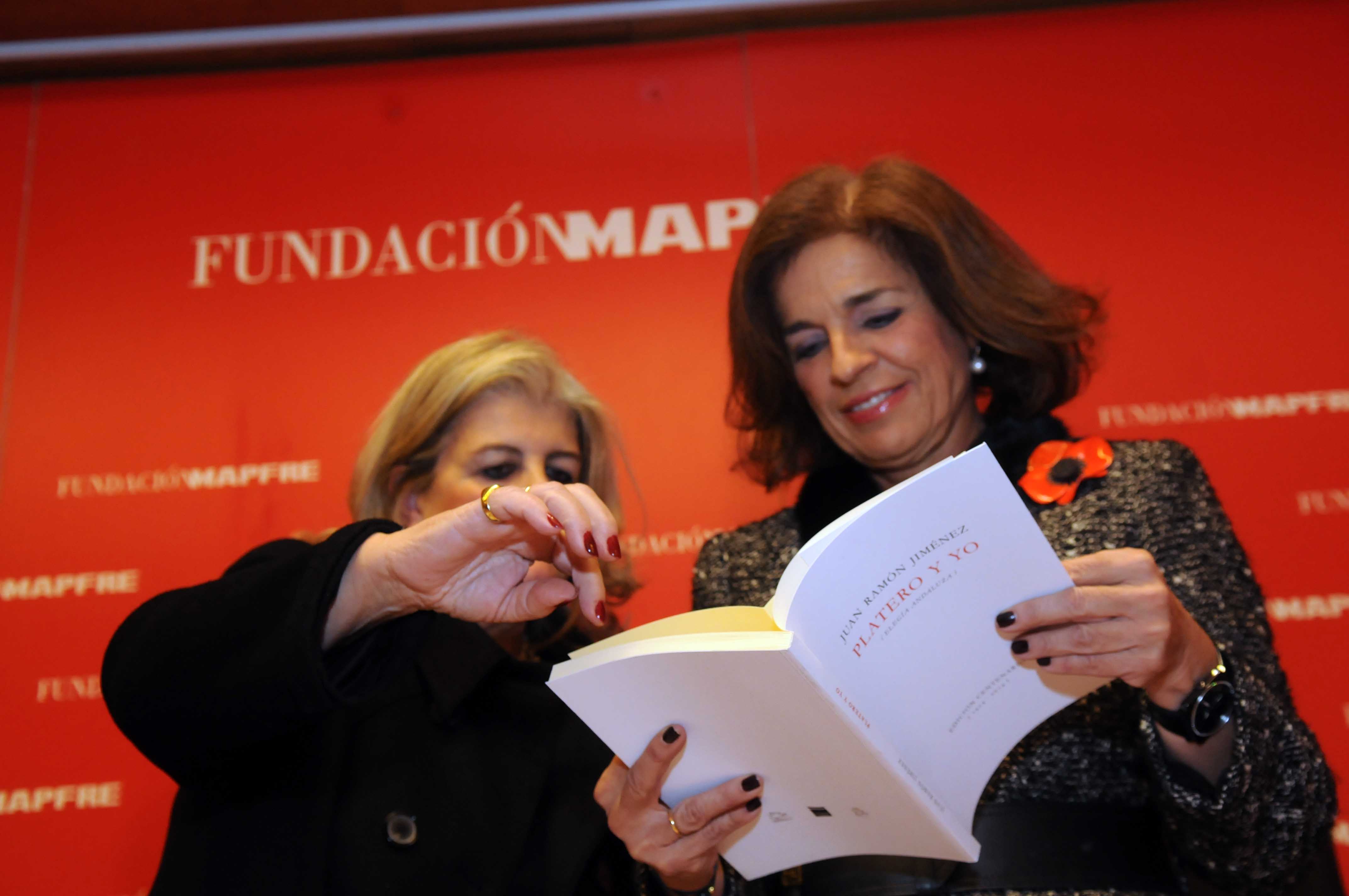 En las imágenes, la alcaldesa de Madrid, Ana Botella, durante el descubrimiento de la placa en homenaje al libro de Juan Ramón Jiménez, "Platero y yo". Al acto también han asistido Carmen Hernández Pinzón, sobrina-nieta del poeta onubense, y el presidente de la Fundación Mapfre, Antonio Núñez Tovar.