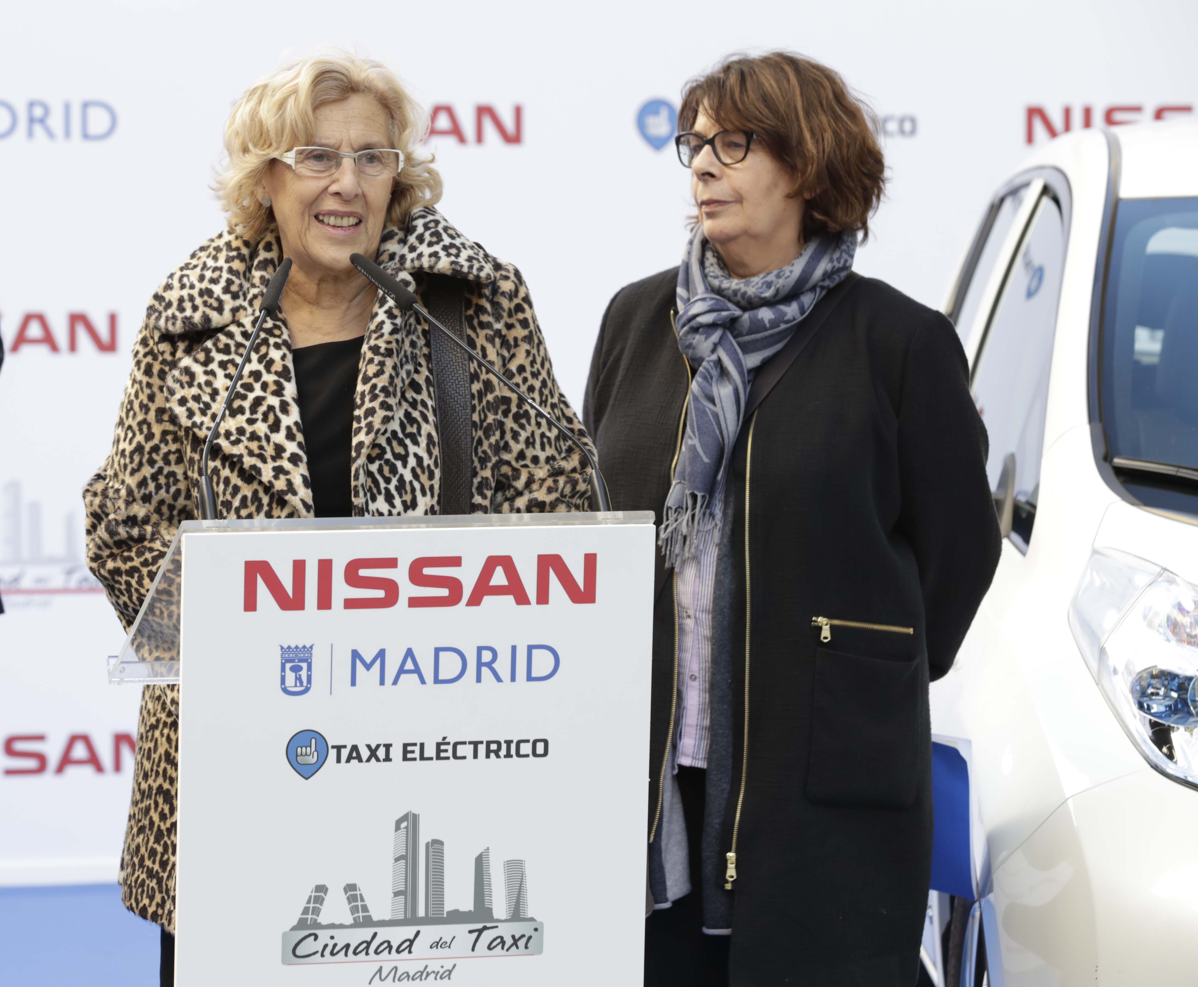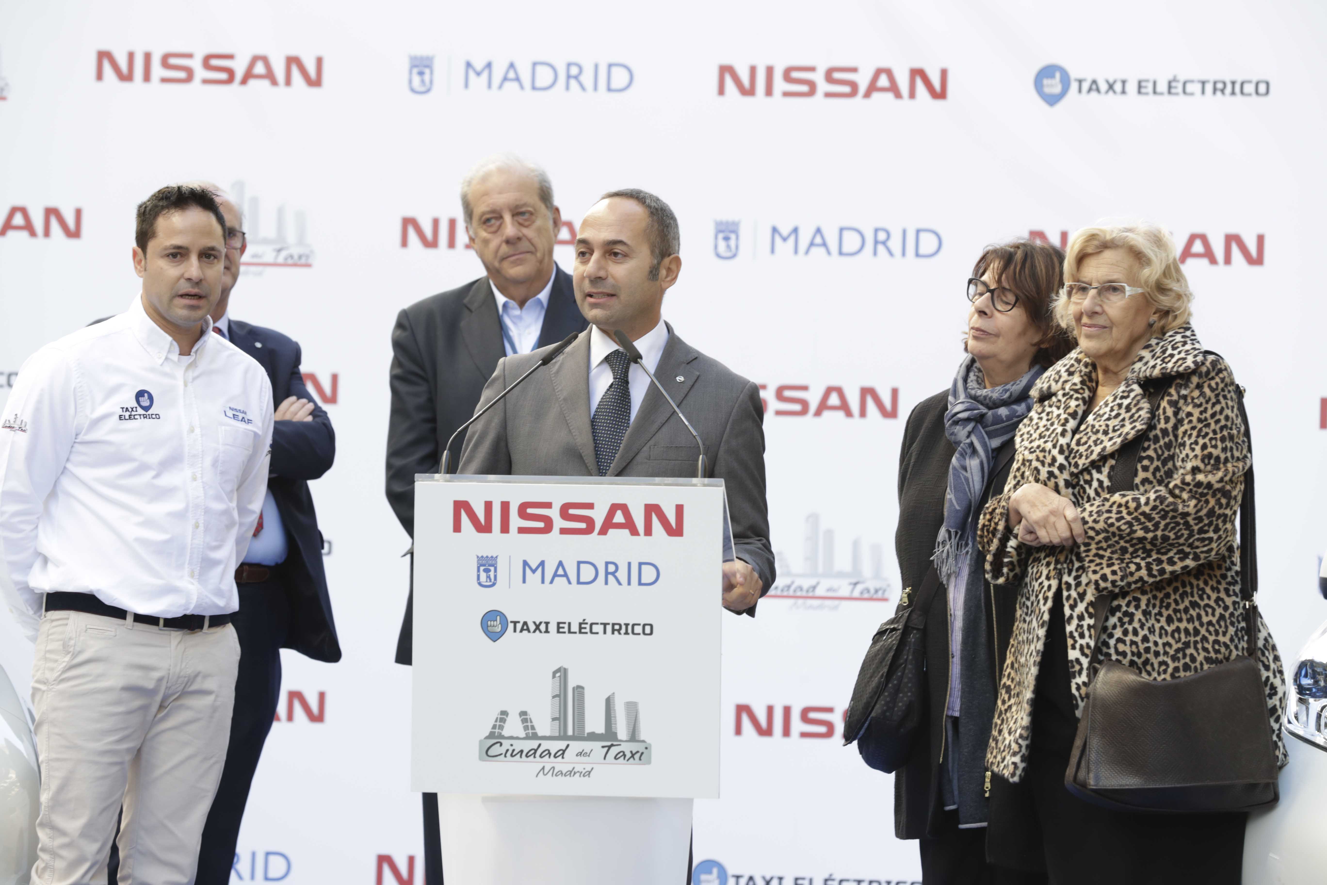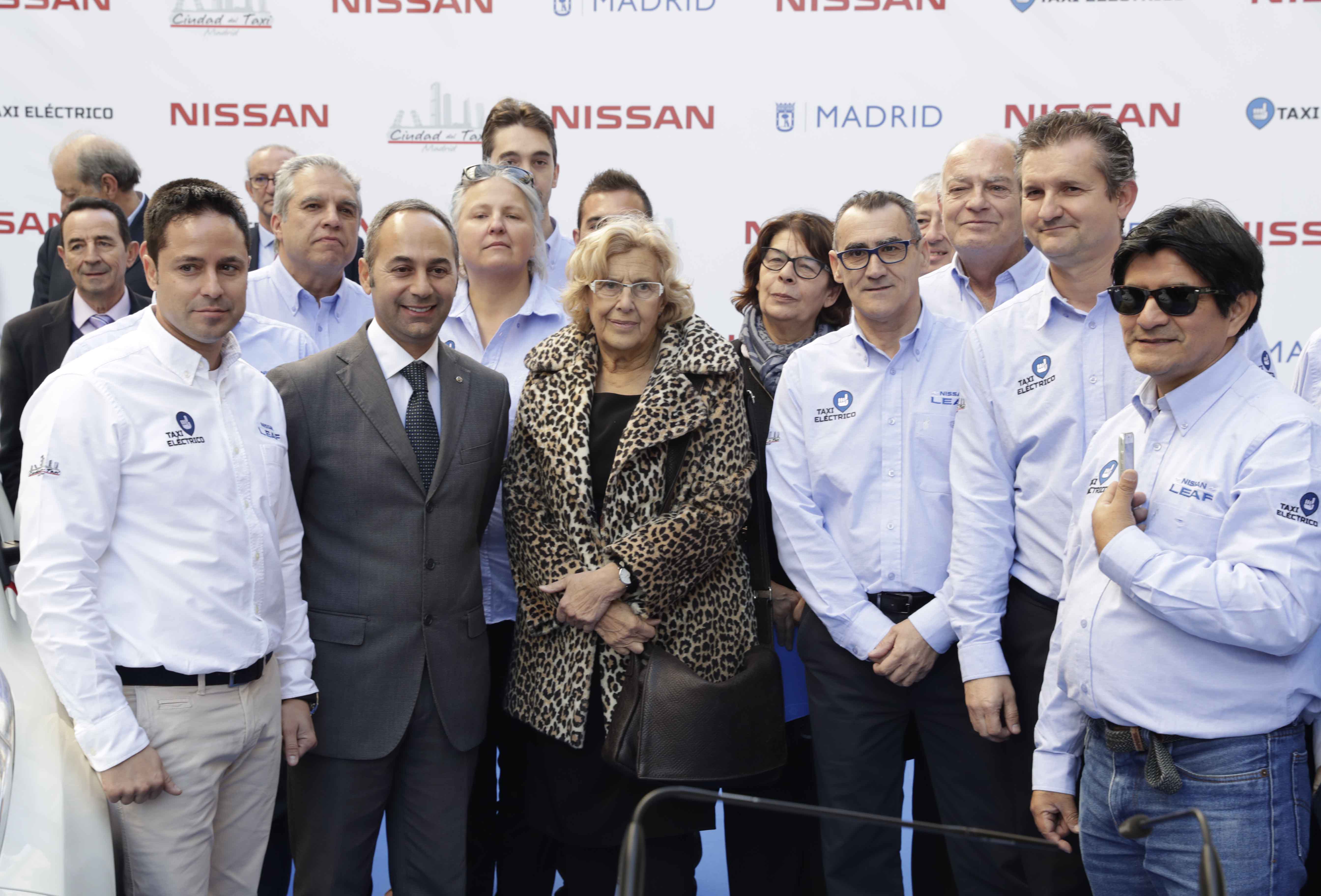 La alcaldesa de Madrid, Manuela Carmena, y la delegada del Área de Medio Ambiente y Movilidad, Inés Sabanés, han presentado la flota de los 110 taxis eléctricos, de los que 23 ya circulan por la ciudad. El vehículo seleccionado es el NISSAN LEAF 30 kWh, un modelo 100 por 100 eléctrico y considerado el más vendido en el mundo dentro de sus características. En el acto han estado presentes el consejero director general de Nissan Iberia, Marco Toro, y el director de La ciudad del taxi, Jesús Ramos, empresa que ha puesto en servicio los nuevos taxis.