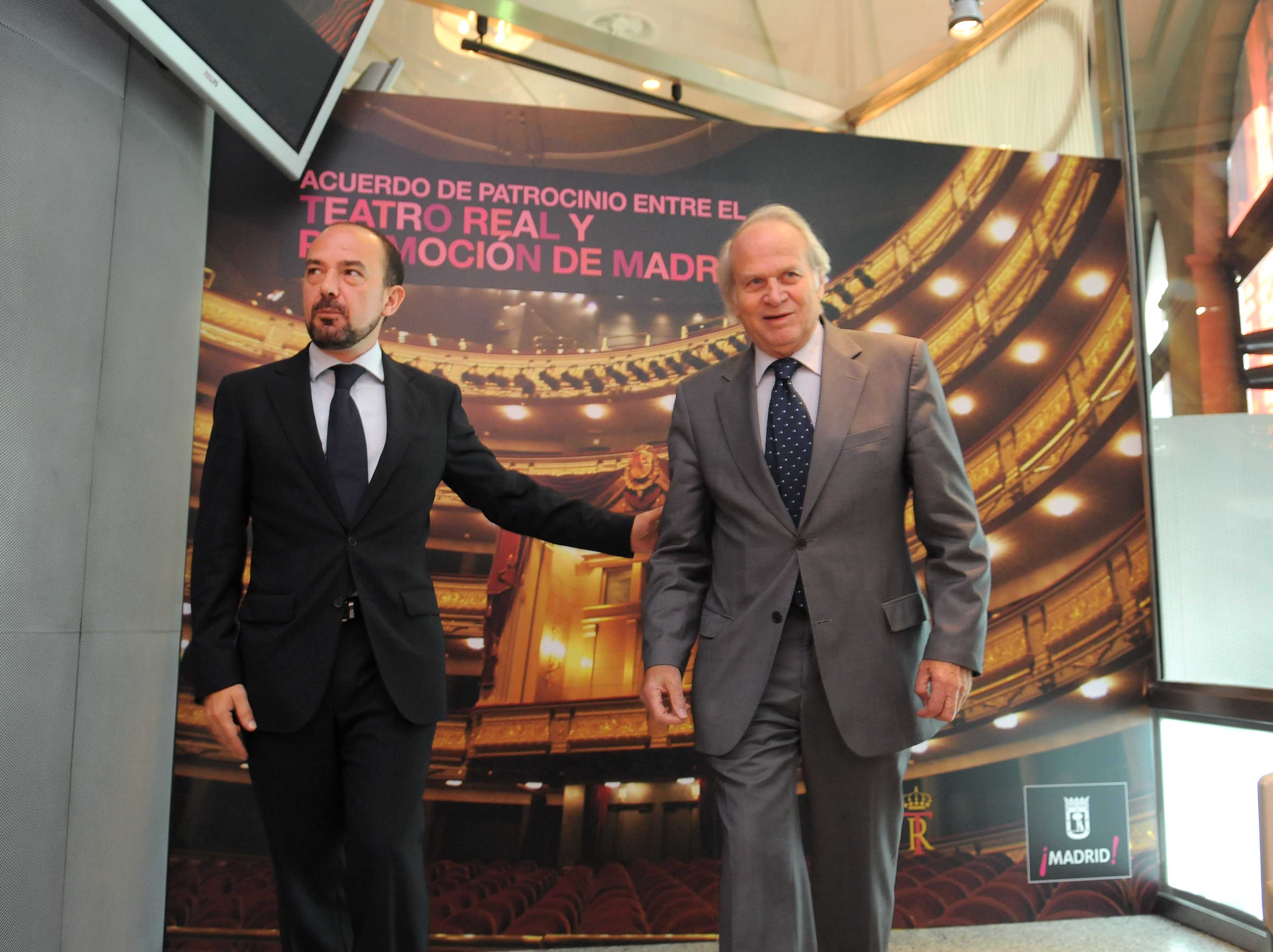 El delegado de Economía, Miguel Ángel Villanueva, y director general de la Fundación Teatro Real, Miguel Muñiz, durante la presentación del acuerdo de colaboración entre Promoción Madrid y Teatro Real