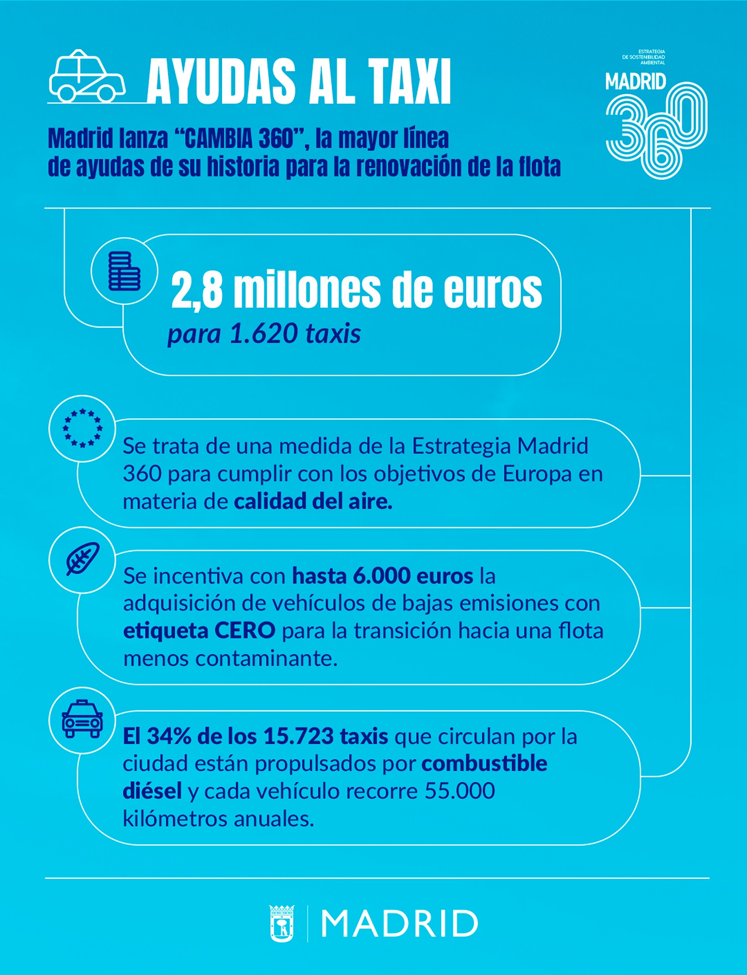 El Ayuntamiento ha aprobado hoy en Junta de Gobierno la primera línea de ayudas anunciadas en la Estrategia de Sostenibilidad Ambiental Madrid 360 para la renovación del parque circulante hacia una flota no contaminante: las subvenciones al sector del taxi, según ha informado la portavoz municipal, Inmaculada Sanz. Esta línea de ayudas se incorpora a través de la nomenclatura de la subvención CAMBIA 360 con una reserva de casi 2,8 millones de euros (2.747.000) del presupuesto del Área de Medio Ambiente y Movilidad que dirige Borja Carabante.