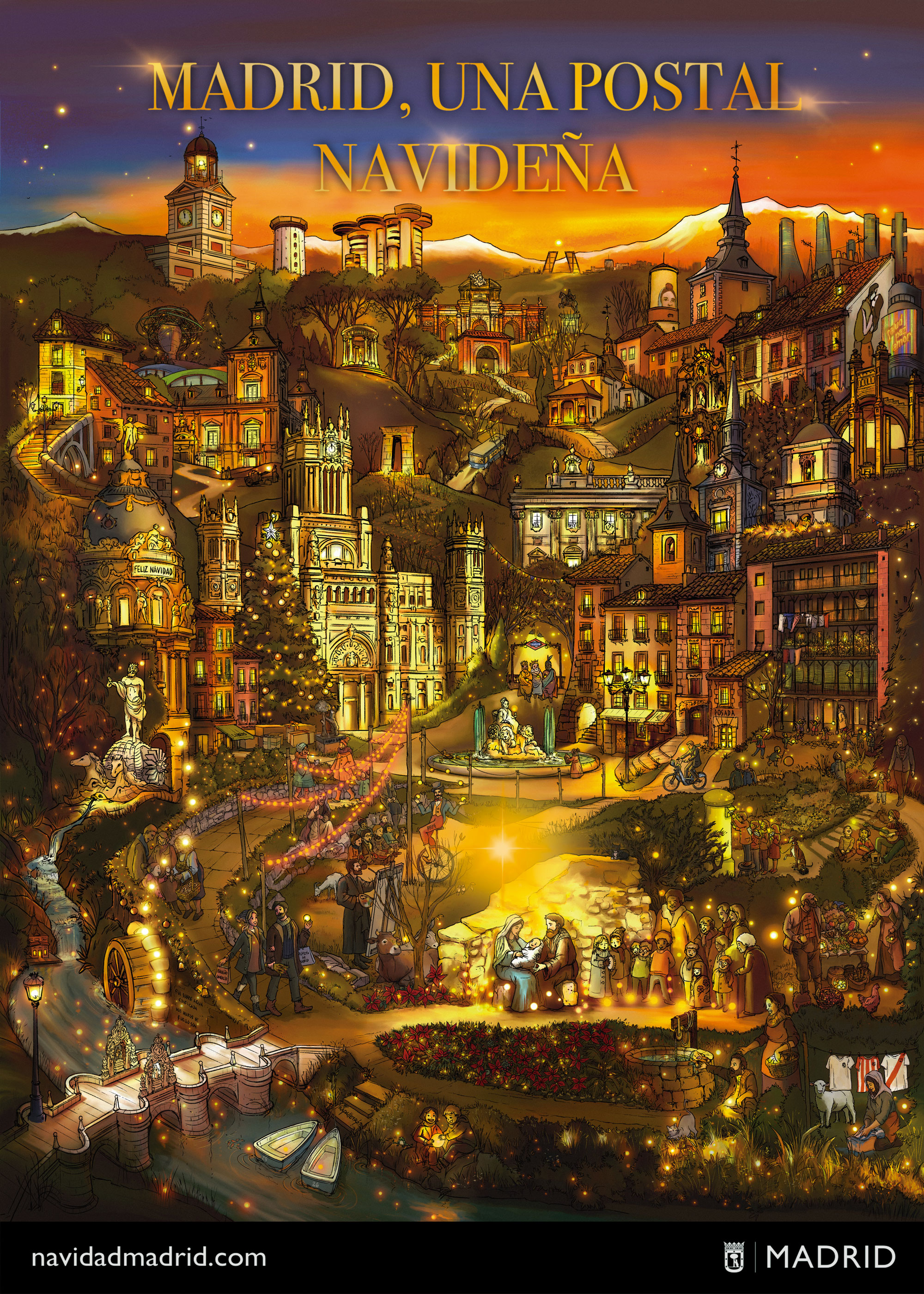 El cartel es obra del arquitecto e ilustrador Pablo García Conde, conocido como Polinho Trapalleiro, que se ha inspirado en el belén que Carlos III trajo a España y que cada Navidad puede ser contemplado en el Palacio Real de Madrid. En el cartel se muestran y esconden más de 70 ‘secretos’ de la ciudad, ambientados en una atmósfera navideña. Muchos de sus edificios más emblemáticos y otros menos conocidos, fuentes y fachadas dispuestas en ubicaciones imaginarias rinden homenaje a su patrimonio arquitectónico. Entre sus sucesivos planos y rincones aparecen diversas escenas tradicionales, cotidianas y otras mágicas. En él se hace referencia también al pequeño comercio, a los mercados, a la vida de barrio, a las artes, a la historia de Madrid y sus orígenes. Es un dibujo lleno de guiños y detalles de Madrid, con la intención de que madrileños y visitantes se detengan estas Navidades frente al cartel para ir descubriendo cada uno de sus secretos.
