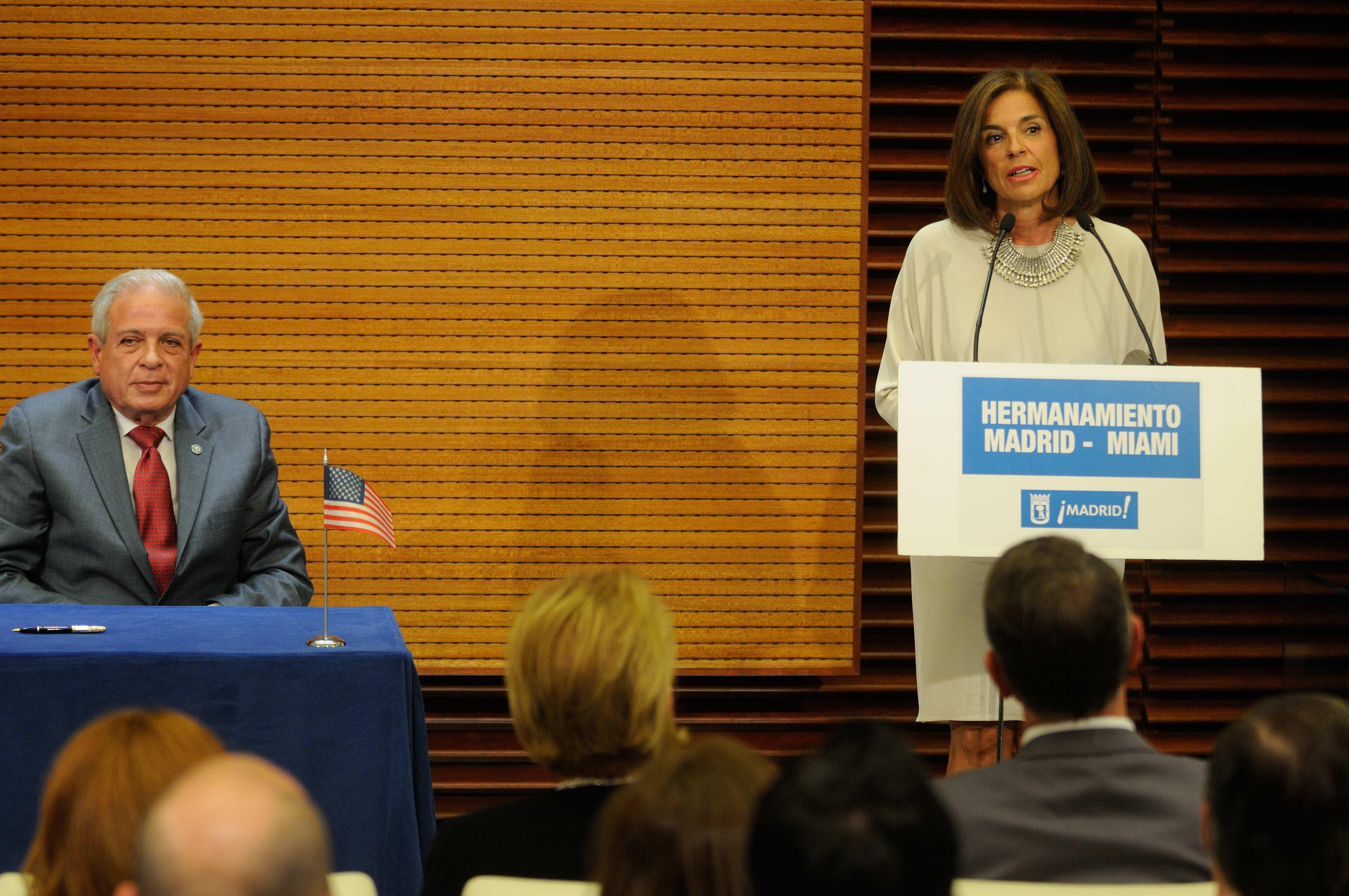 Ana Botella y Tomás Regalado, alcaldes de Madrid y Miami, respectivamente, han rubricado hoy una declaración de hermanamiento, que supone, en palabras de la regidora madrileña, formalizar lo que "hace ya mucho tiempo es una realidad: la buena sintonía, el afecto, la coincidencia de intereses y los profundos lazos culturales, históricos, humanos y económicos", que mantienen ambas ciudades. Y sobre todos ellos, Botella destacó, "el legado integrador y pujante de nuestro idioma español, un tesoro de valor inconmensurable que compartimos con una comunidad de 500 millones de personas en el mundo". "Estamos unidos -añadió- por el idioma, por una historia común y también por los valores de libertad y solidaridad que nos han traído hasta aquí".