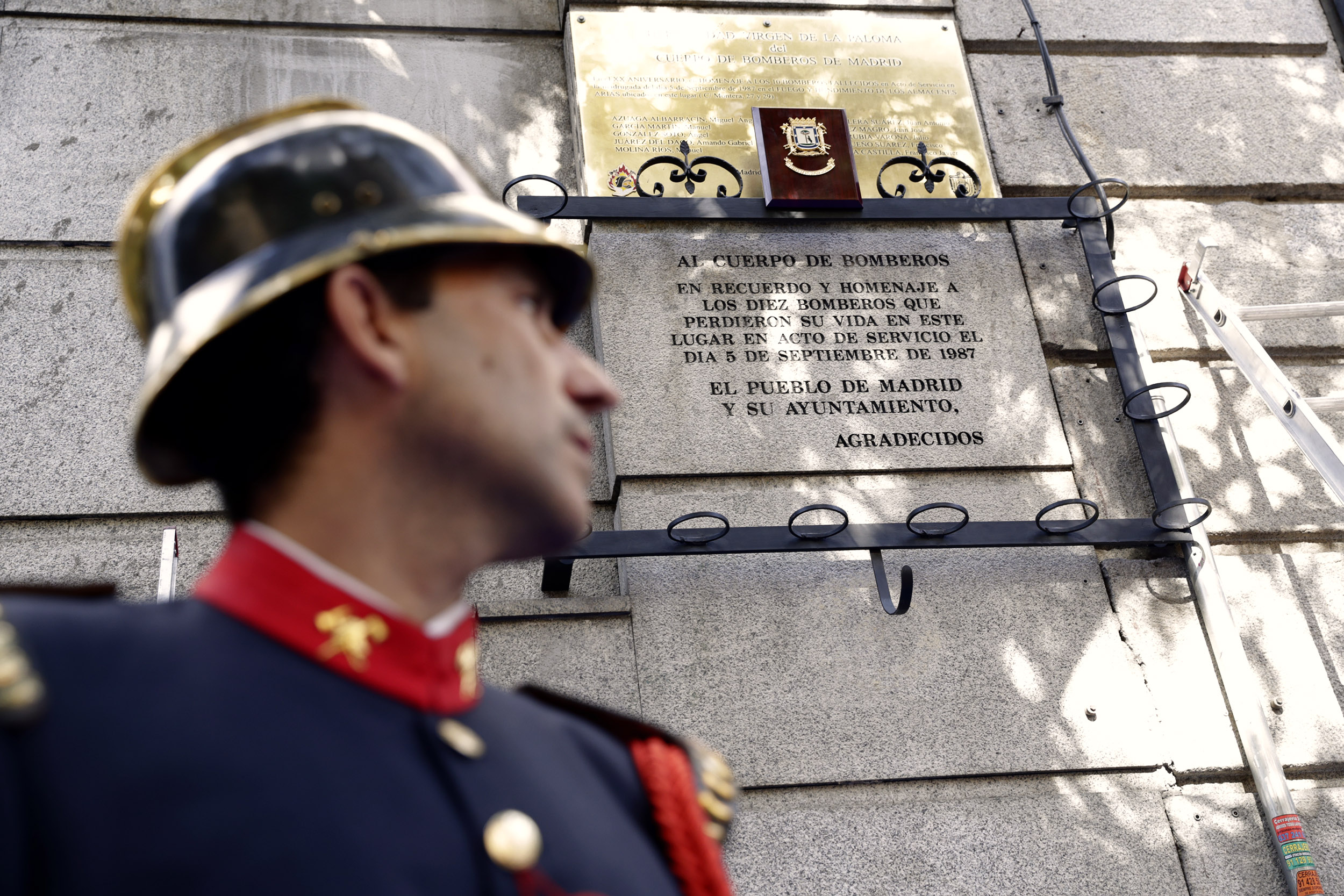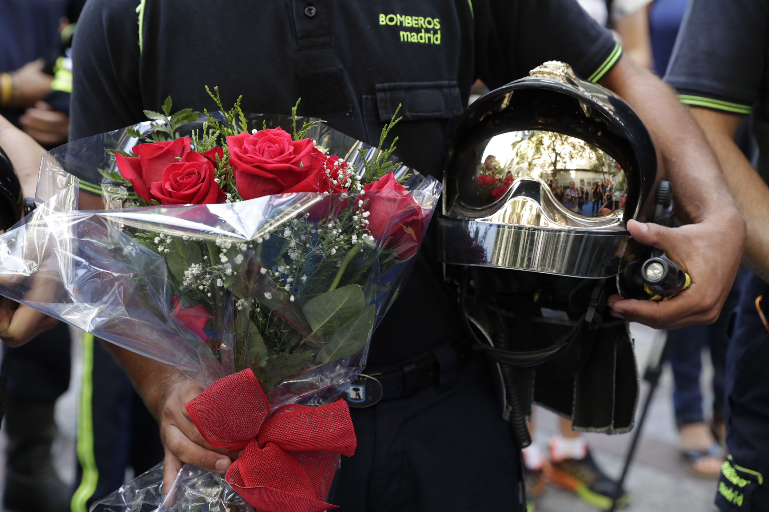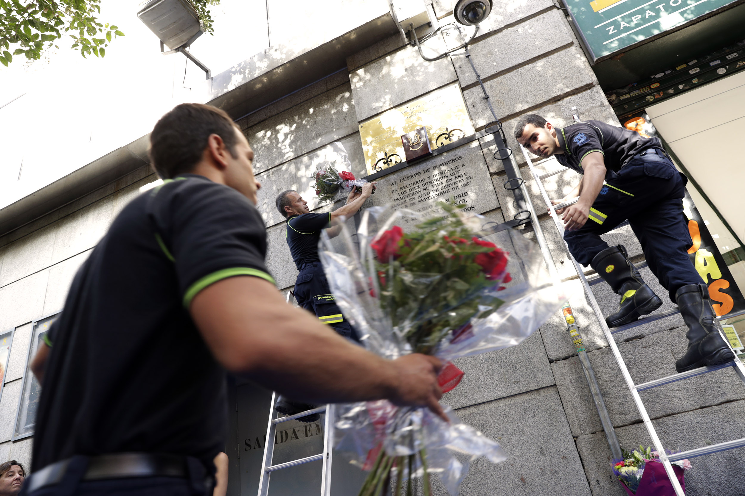 El homenaje del Cuerpo de Bomberos, del Ayuntamiento de Madrid y, en general, de toda la ciudadanía, ha empezado con una ofrenda floral: doce bomberos, uno por cada parque madrileño, han colocado ramos de rosas rojas en honor de los compañeros perdidos en torno a la placa que los recuerda con sus nombres y apellidos. A continuación, Javier Barbero, acompañado por otros dos bomberos, ha colocado una corona de laurel.