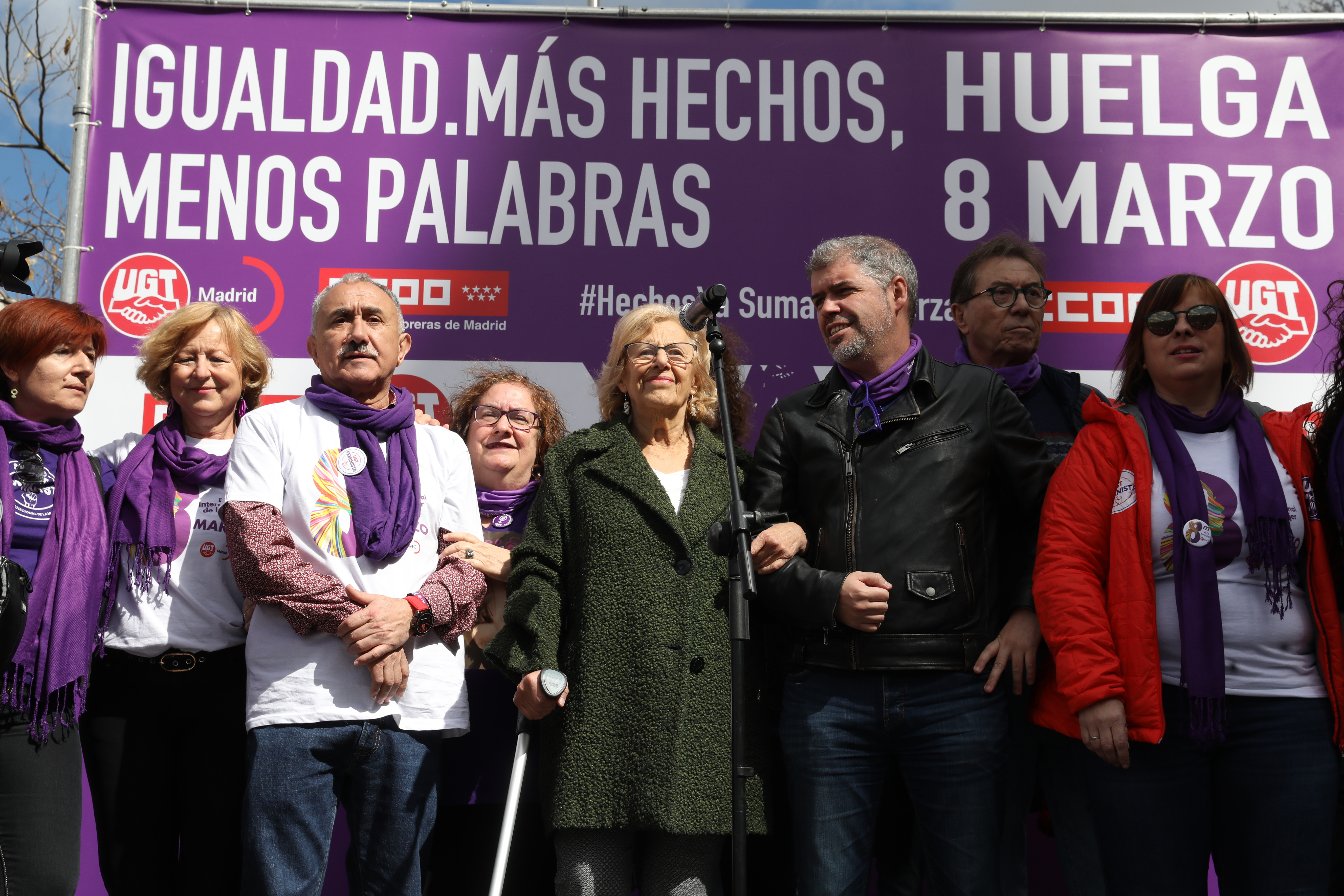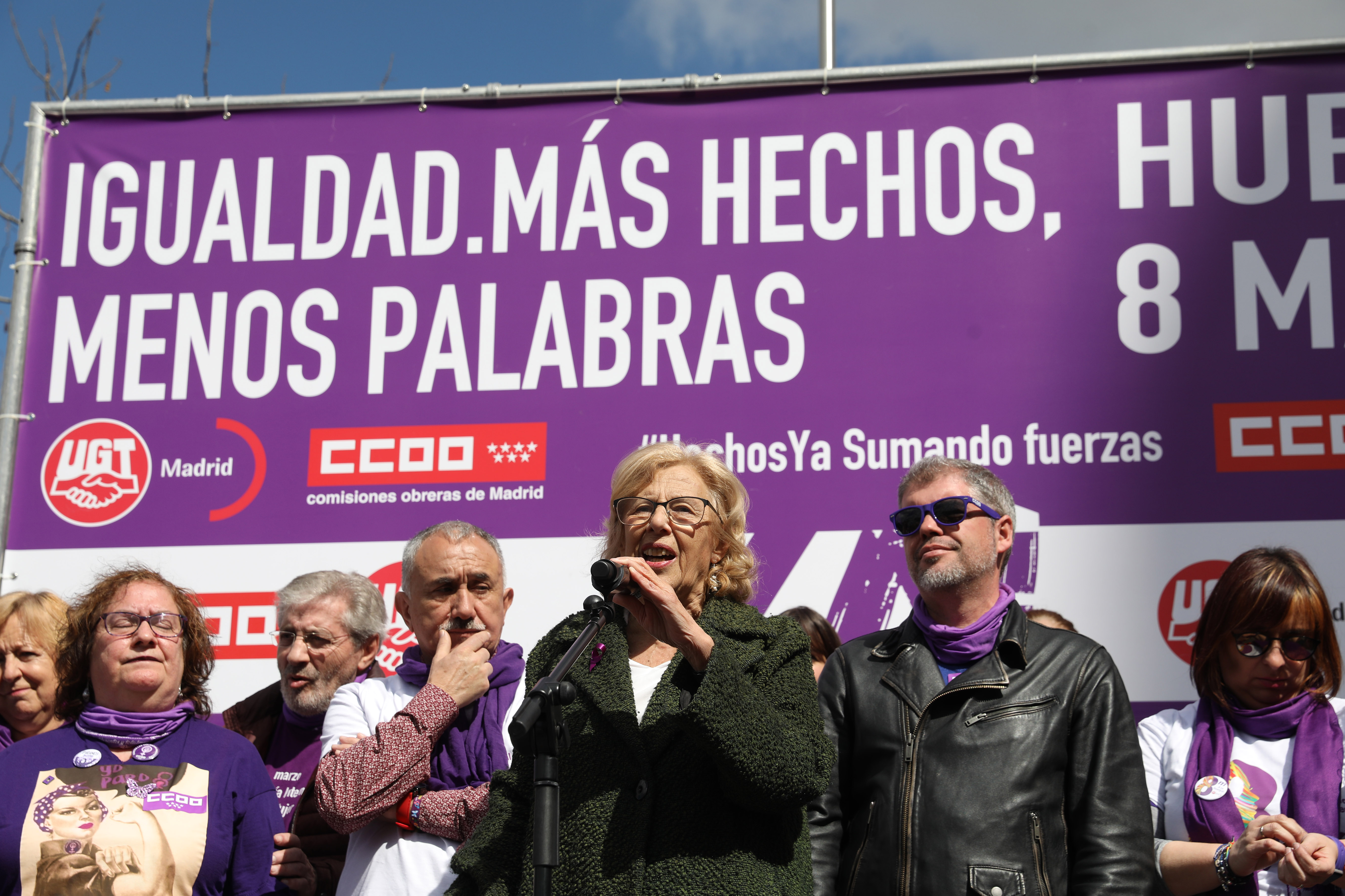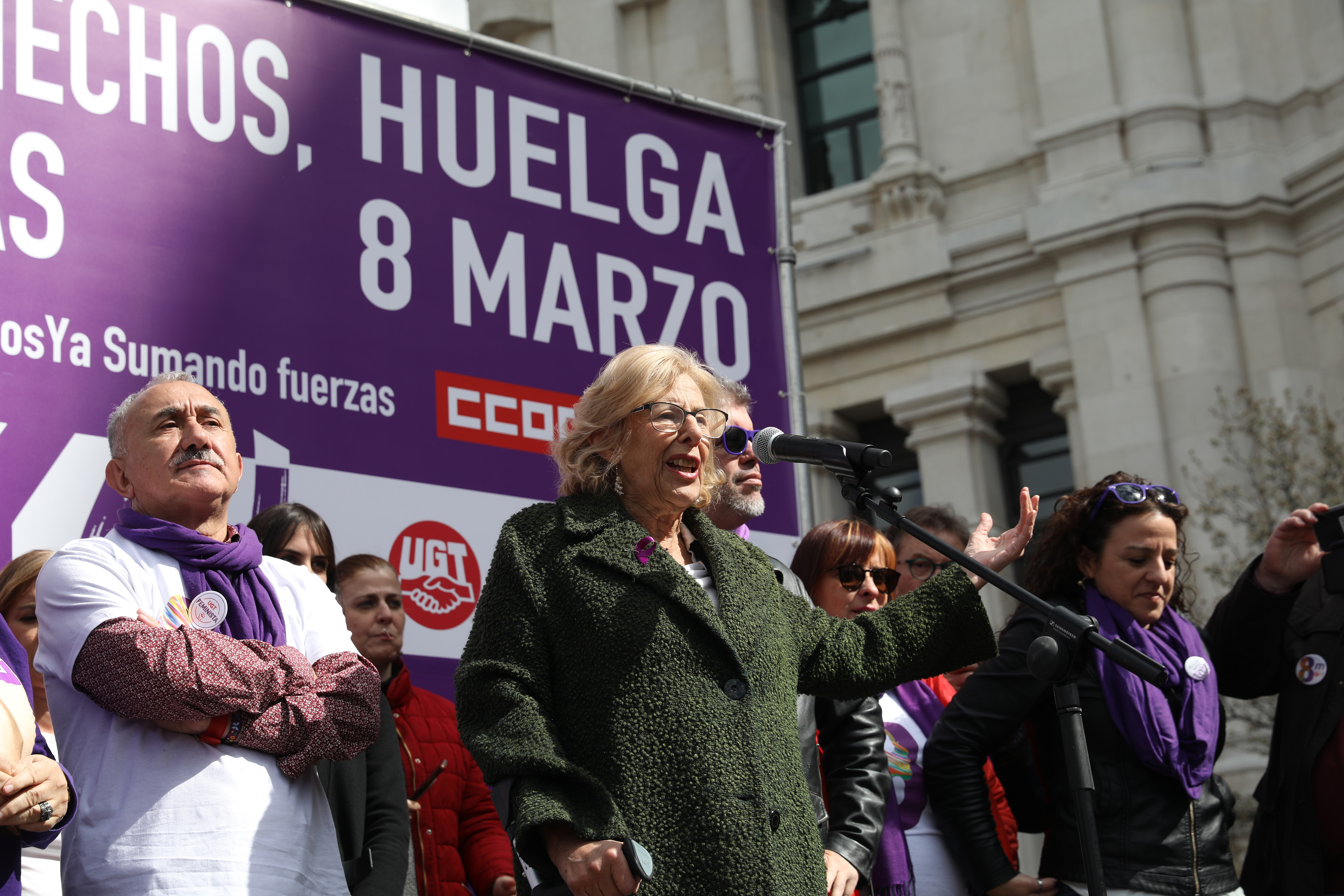 La alcaldesa de Madrid, Manuela Carmena, ha asistido hoy a la concentración que se ha desarrollado en la plaza de Cibeles organizada por los sindicatos mayoritarios para conmemorar el día de la Mujer.