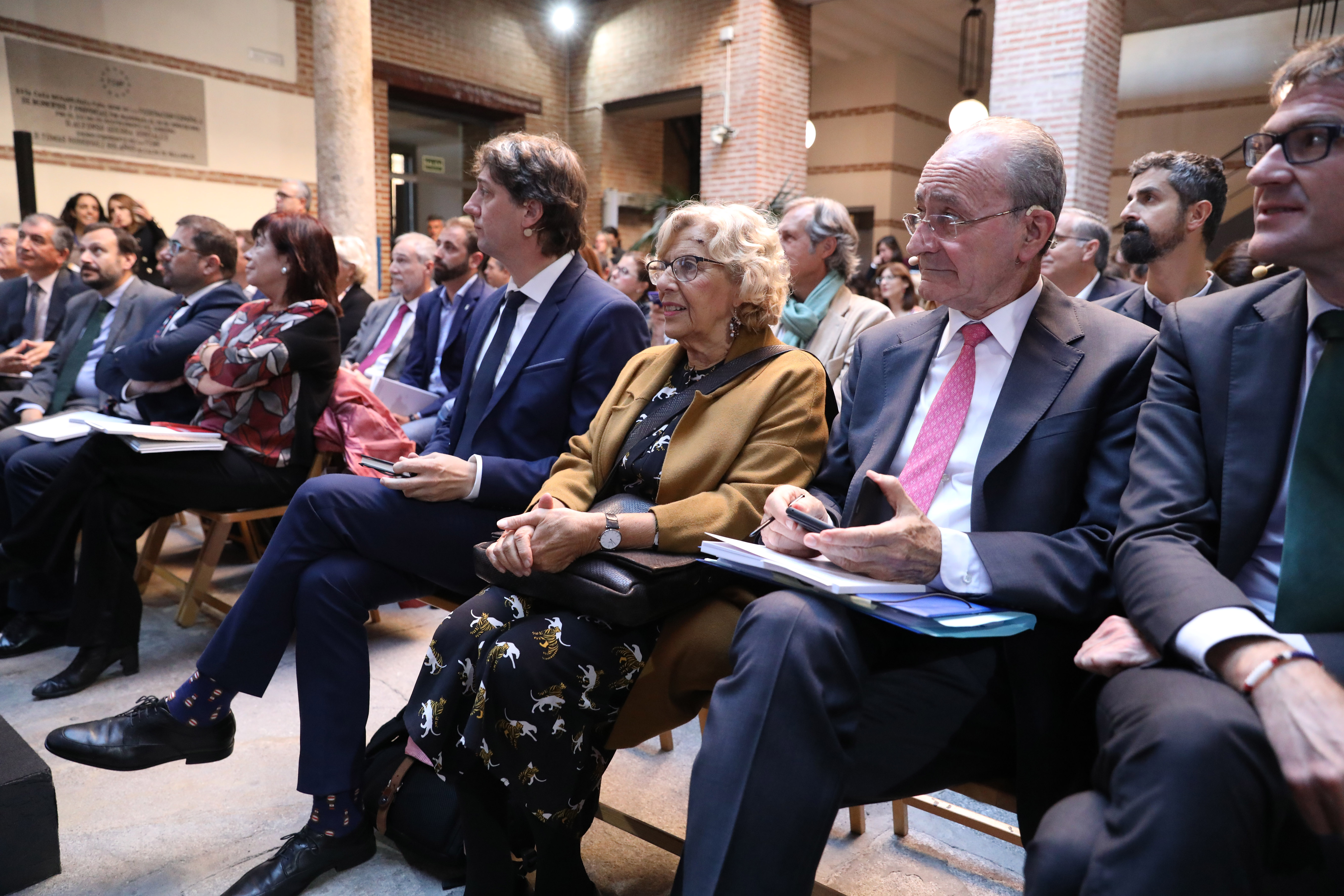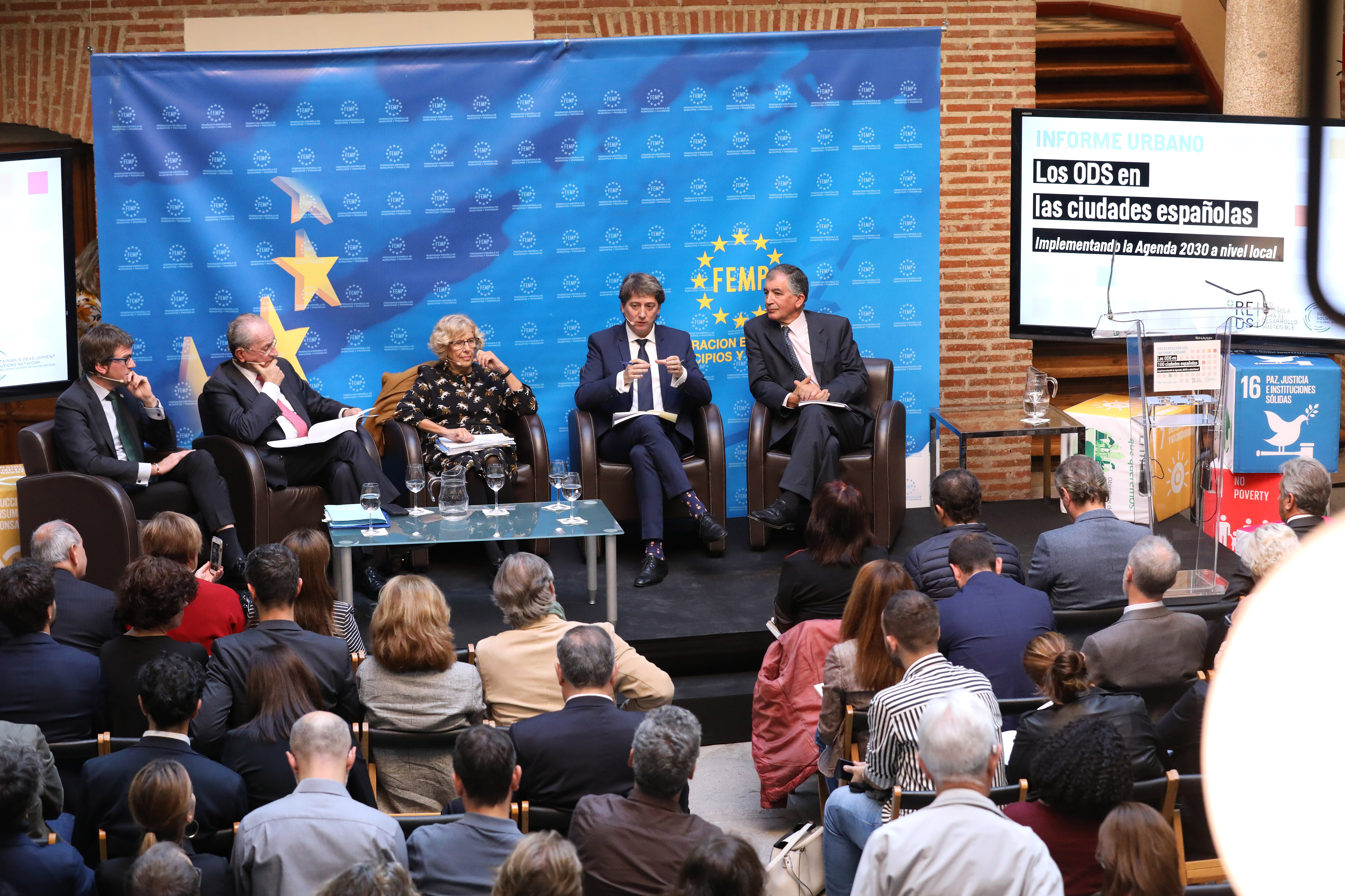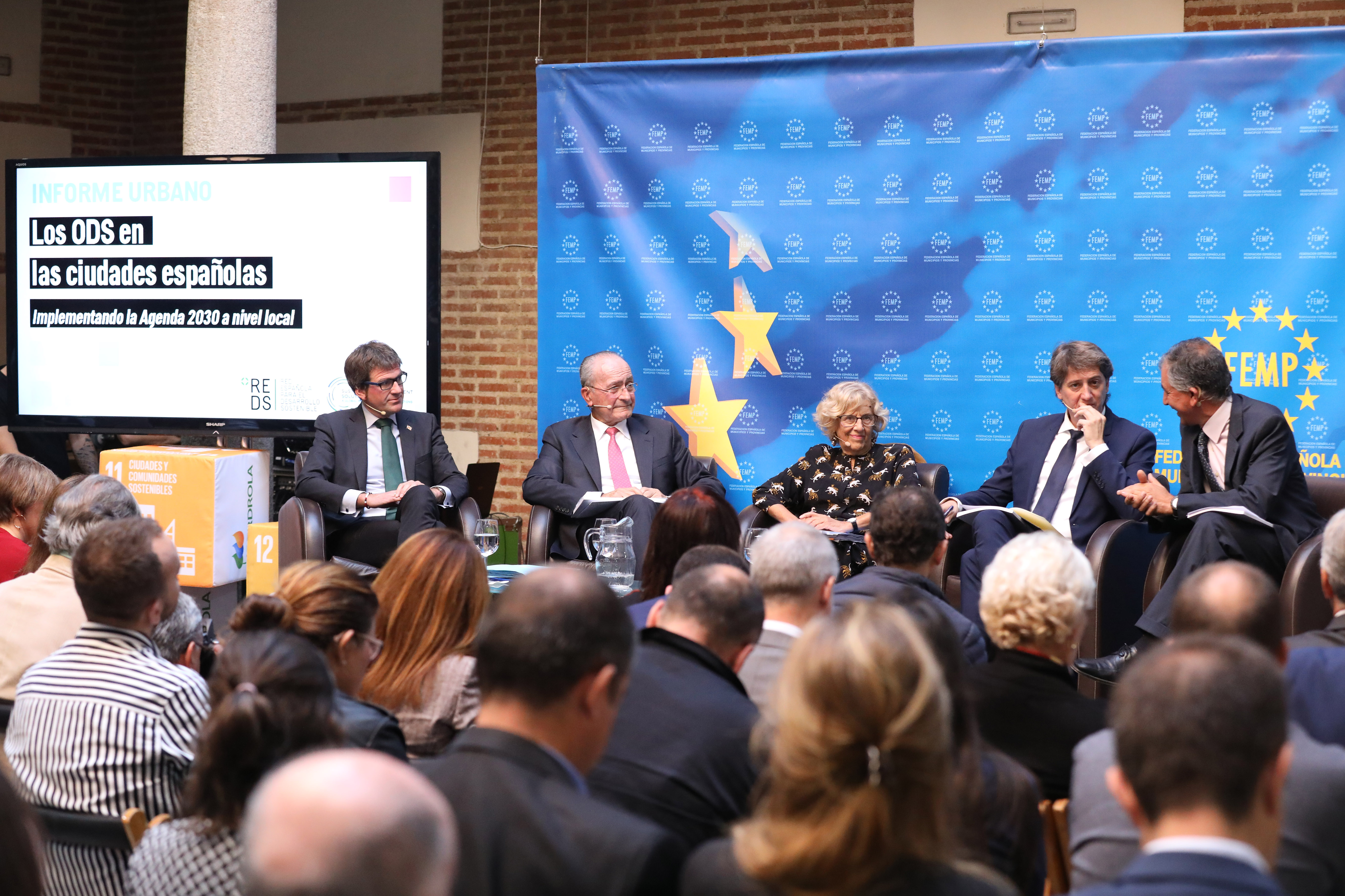- Junto al alcalde de Vitoria, Gorka Urtaran; el alcalde de Soria, Carlos Martínez Mínguez y el de Málaga, Francisco de la Torre, Carmena ha participado en el acto ‘Los ODS en 100 ciudades españolas’, organizado por la Red Española para el Desarrollo Sostenible, REDS