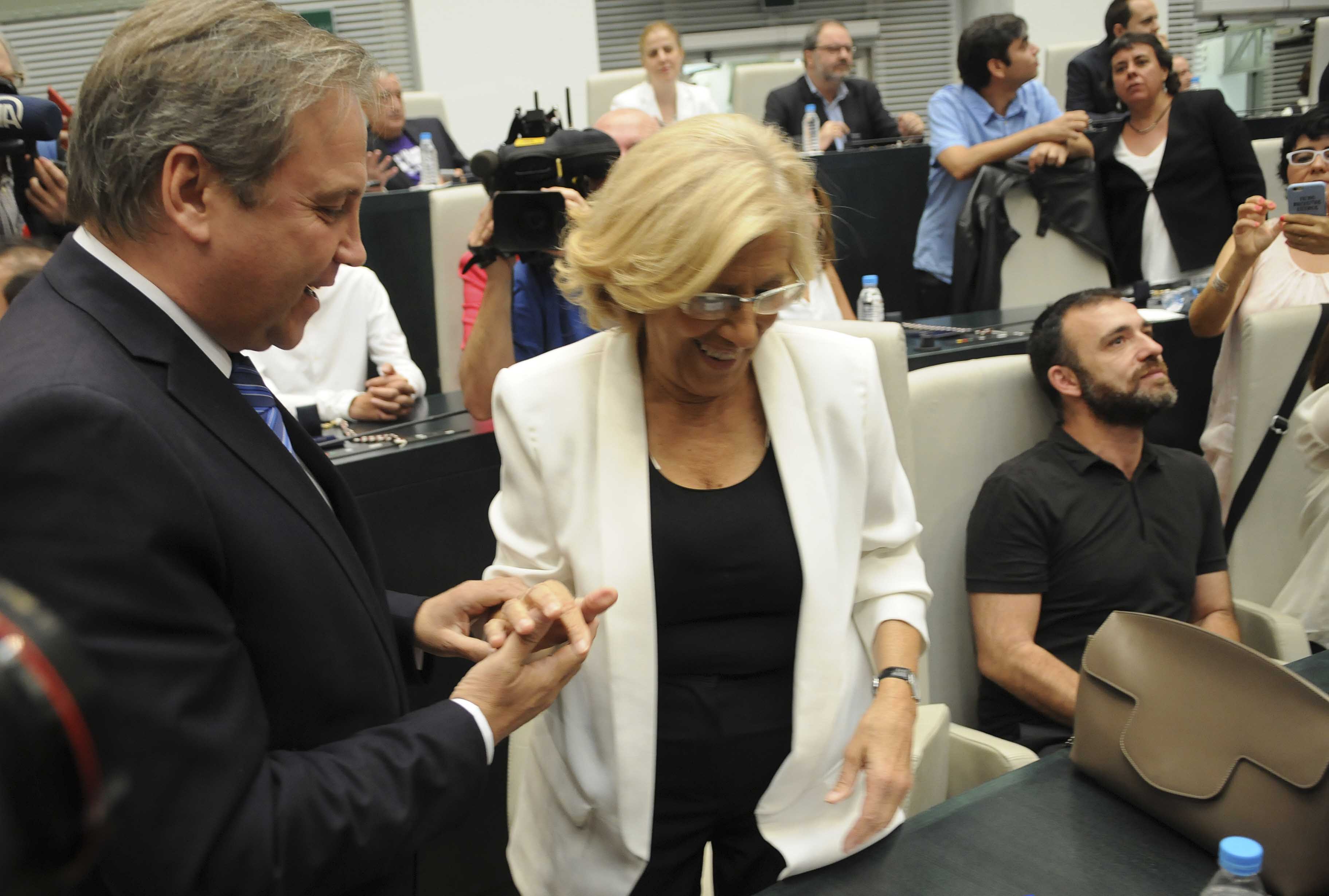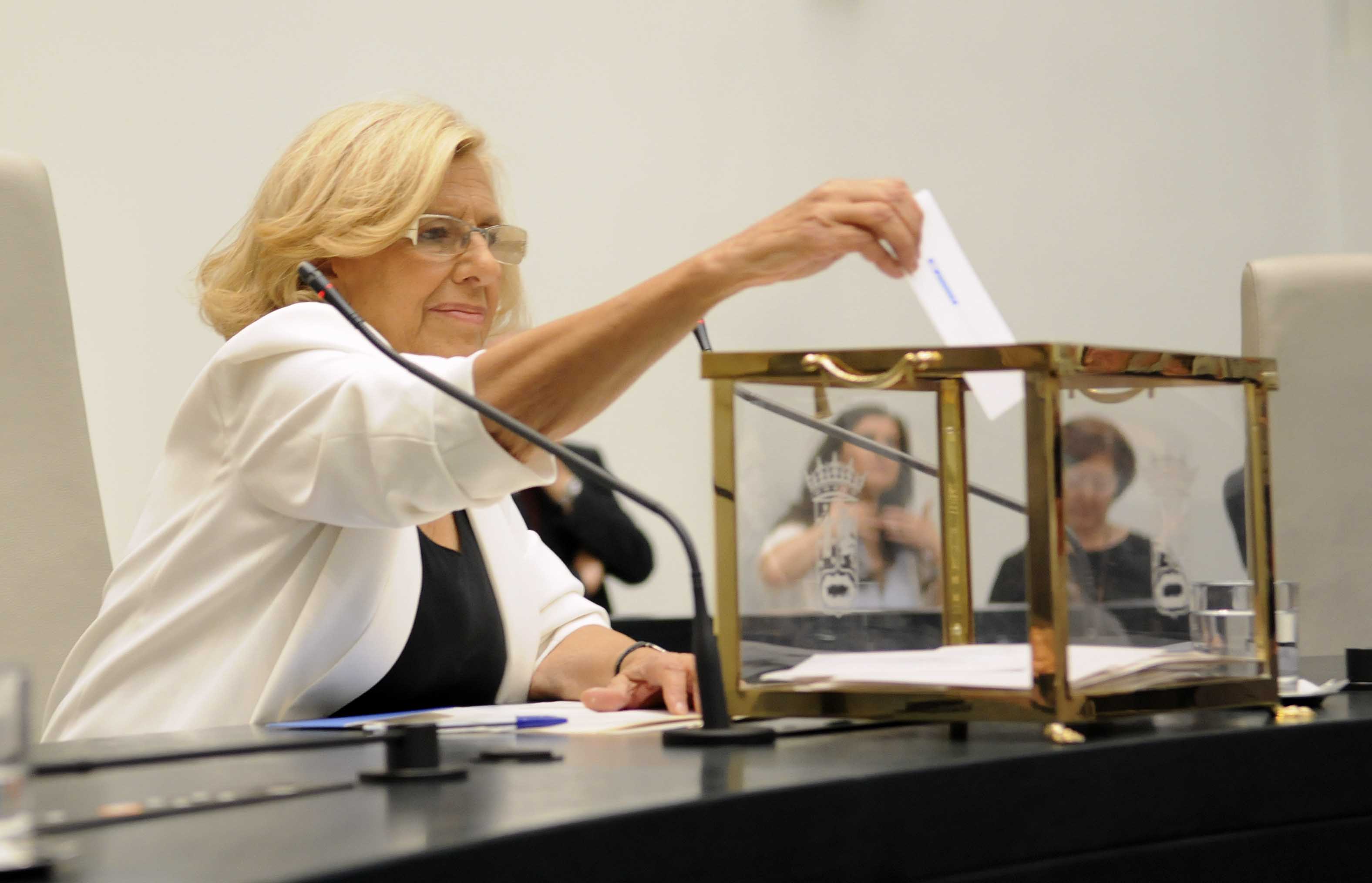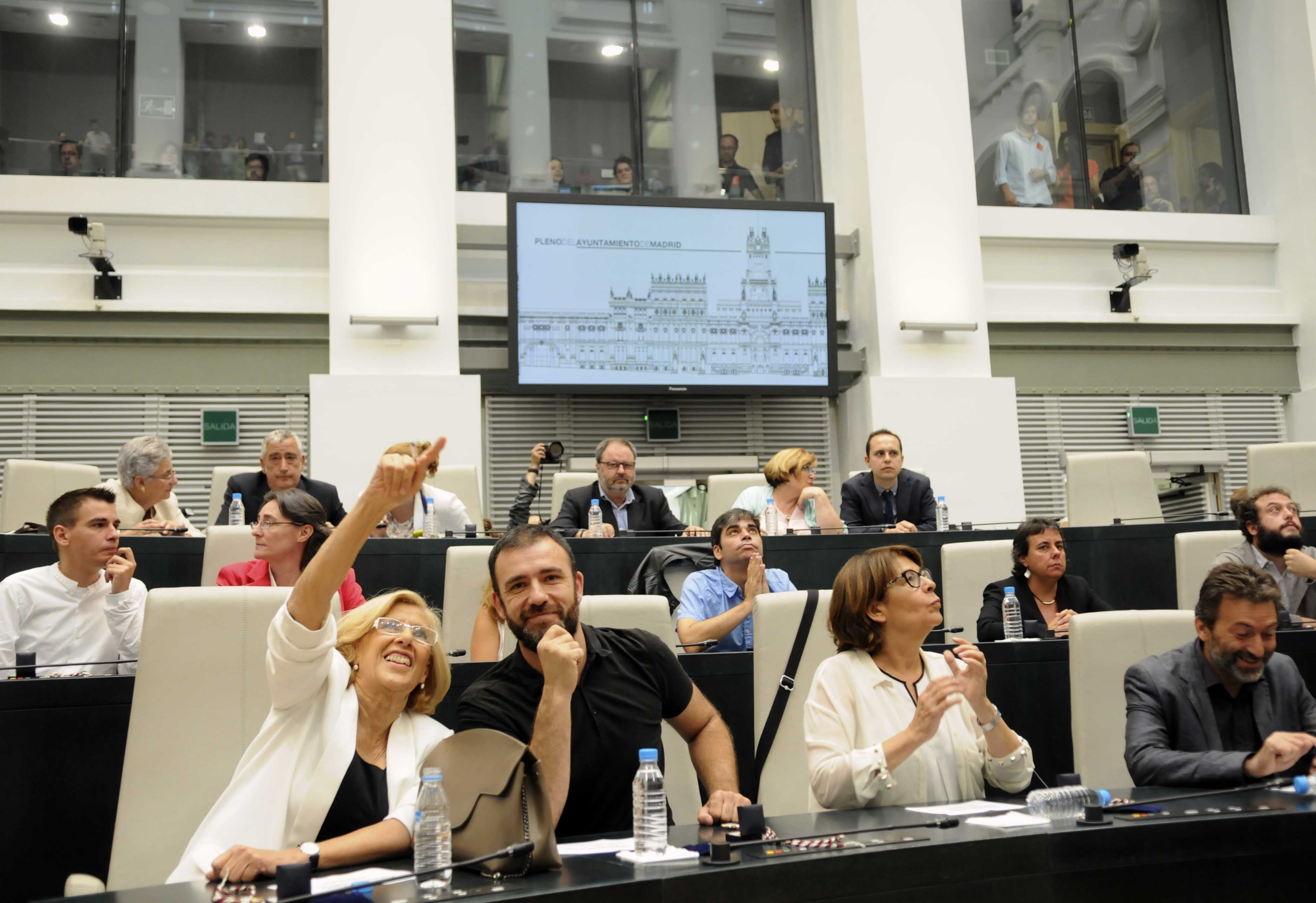 Manuela Carmena ha sido proclamada nueva alcaldesa de Madrid, con 29 votos, que representa la mayoría absoluta, en un Pleno que ha visto renovada gran parte de sus 57 concejales, con la entrada de dos nuevas formaciones políticas (Ahora Madrid y Ciudadanos) y las nuevas caras de los dos partidos tradicionales (PP y PSOE). Todos las portavocías de estas formaciones se han estrenado hoy en el salón de plenos: Esperanza Aguirre (PP), Rita Maestre(Ahora Madrid), Antonio Miguel Carmona (PSOE) y Begoña Villacís (Ciudadanos). Su elección supone un cambio histórico en el Ayuntamiento de Madrid gobernado en los últimos 24 años por el Partido Popular. El Pleno de investidura ha arrancado a las 11 horas con la constitución de la Mesa de Edad, a cargo de la edil electa de mayor edad, Manuela Carmena, y la más joven, Rita Maestre, ambas de Ahora Madrid. Carmena ha tomado la palabra y ha dado la bienvenida a “todos los ciudadanos de Madrid”. Los 57 ediles han jurado o prometido sus cargos, algunos de ellos por exigencia o imperativo legal. La anécdota la han protagonizado, Guillermo Zapata y Pablo Carmona (Ahora Madrid), que han prometido el cargo añadiendo la coletilla ‘omnia sunt communia’, que significa “todo es común” o “todo es de todos”. A continuación los concejales han ido depositando la papeleta con su voto. El recuento ha dado 29 votos para Manuela Carmena, 20 de su formación, Ahora Madrid, y nueve del PSOE. La popular Esperanza Aguirre ha conseguido 21 votos, Begoña Villacís 7, y Antonio Miguel Carmona 0.