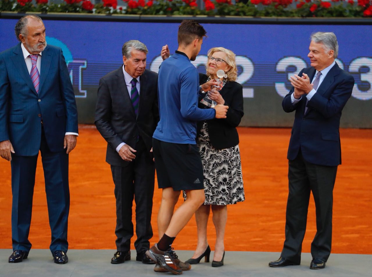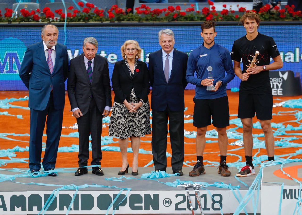 La alcaldesa de Madrid, Manuela Carmena, ha entregado esta tarde en la Caja Mágica el trofeo del Mutua Madrid Open al subcampeón del torneo de este año, Dominic Thiem, que ha sido derrotado por Alexander Zverev, tras una gran final. El tenista alemán ha conseguido derrotar a su rival austriaco en una hora y 18 minutos de partido. Por su parte, el empresario y ex tenista Ion Tiriac ha hecho entrega del trofeo al tenista ganador, Alexander Zverev.
