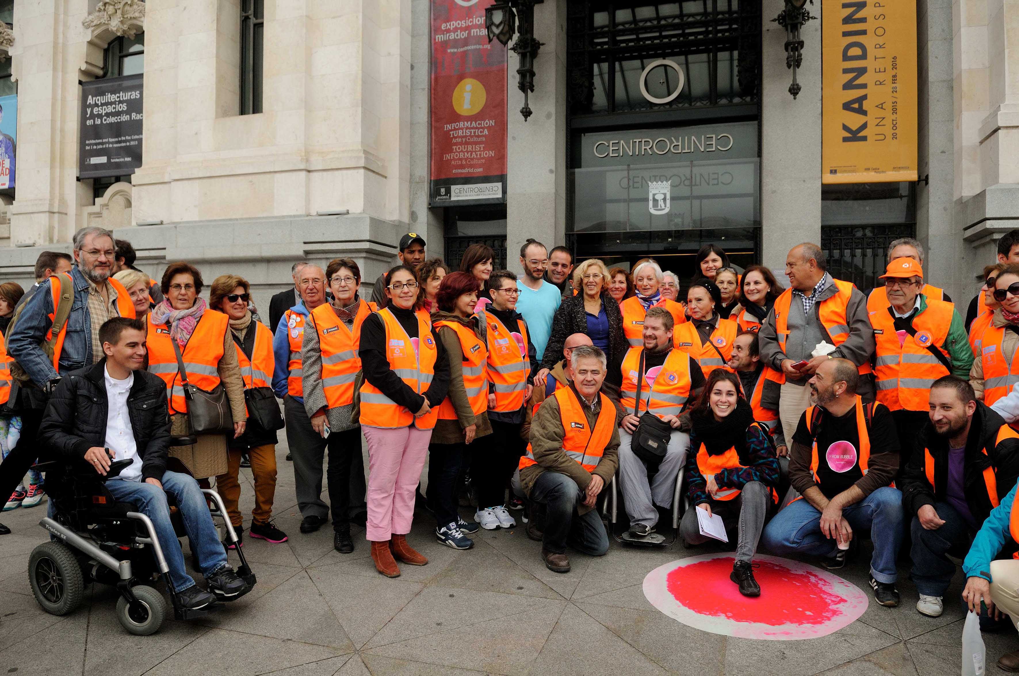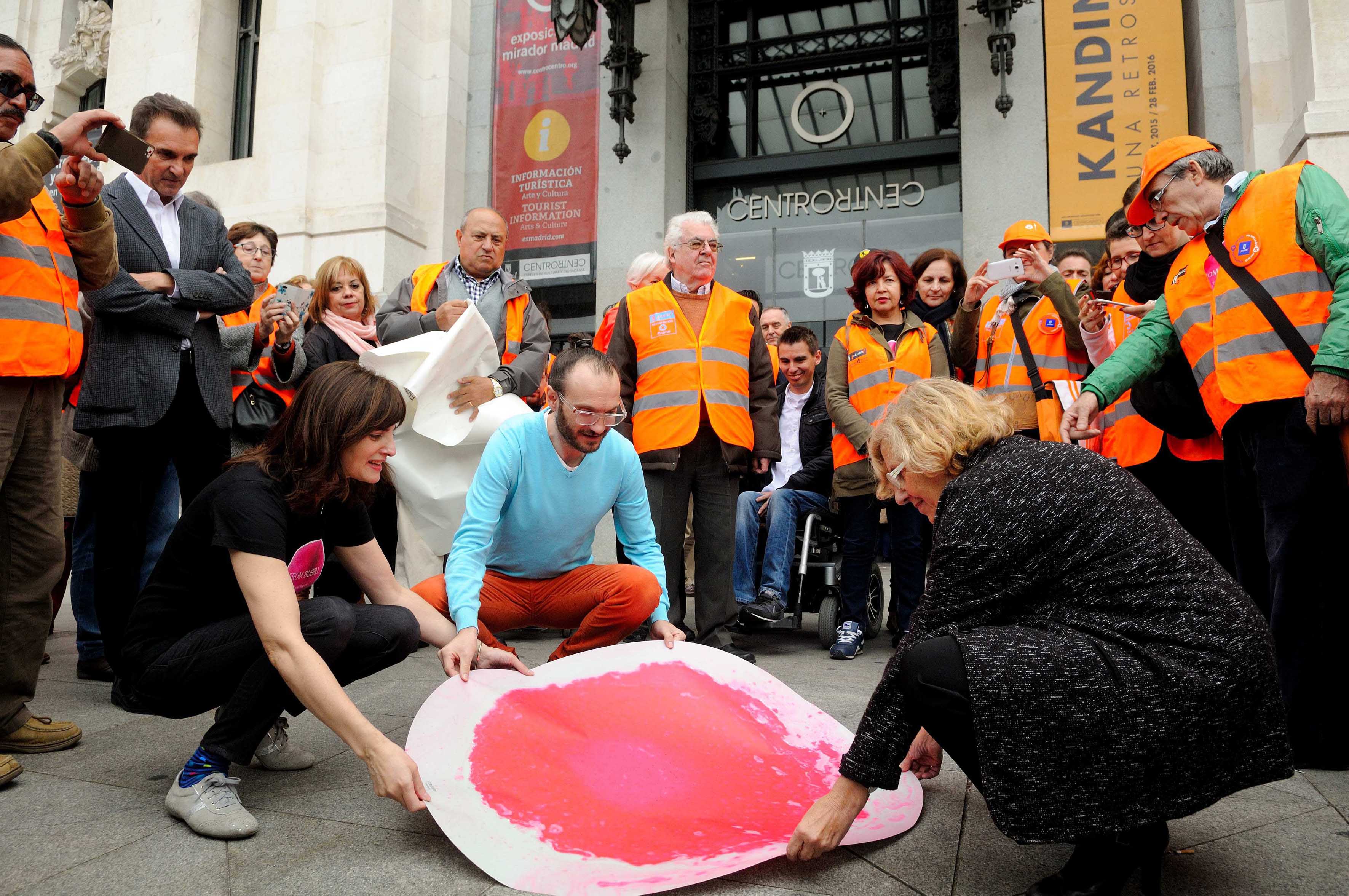 Manuela Carmena en la pegada de la primera burbuja del proyecto artístico "From Bubble" que reflexiona sobre la enfermedad del Alzheimer y cómo es la vida de las personas que la padecen.
