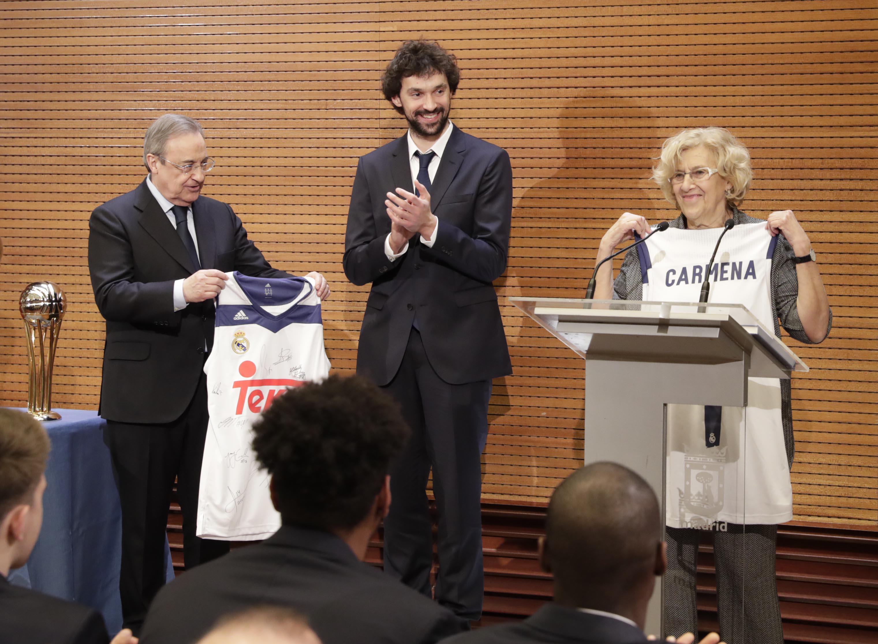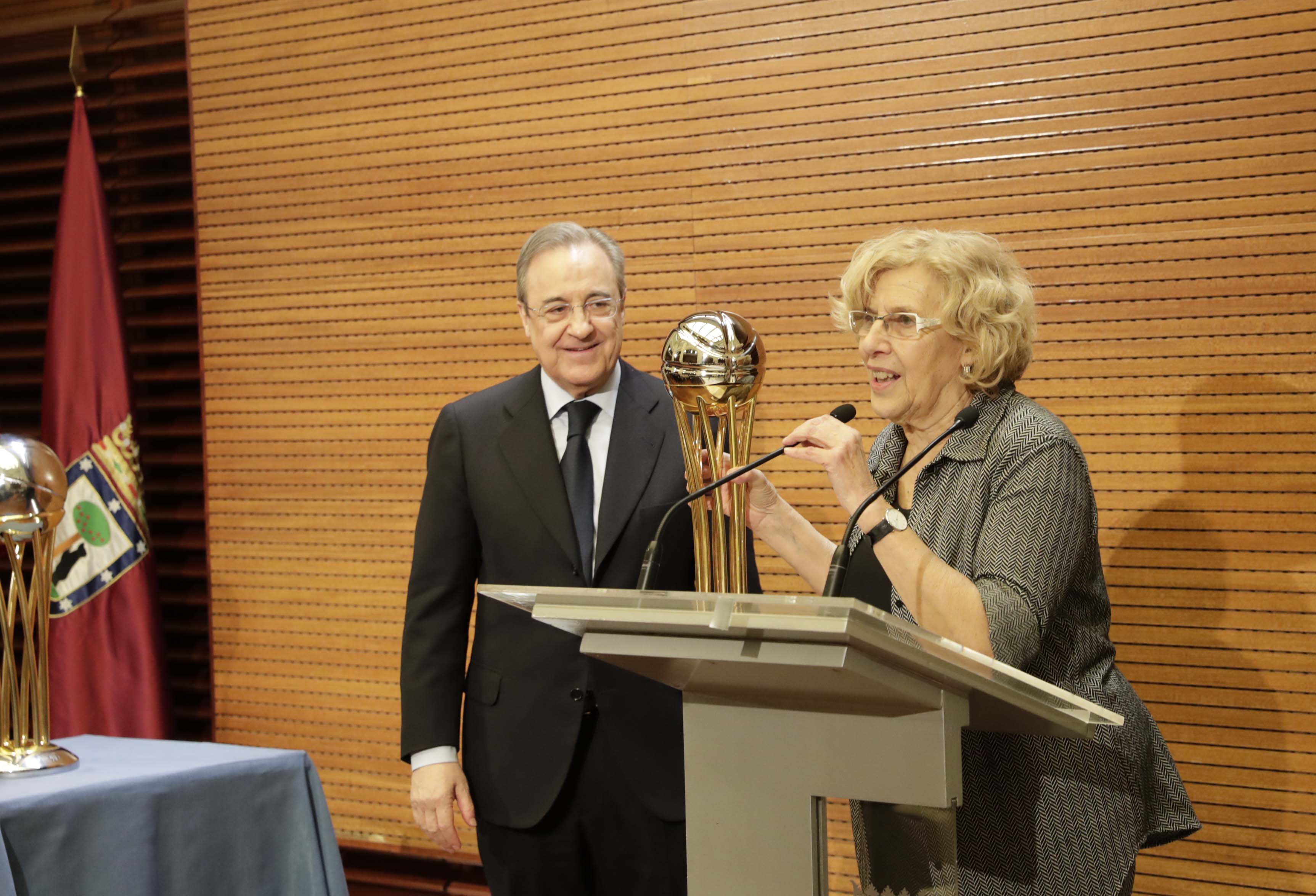 Por su parte, el presidente del Club, Florentino Pérez, ha agradecido a la alcaldesa el poder compartir este momento de felicidad en la casa de todos los madrileños señalando: “como sabes nuestro club tiene una vocación universal, sus dueños son sus socios y todos los que comparten nuestras emociones y nuestros valores. Nosotros nunca olvidamos cual es nuestro origen. Madrid es nuestro punto de partida hacia el mundo, por eso cuando conseguimos un nuevo título, como esta fabulosa Copa del Rey de Baloncesto, venimos a nuestra casa, para compartirlo con todos los madrileños”.