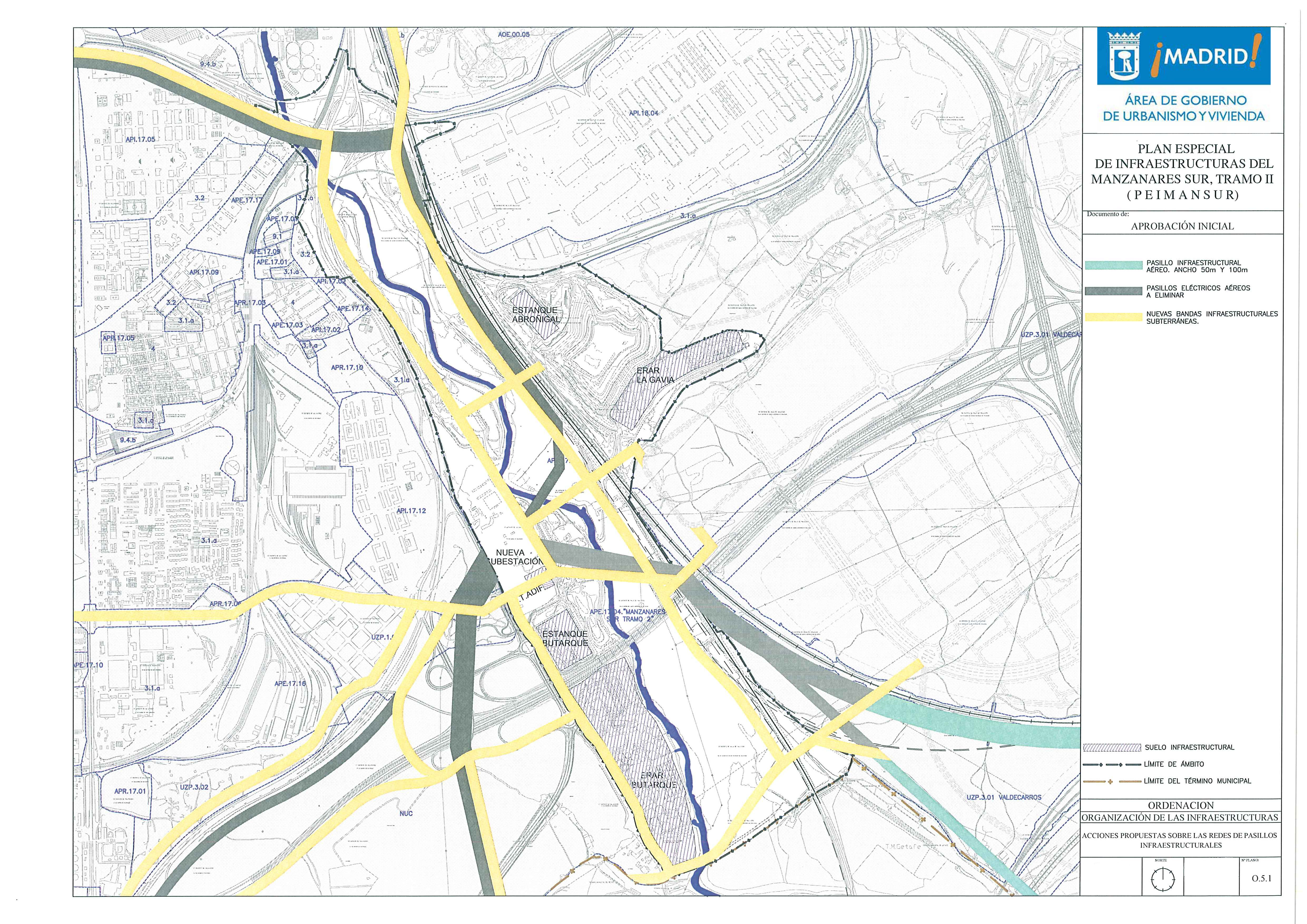 El Plan Especial establece dónde y cómo deberán situarse las infraestructuras existentes o proyectadas sobre el ámbito: las energéticas, de transporte, hidráulicas y las de carácter medioambiental. Todos los servicios discurrirán, siempre que sea posible, en el interior de galerías visitables, de "corredores infraestructurales" a lo largo de ambas márgenes del río que albergarán entre 12 y 20 metros de anchura las líneas de alta tensión y el resto de las canalizaciones de servicio. En superficie acogerán las vías pecuarias cuyo desvío sea necesario realizar, y servirán como paseos peatonales y carril bici.