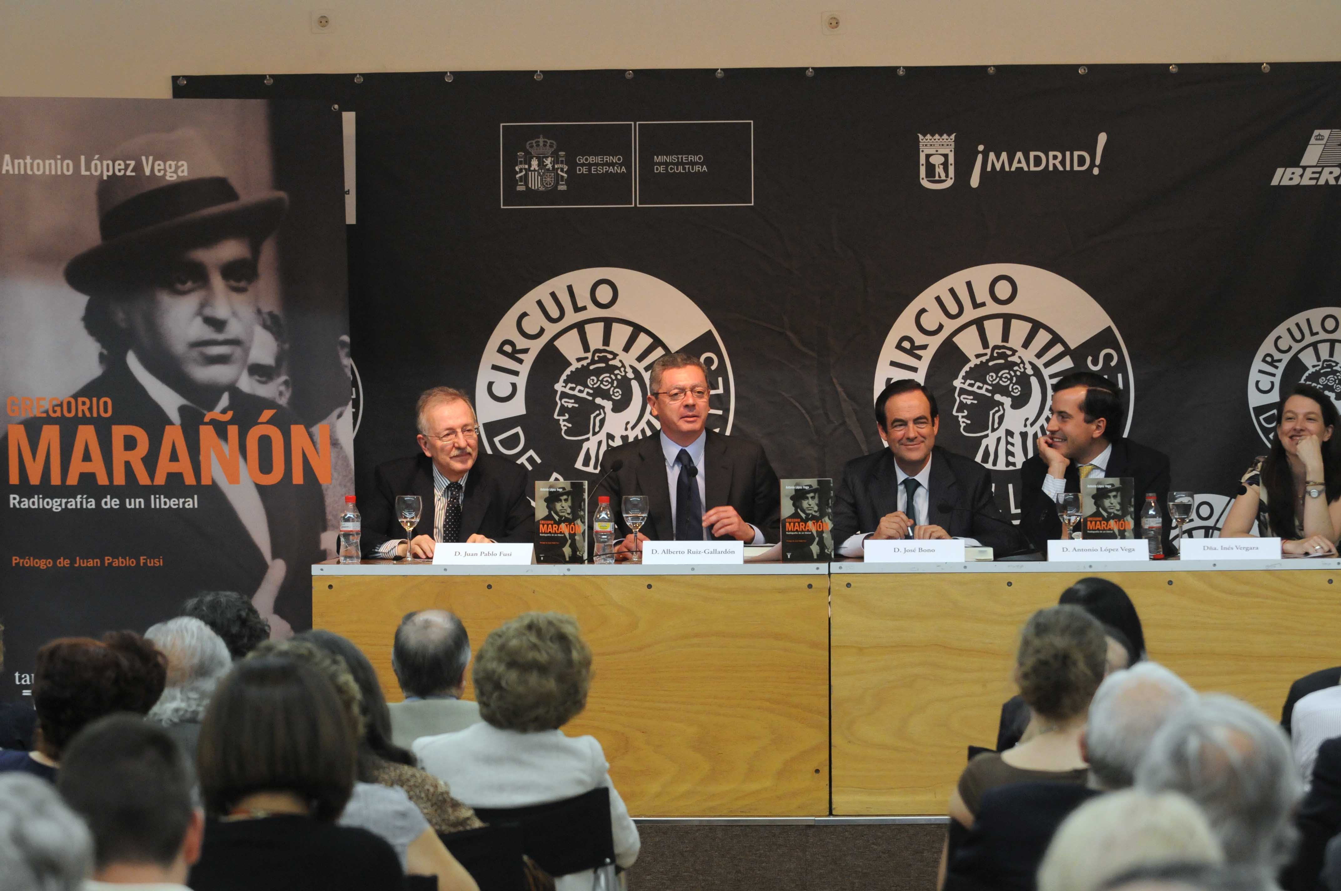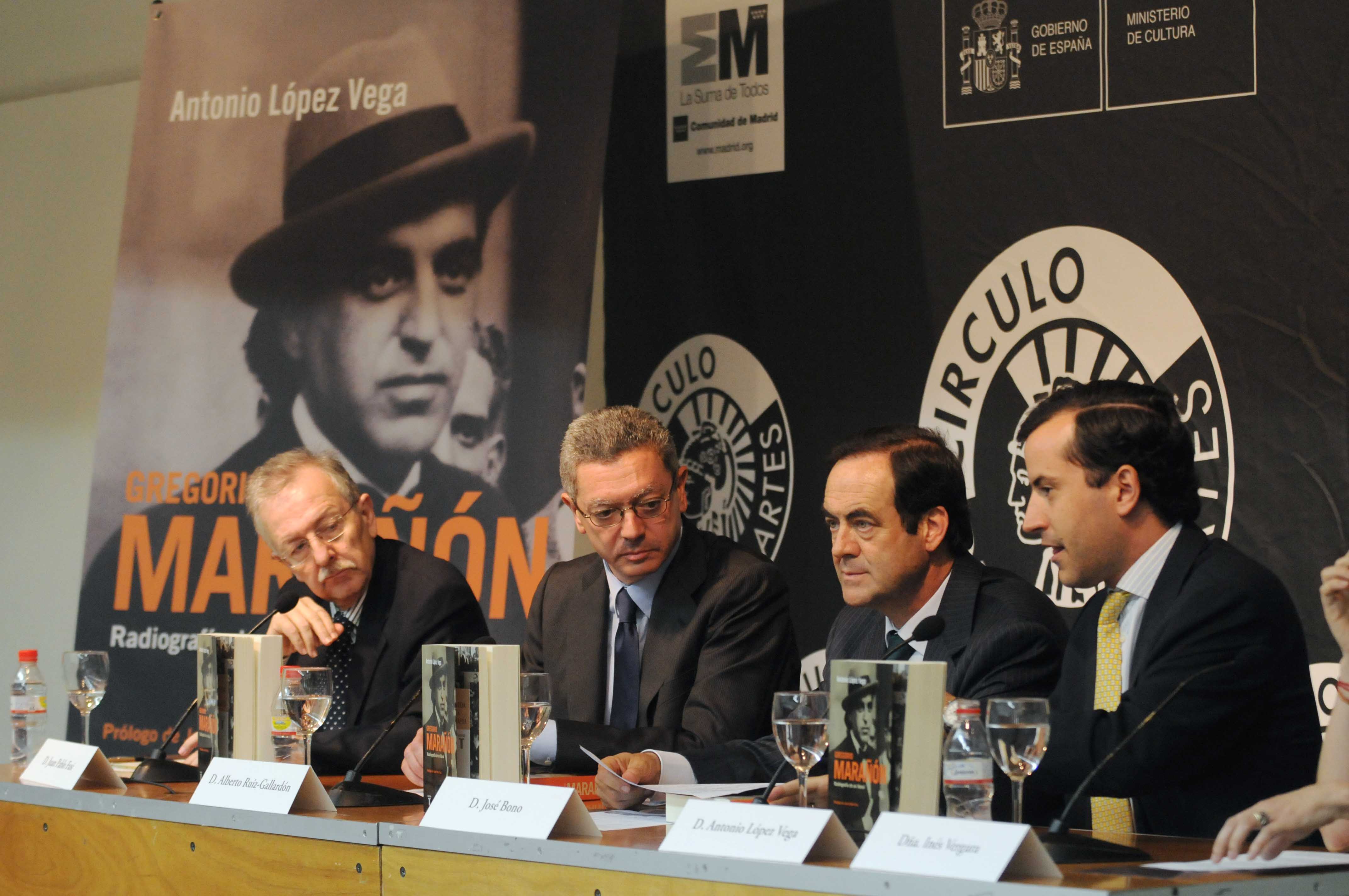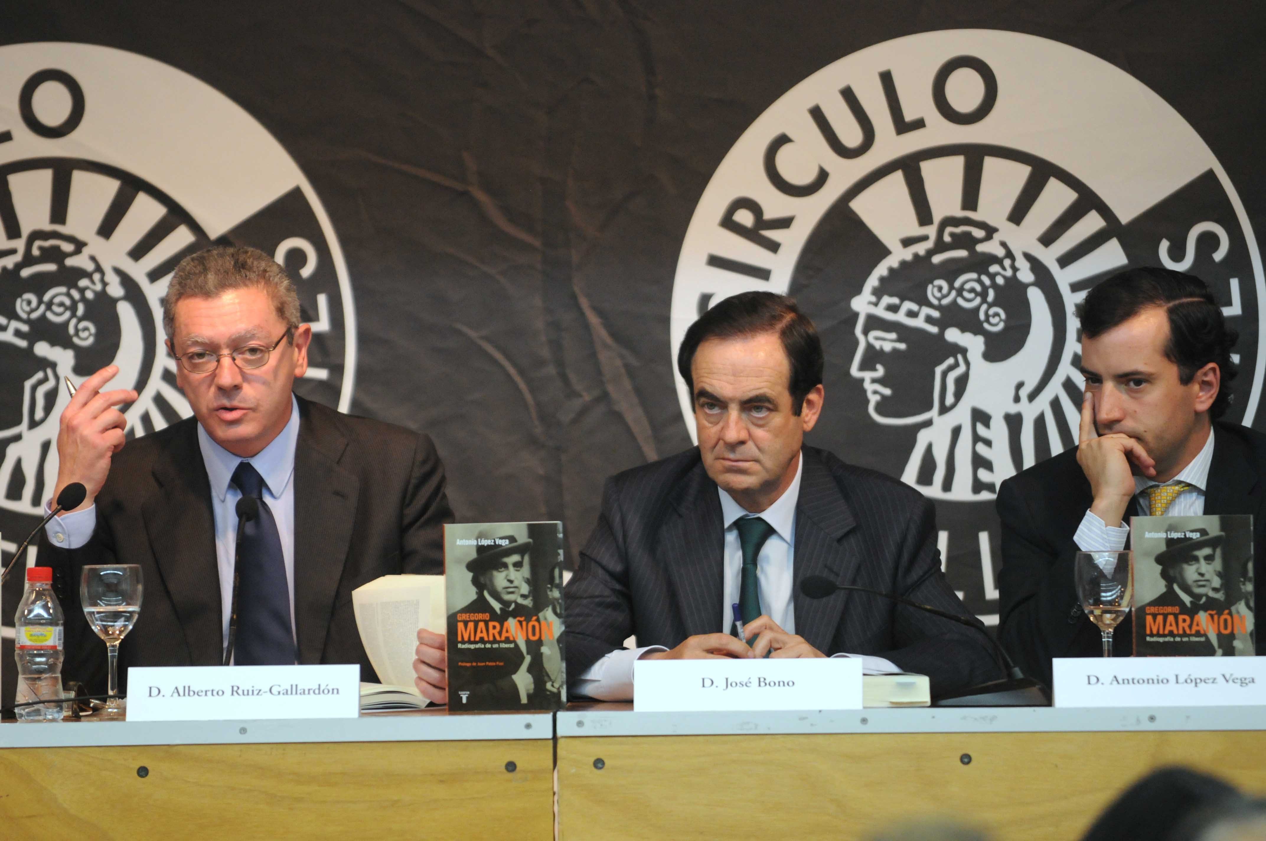 El alcalde de Madrid, Alberto Ruiz-Gallardón, y el presidente del Congreso de los Diputados, José Bono, han presentado hoy en el Círculo de Bellas Artes el libro sobre Gregorio Marañón Radiografía de un liberal, del historiador Antonio López Vega. La obra es una investigación sobre un humanista e intelectual y una reflexión sobre el liberalismo.