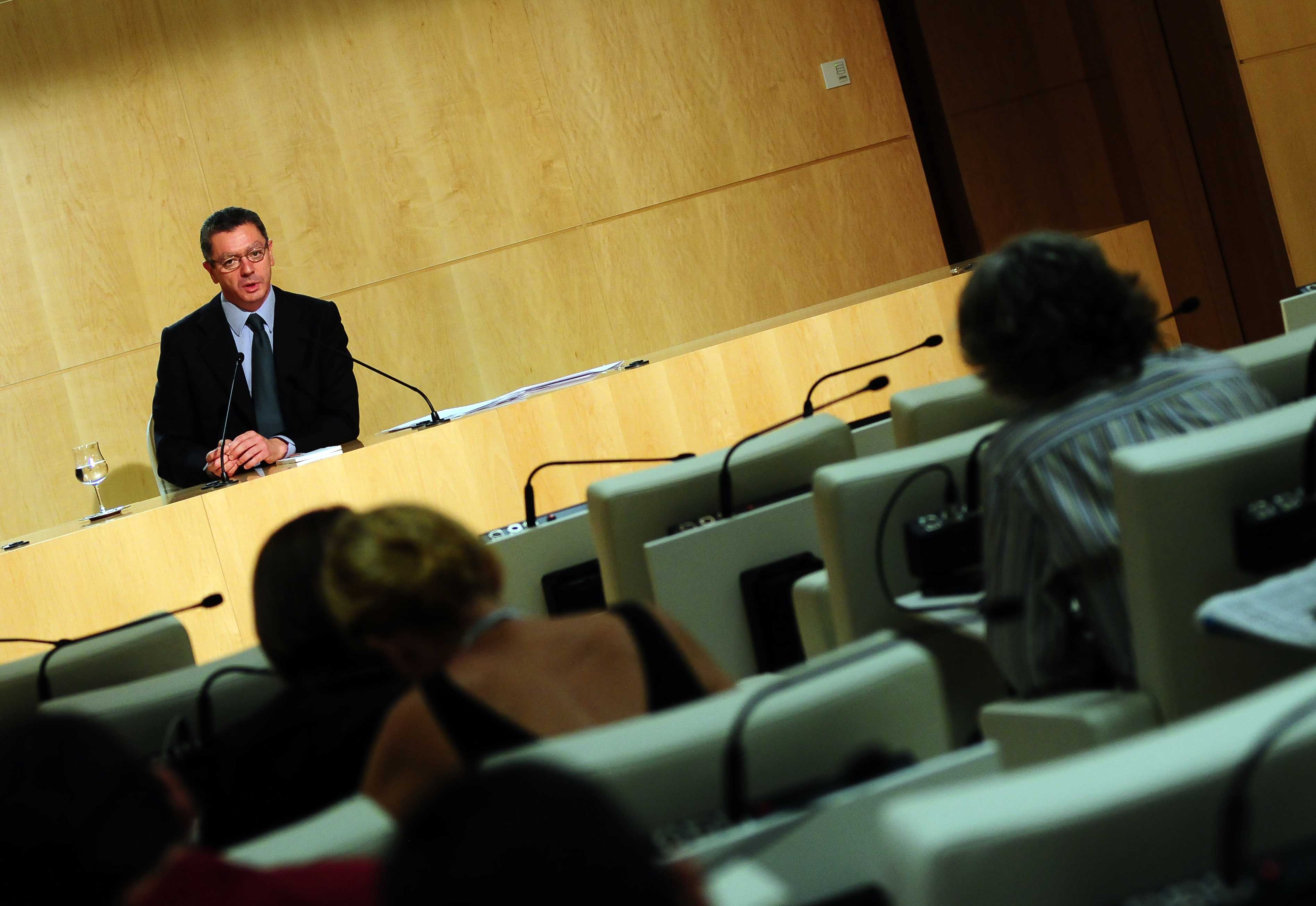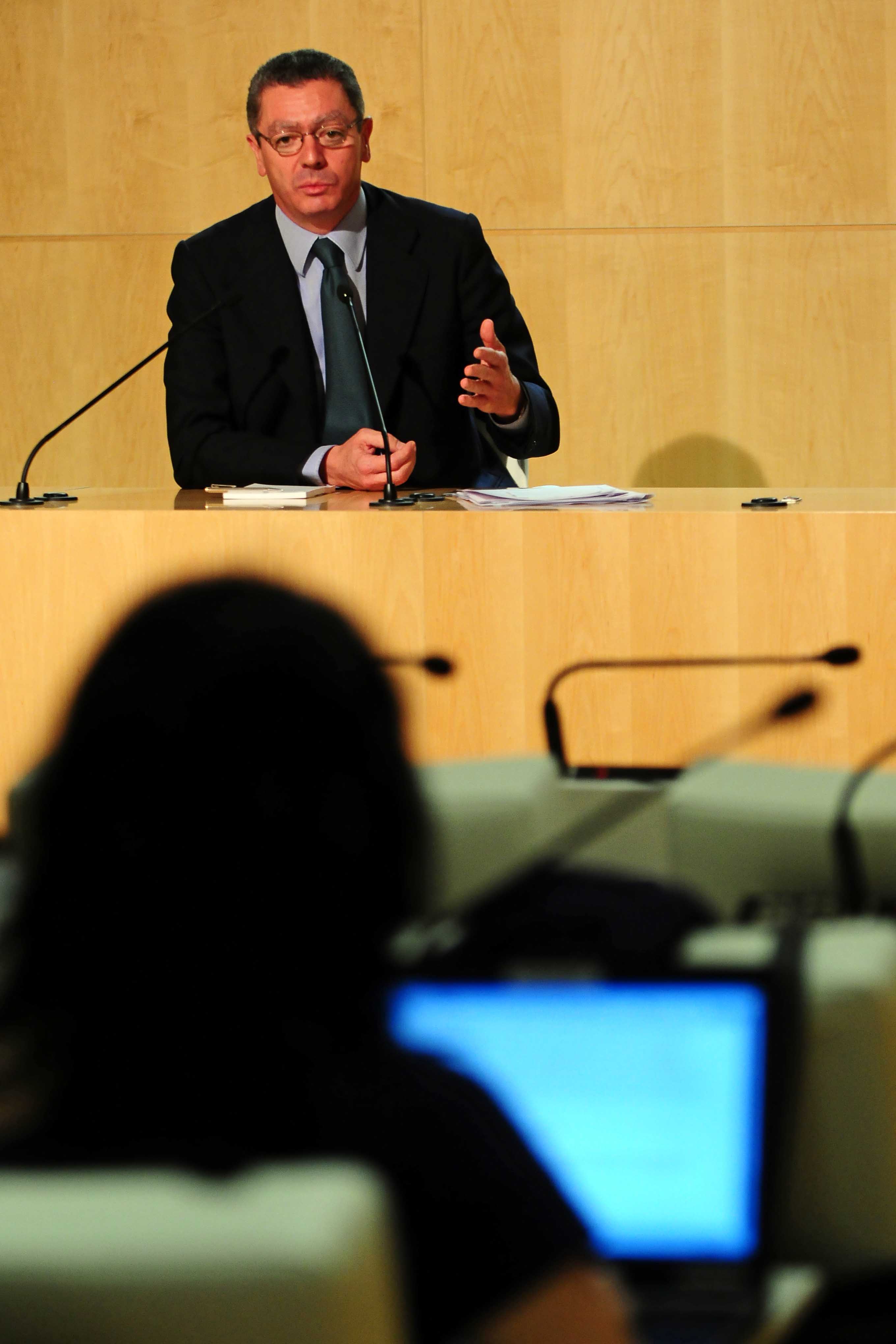 Dos imágenes del alcalde de la Ciudad, Alberto Ruiz-Gallardón, durante la rueda de prensa que ha ofrecido tras la Junta de Gobierno, donde ha explicado el proyecto para peatonalizar dos nuevas calles.